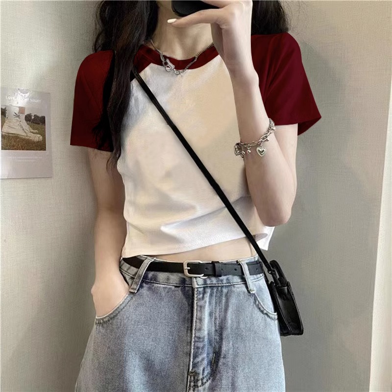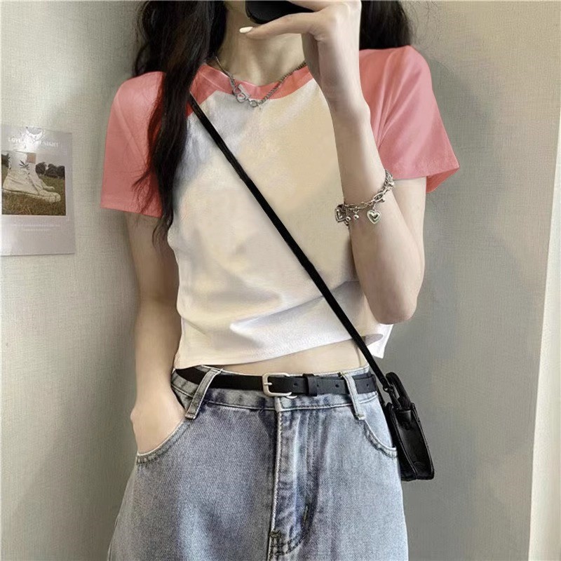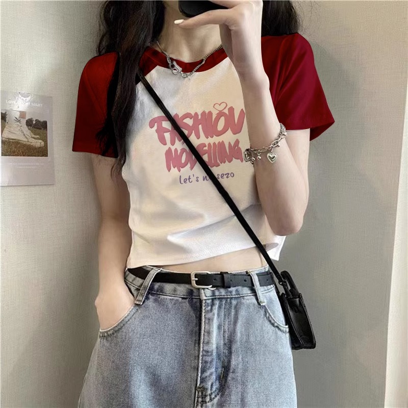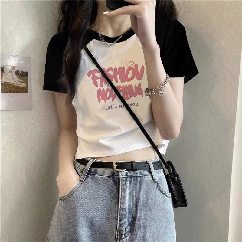 撞色拼接字母印花T恤女夏季設計感短款百搭bm甜酷小個子短袖上衣
