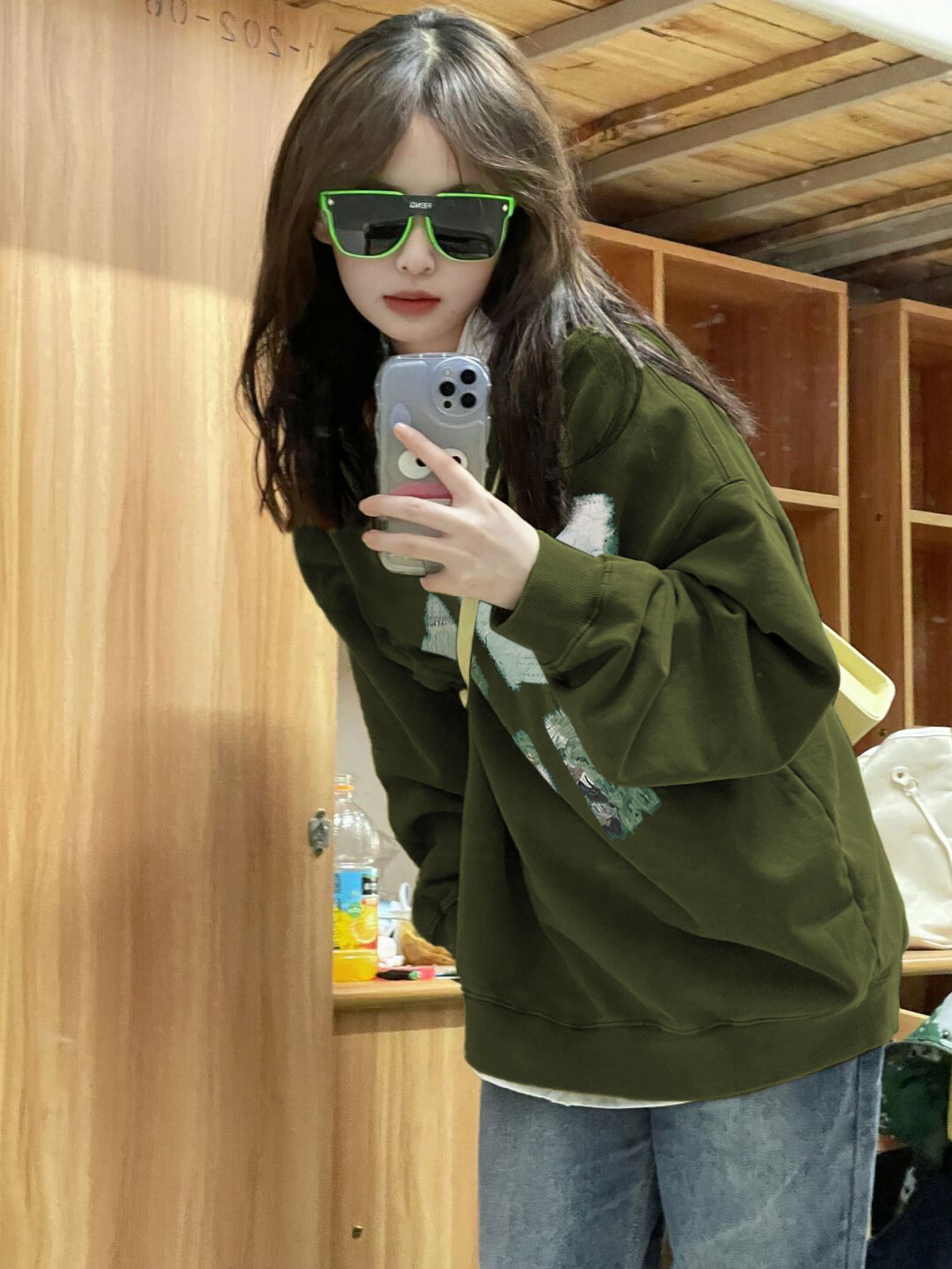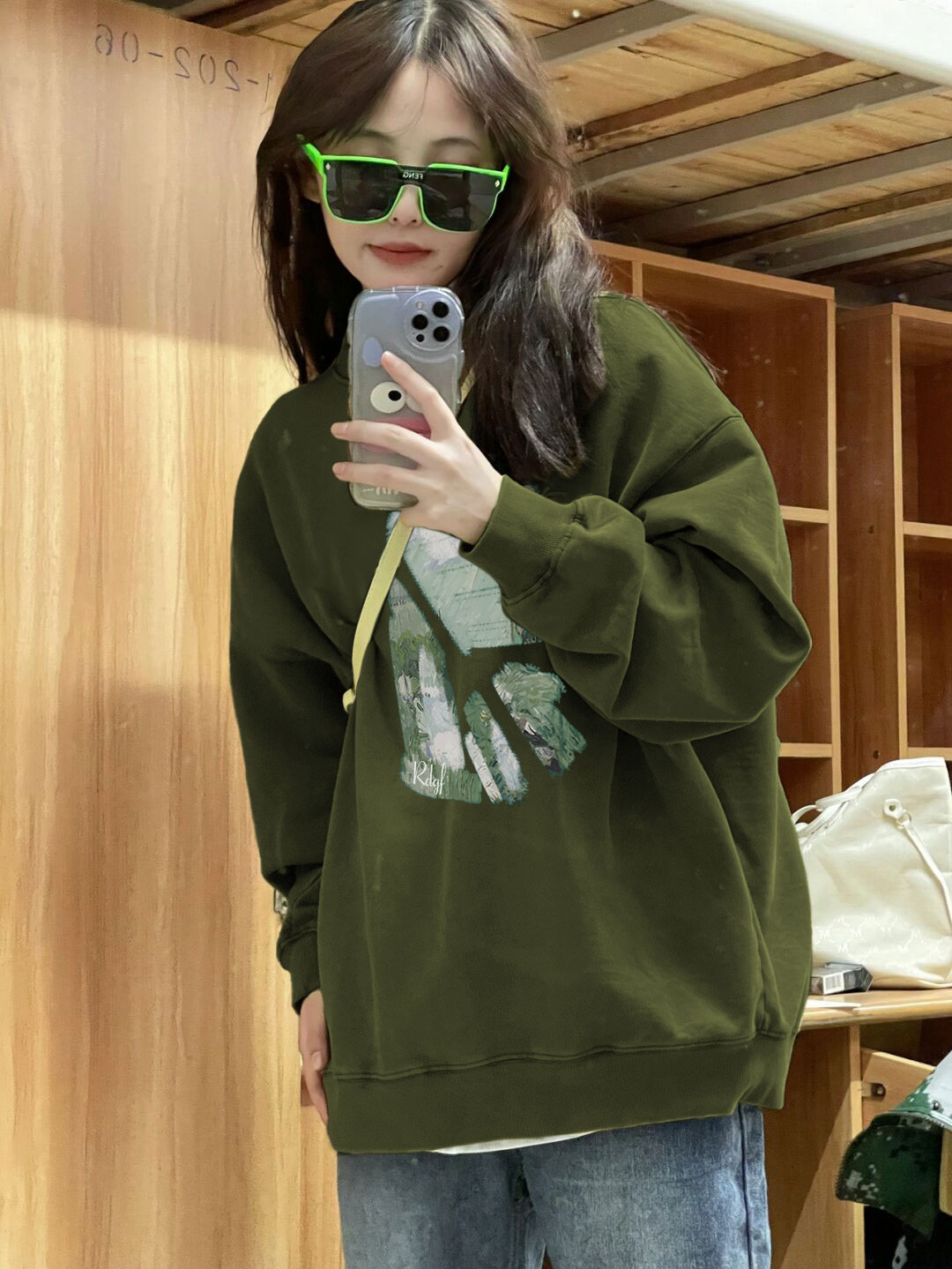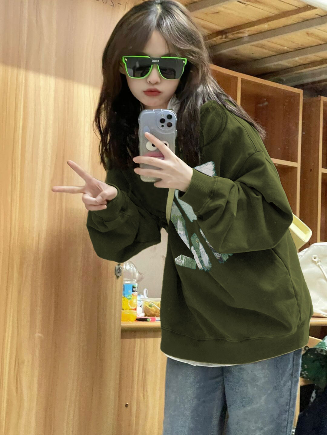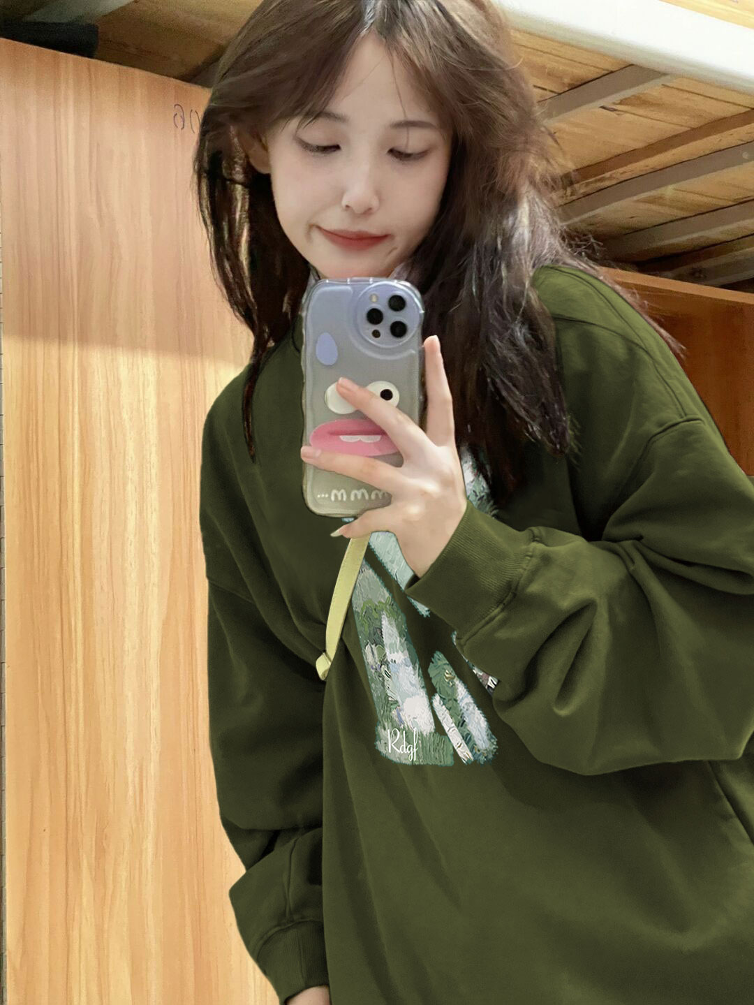 綠色潮牌小眾無帽圓領厚棉T女2023新款爆款早春秋冬季加絨長袖上衣