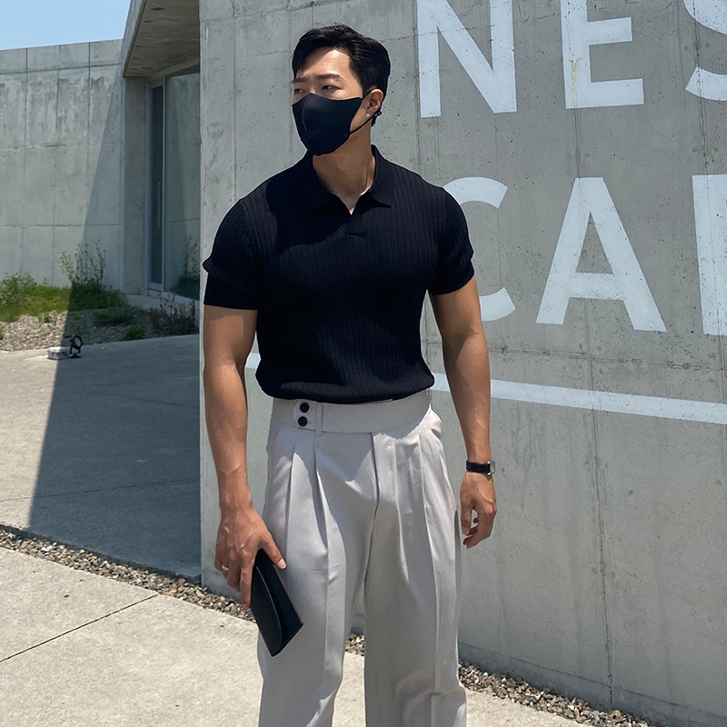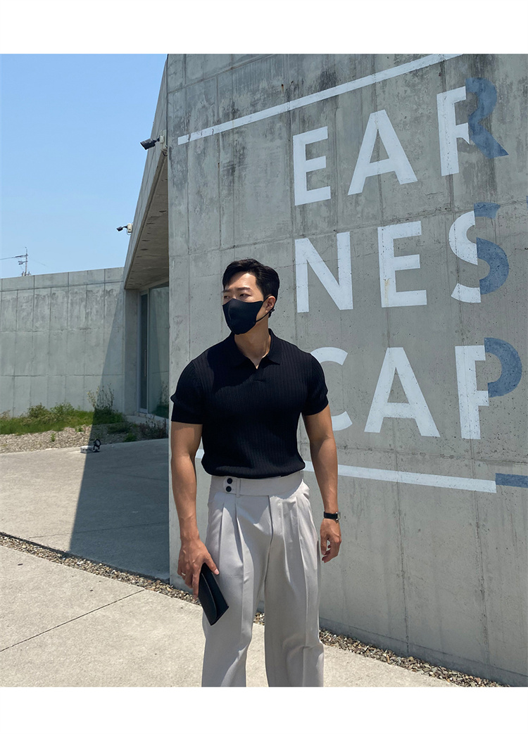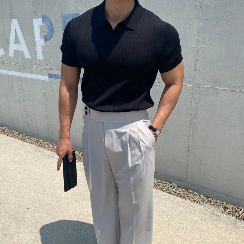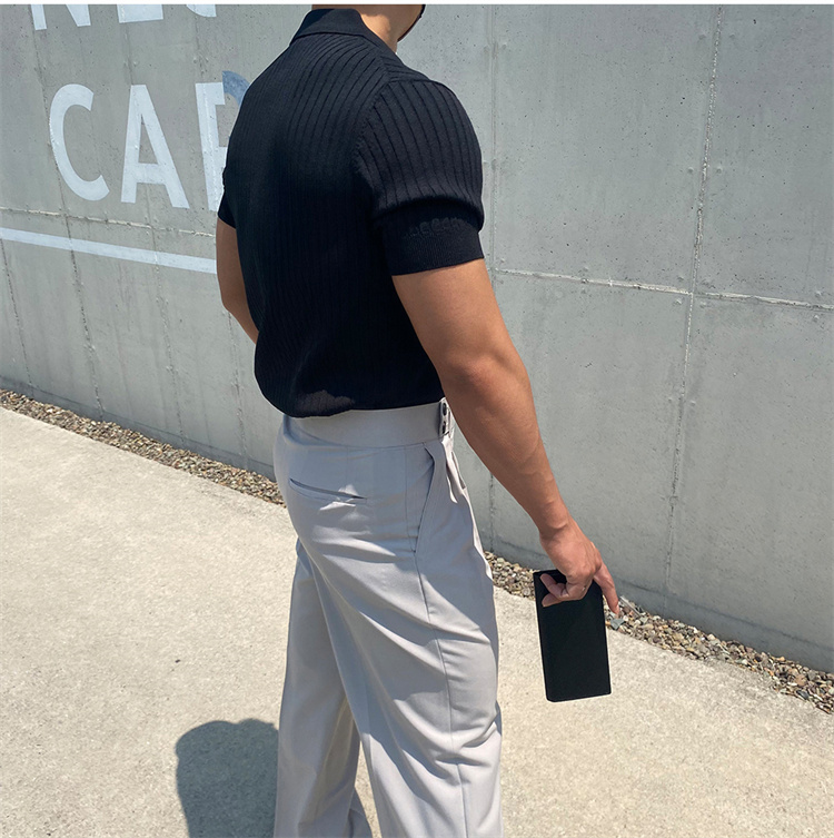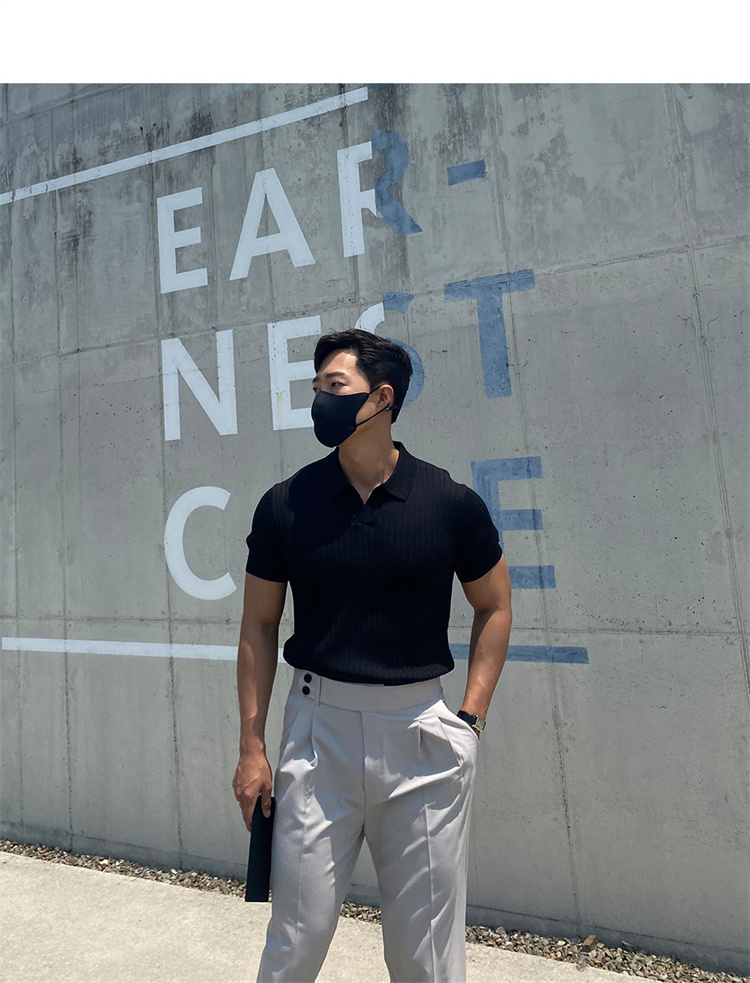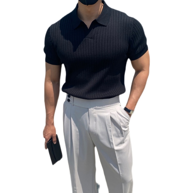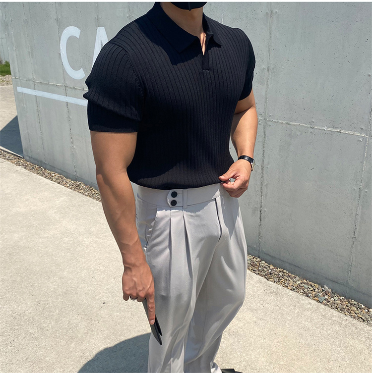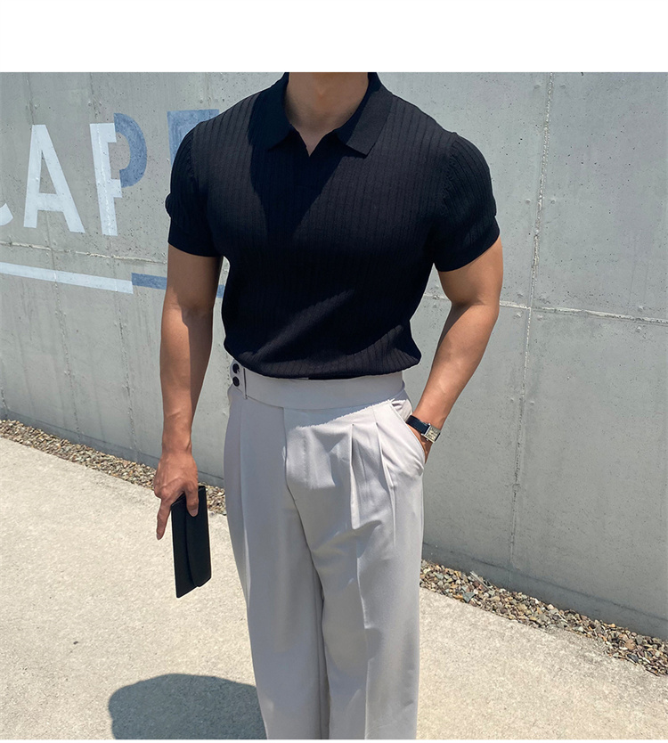 翻領男士針織polo衫短袖夏季薄款純色豎條紋修身休閒彈力t恤半袖