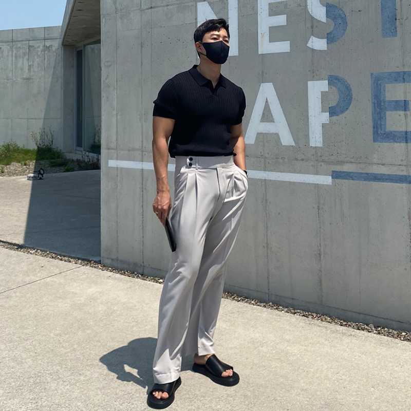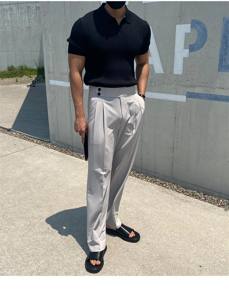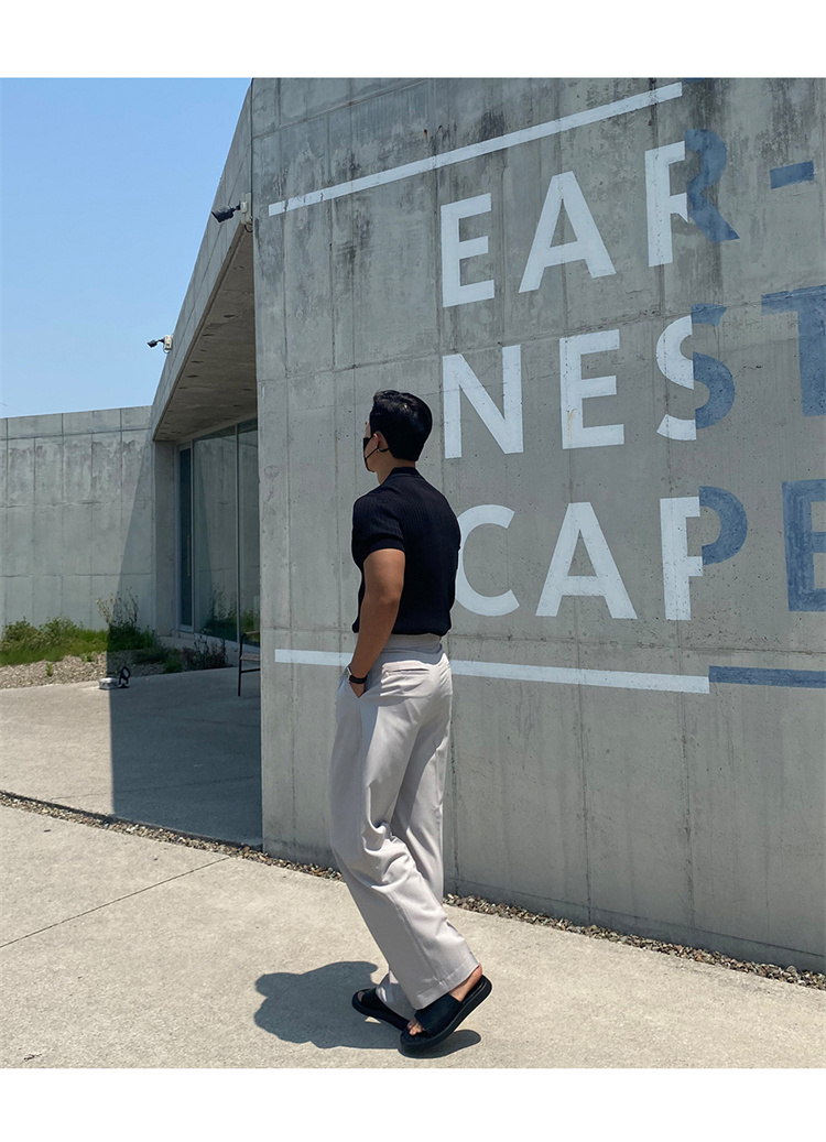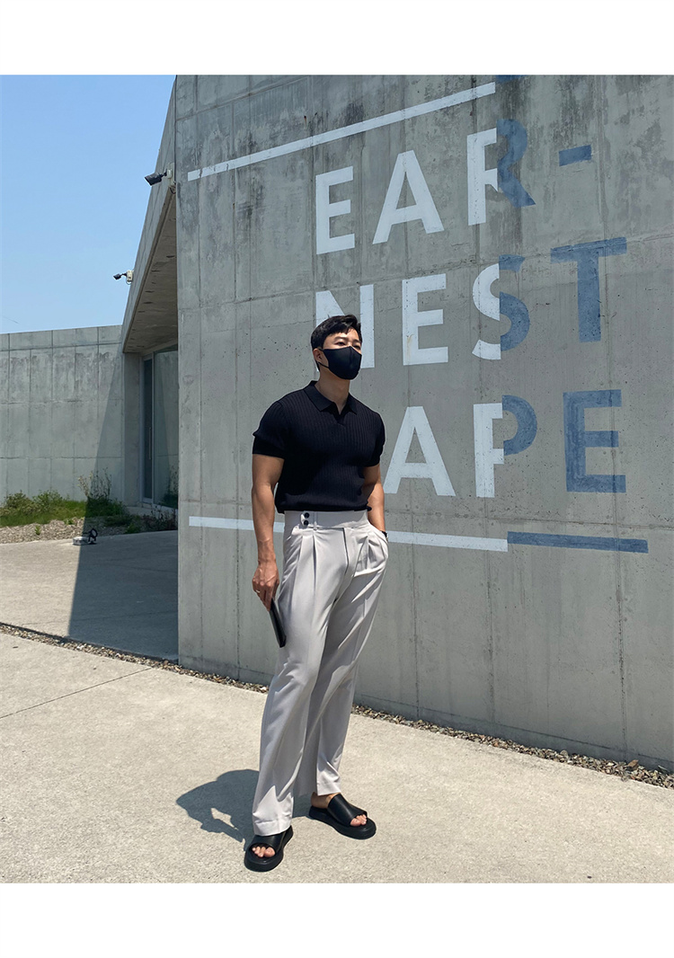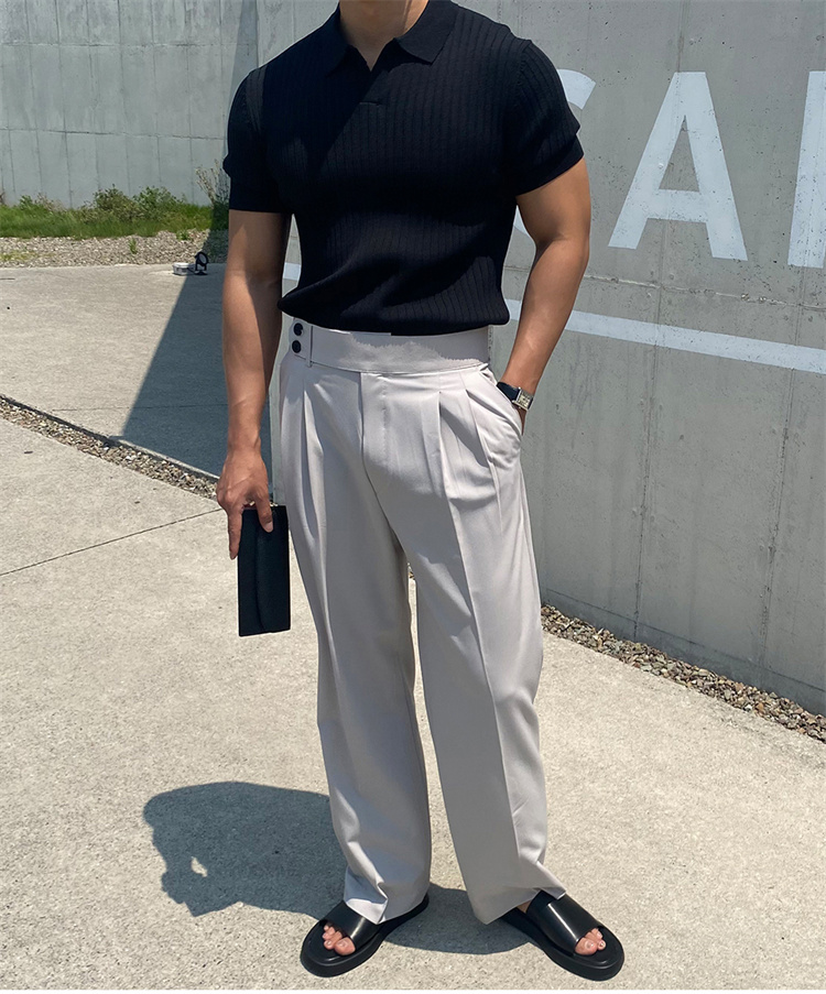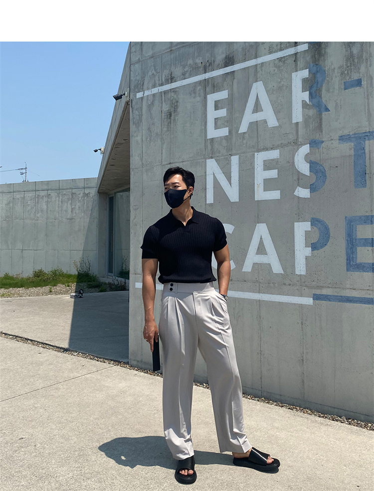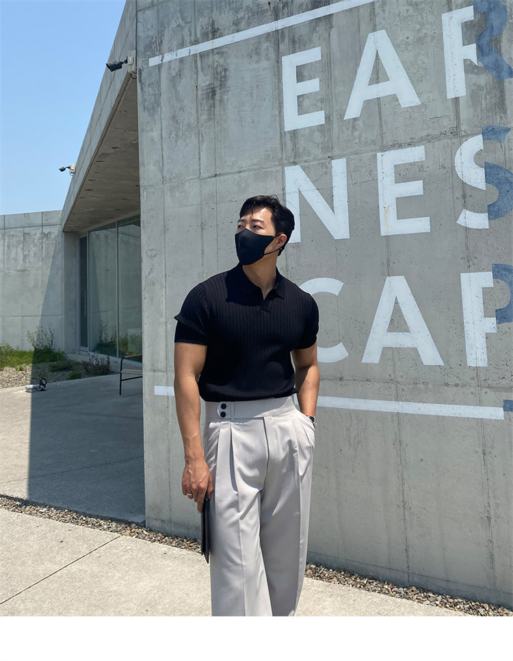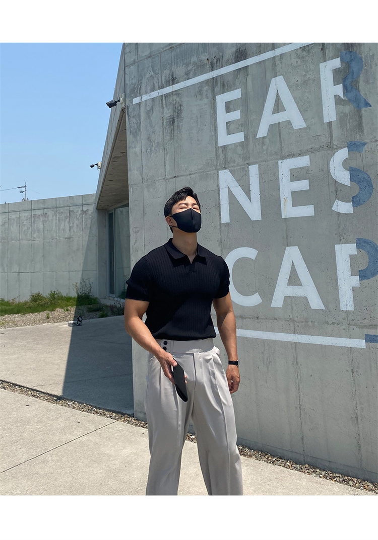 翻領男士針織polo衫短袖夏季薄款純色豎條紋修身休閒彈力t恤半袖