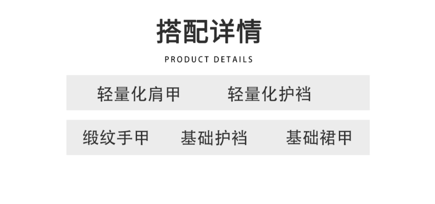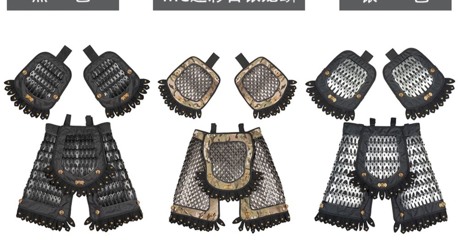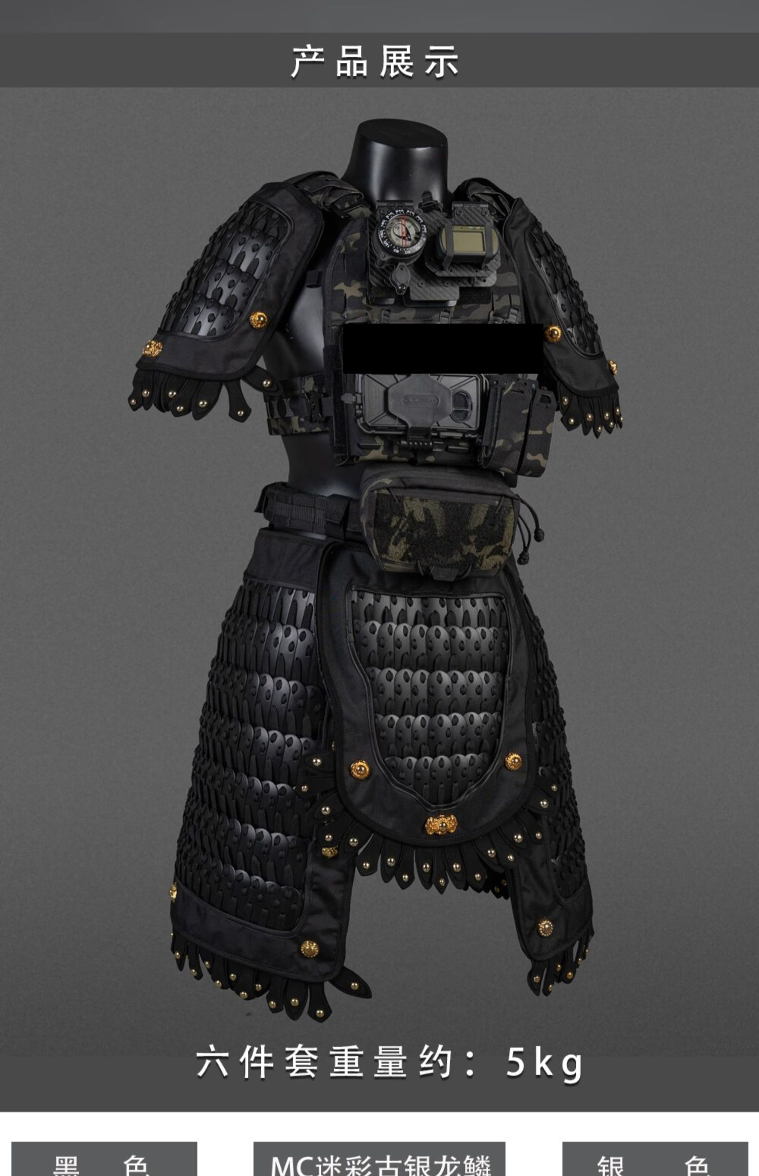 顏色分類 基礎裙甲全黑色(鐵質甲片),基礎裙甲MC迷彩拼黑(鐵質甲片),基礎裙甲RG遊騎兵綠拼黑(鐵質甲片),基礎裙甲黑拼銀色(不鏽鋼甲片)),札甲黑色將校6件套(鐵質甲片),札甲銀色將校6件套(不鏽鋼甲片),MC迷彩古銀龍鱗甲將校6件套(不鏽鋼甲片)),山文甲MC迷彩肩甲,山文甲RG色肩甲,山文甲MC迷彩金色肩甲,基礎護檔黑色(前後需拍2片),基礎護檔MC迷彩(前後需拍2片),基礎護檔銀色(前後需拍2片)