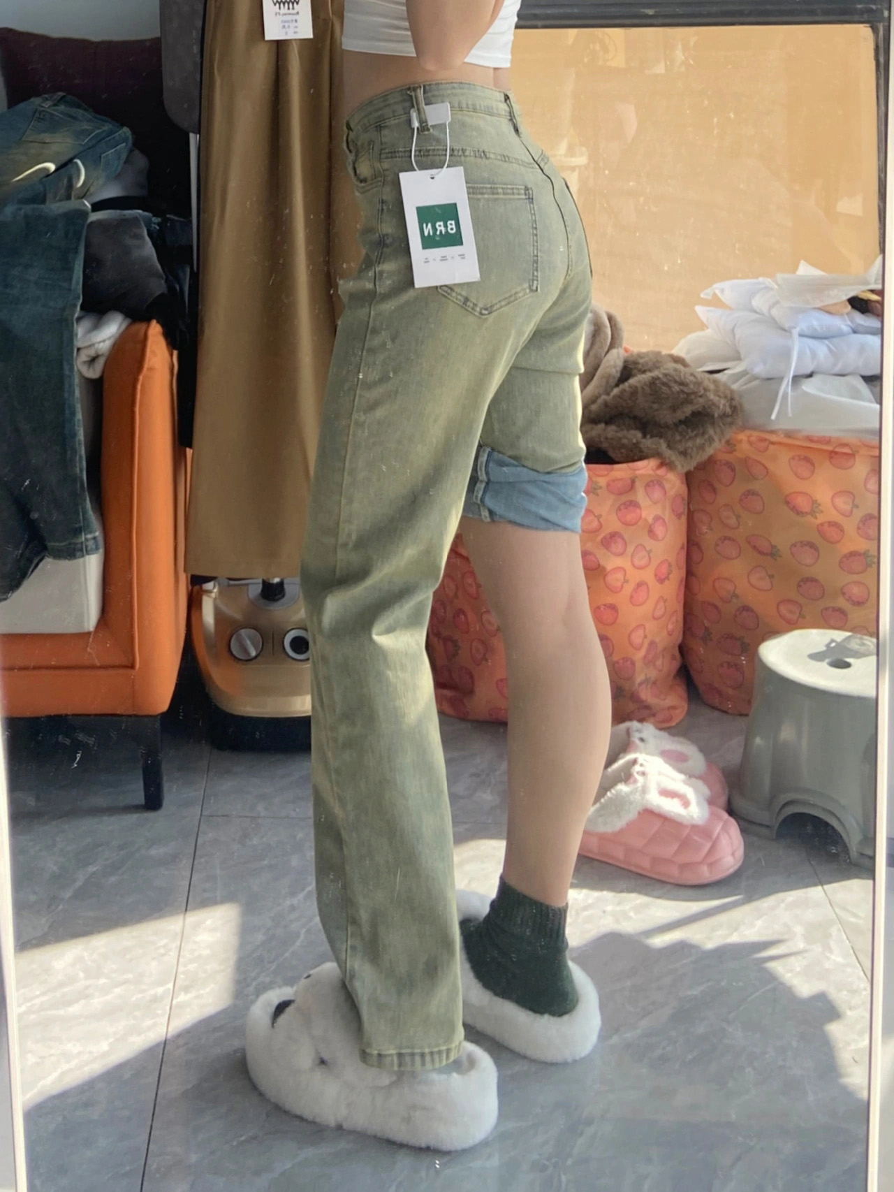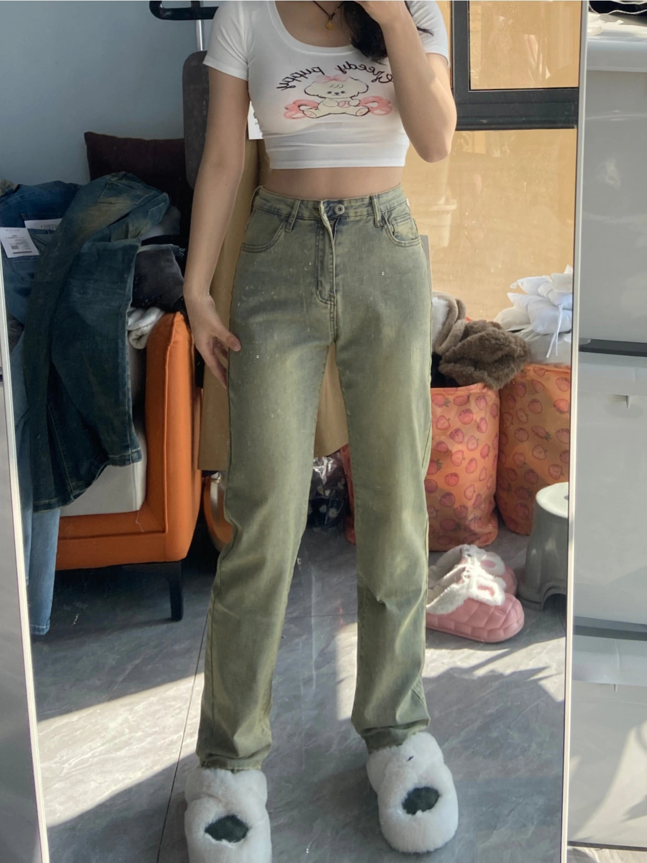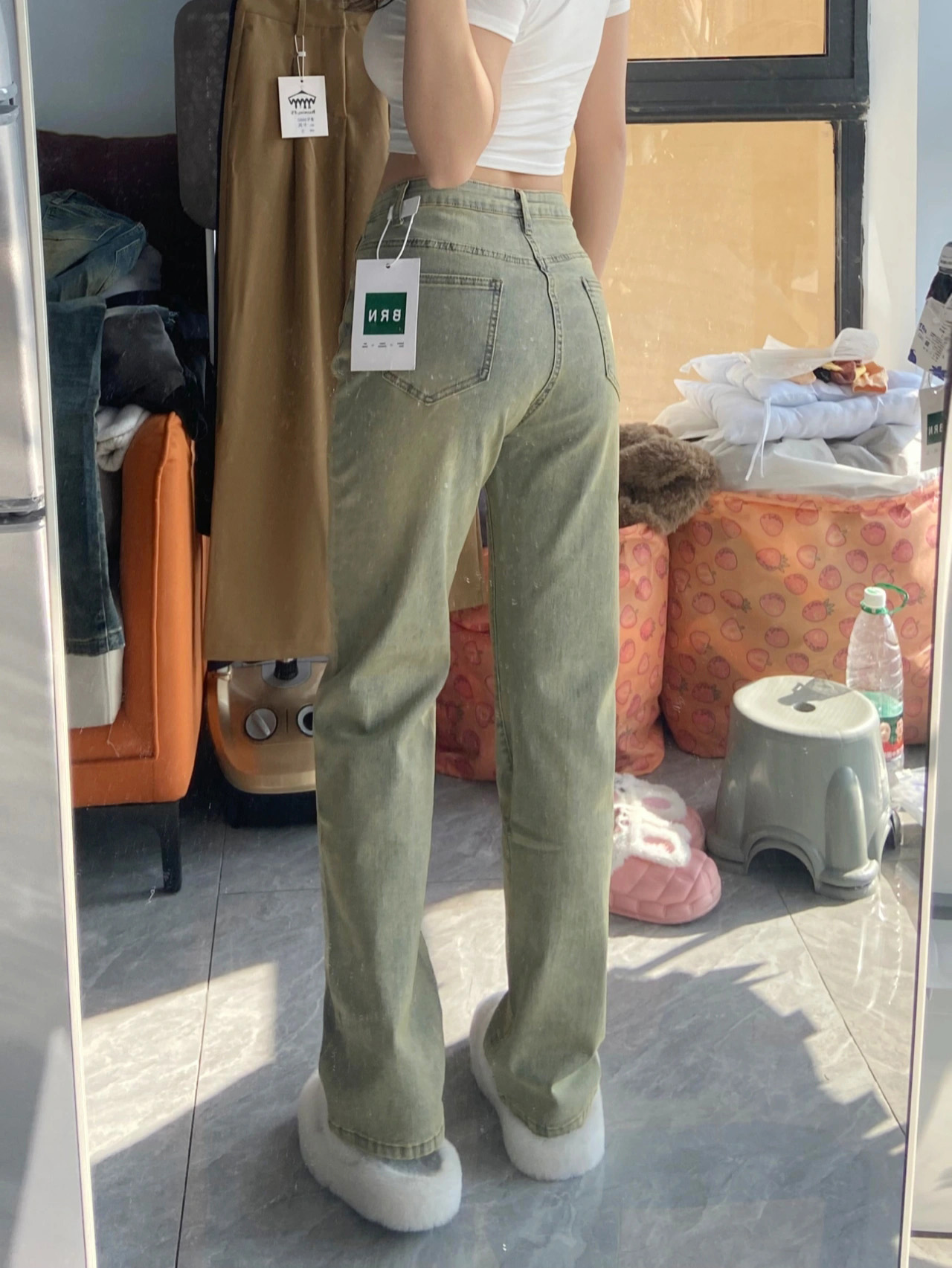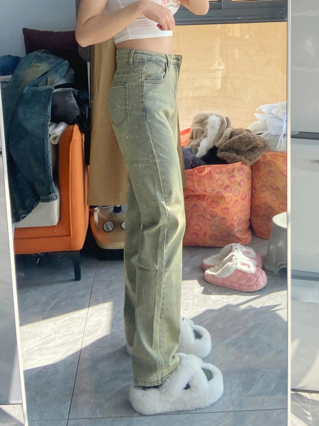 復古做舊黃泥染直筒牛仔褲女春秋新款高腰顯瘦寬鬆小眾長褲ins潮