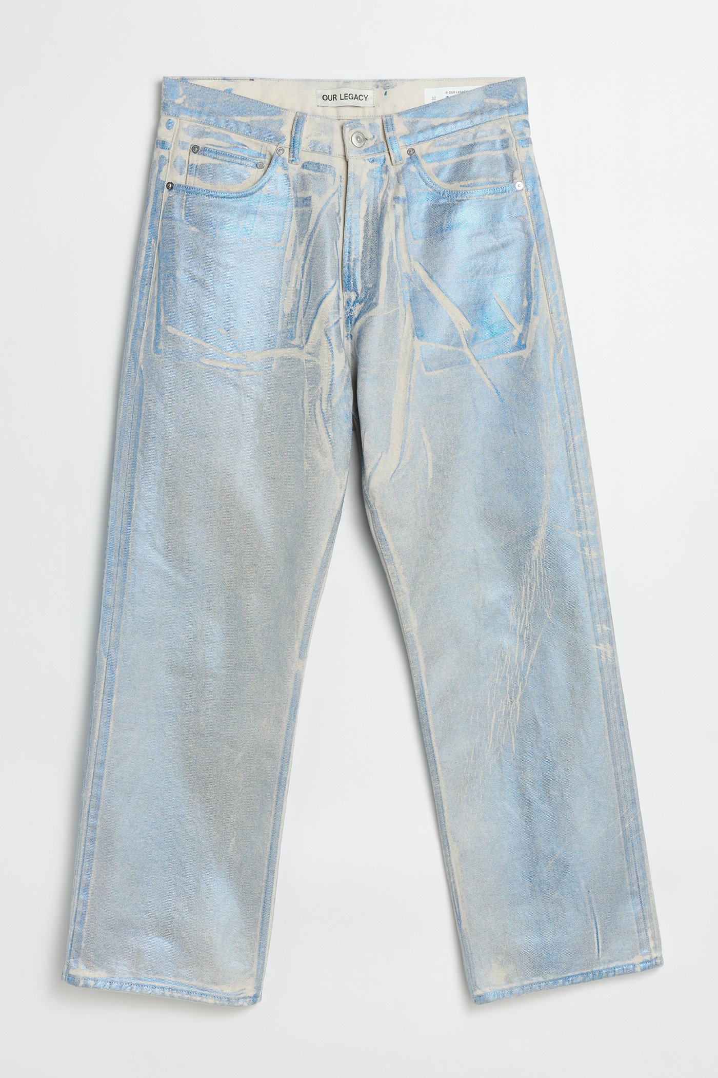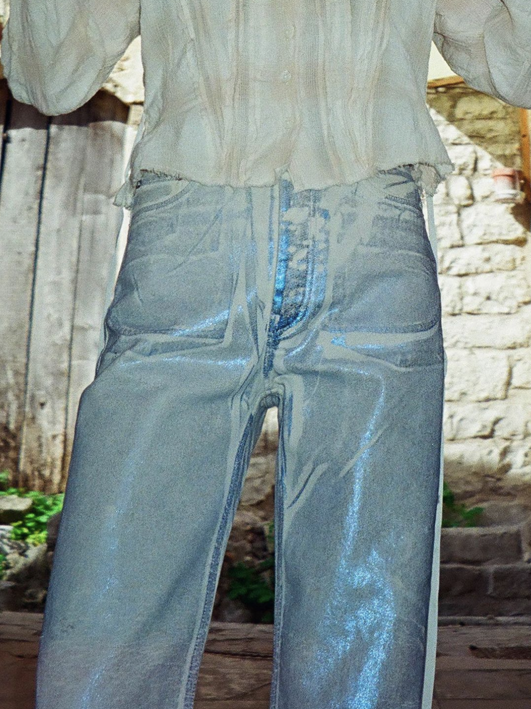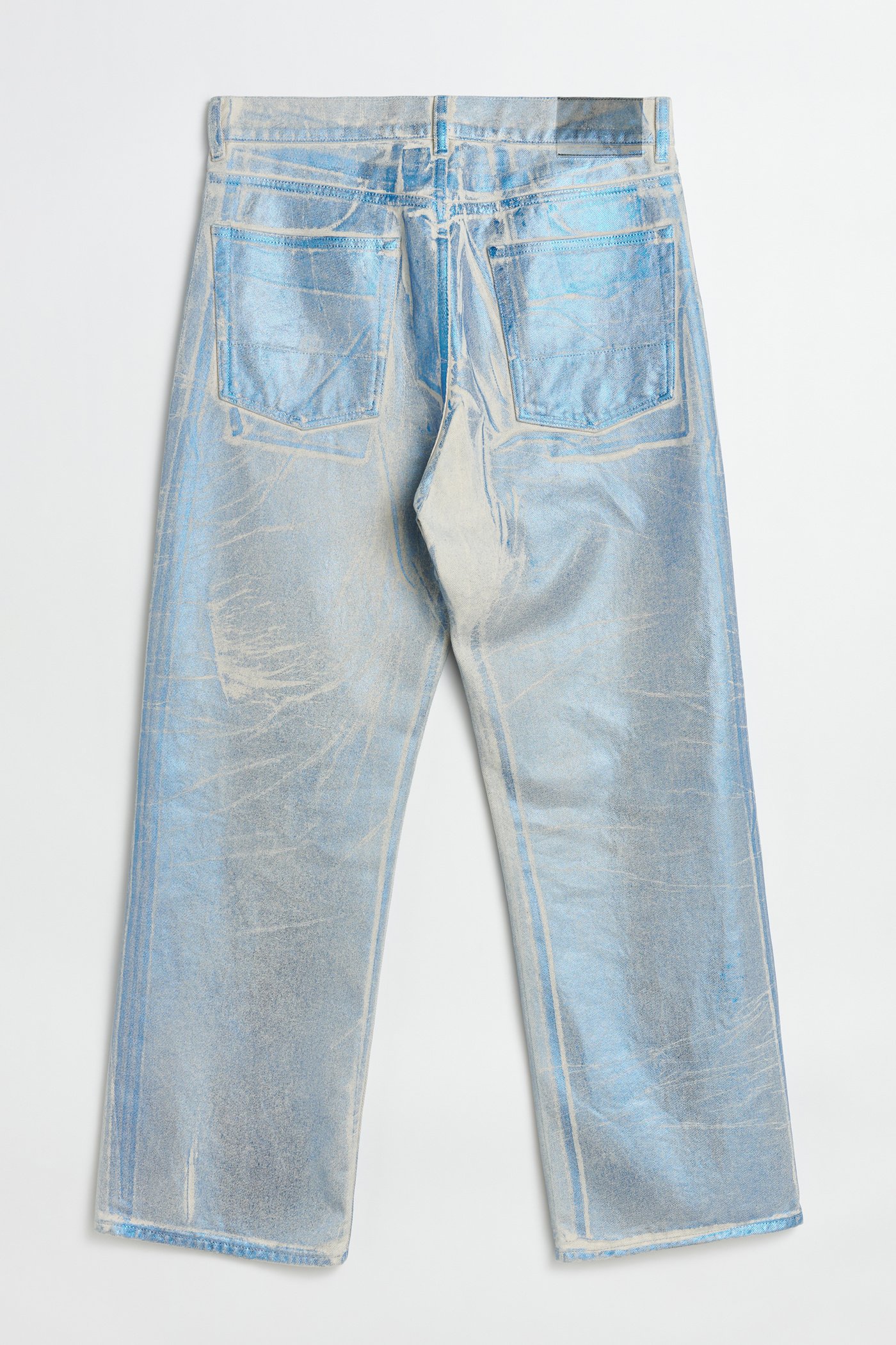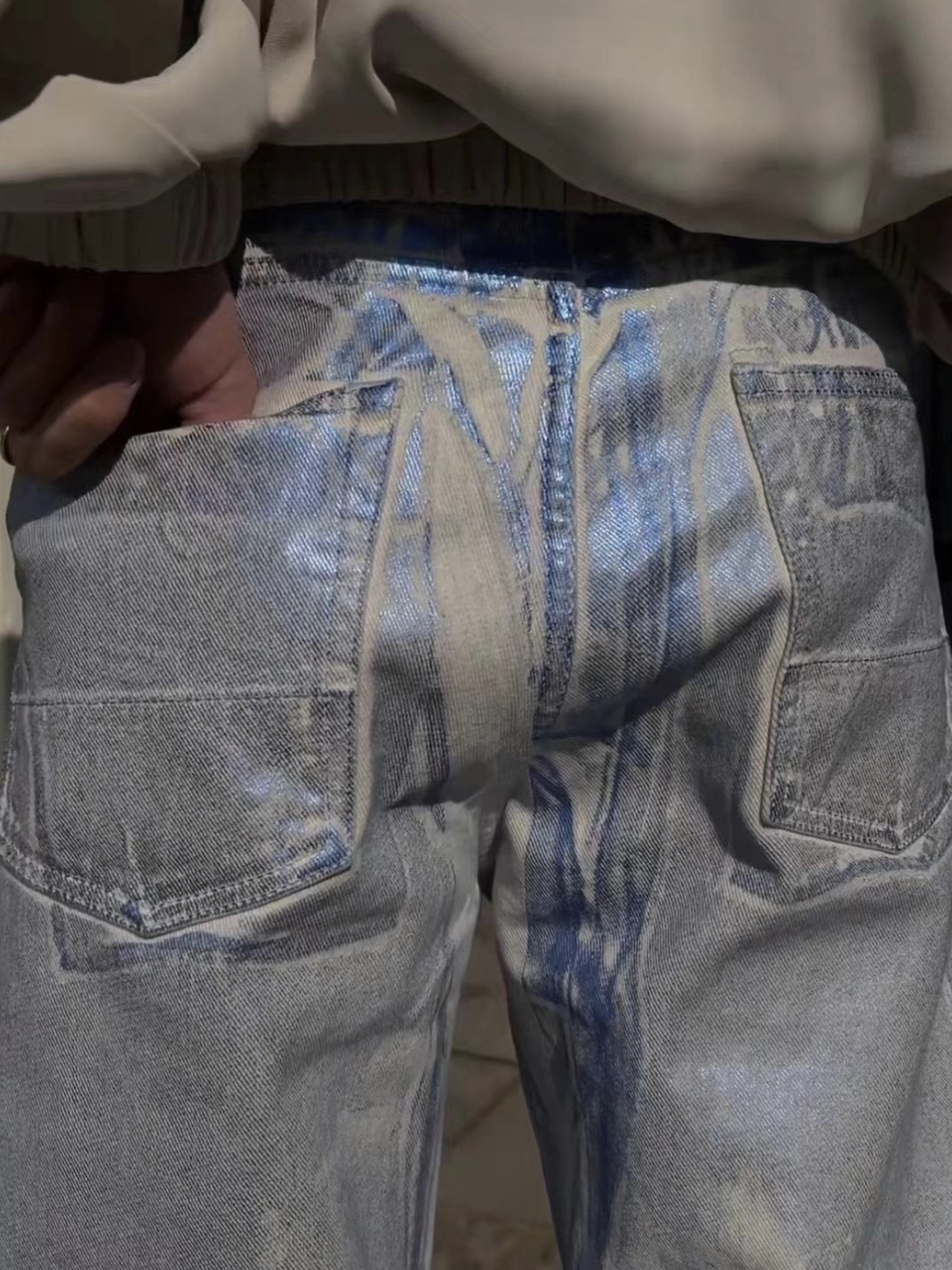 这款裤子运用了一惯的our裤型 底板感觉都没变 做了的箔涂层牛仔效果