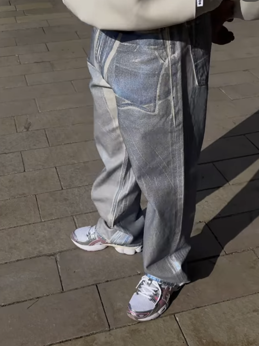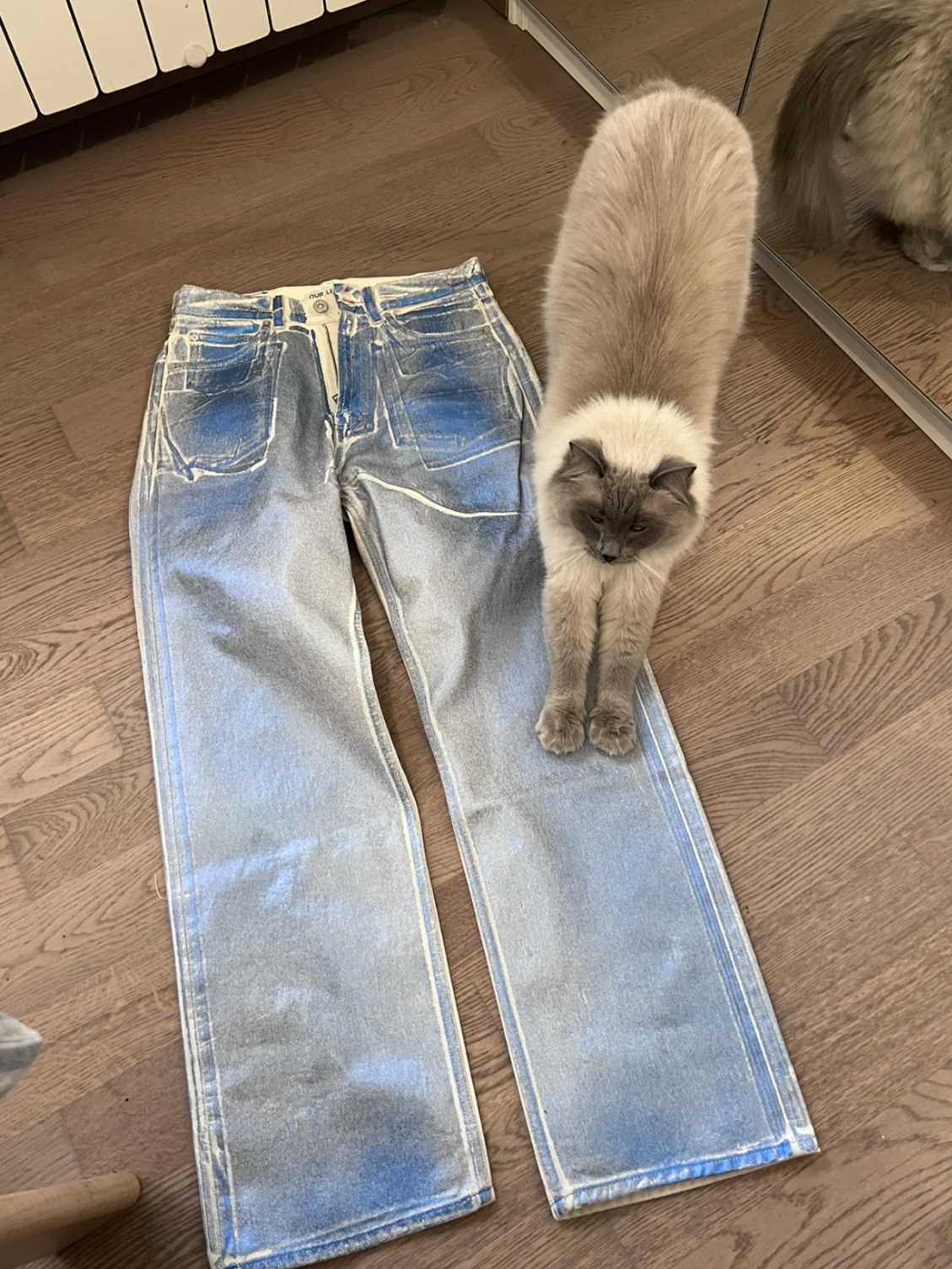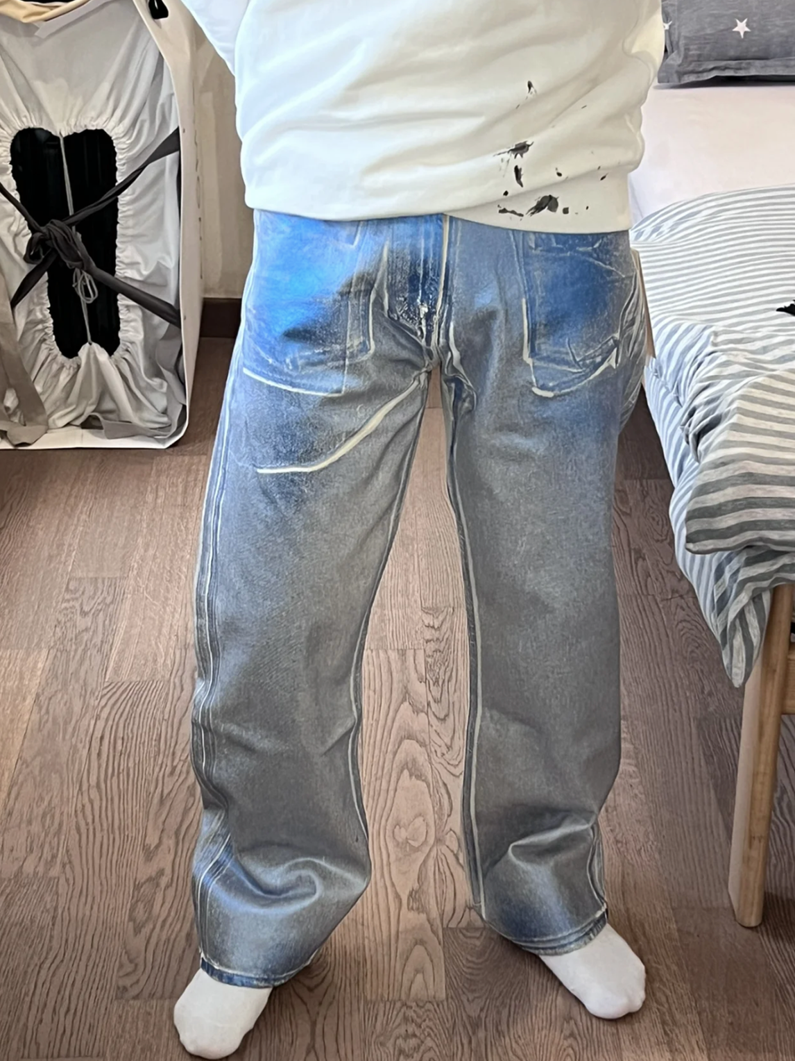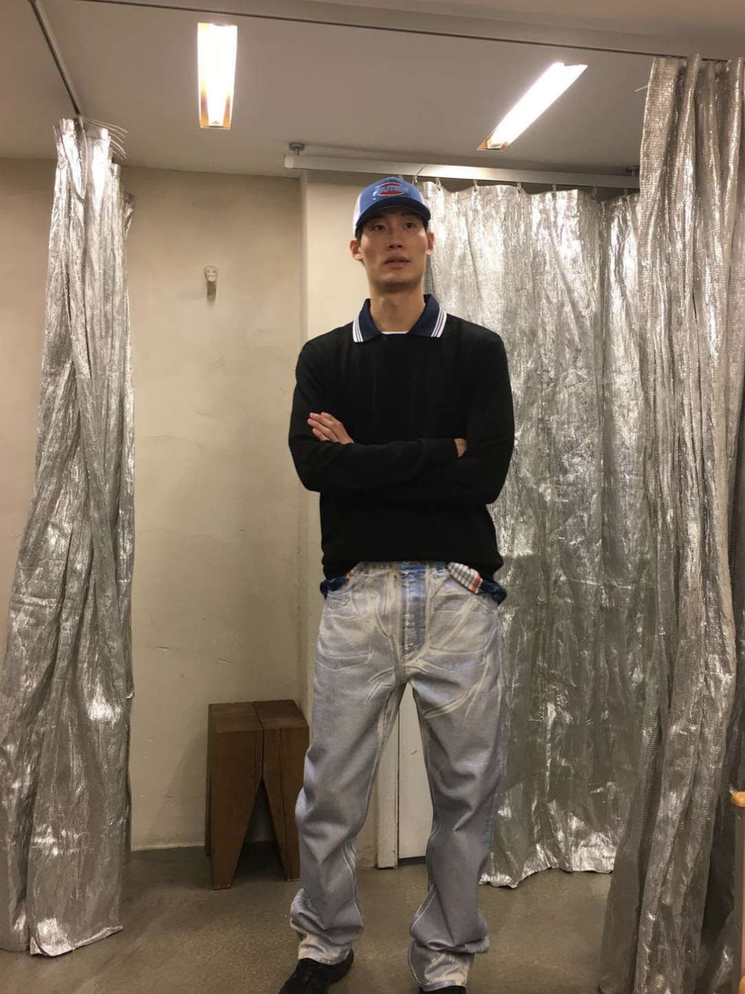 这款裤子运用了一惯的our裤型 底板感觉都没变 做了的箔涂层牛仔效果