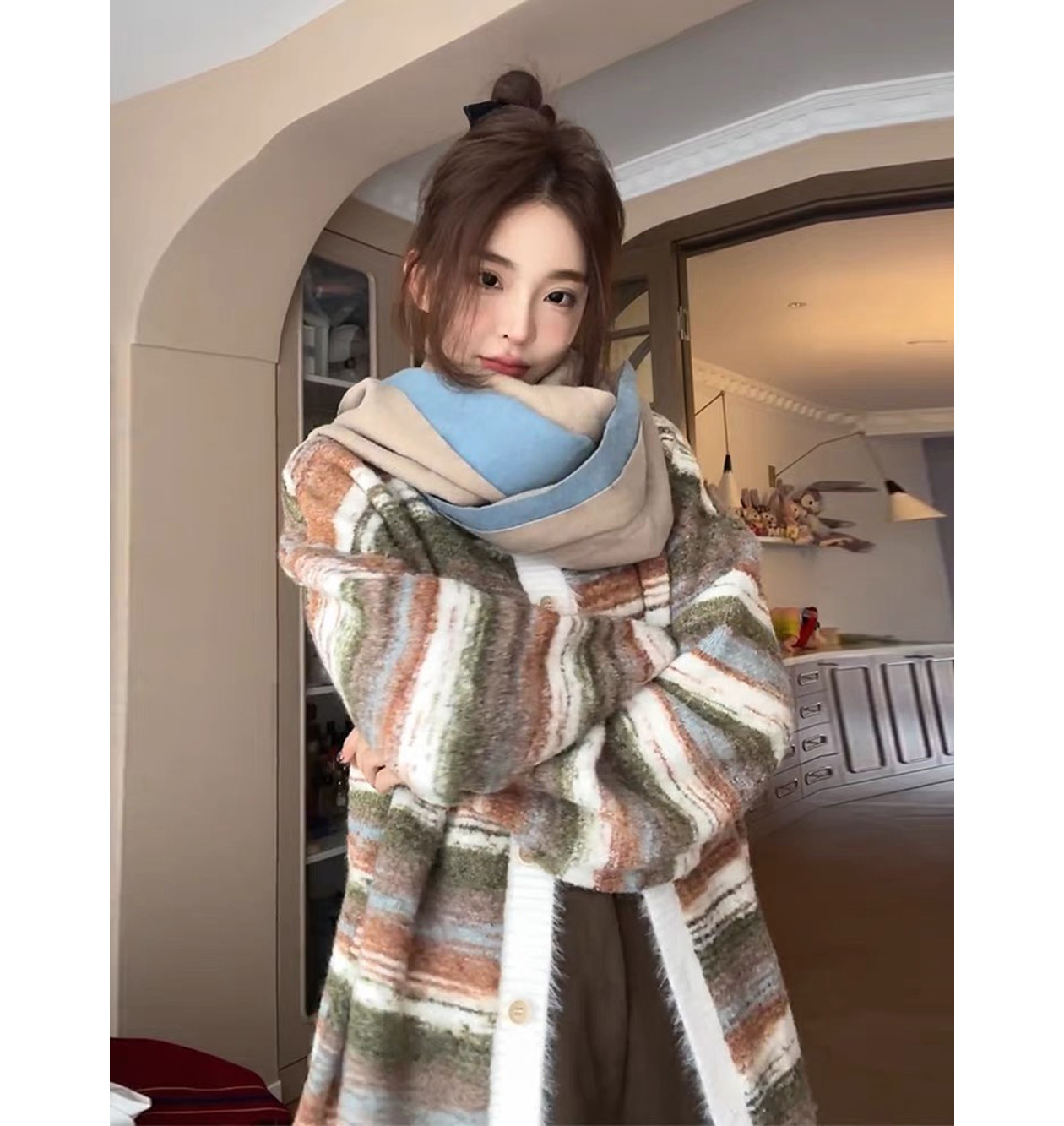 itsokies謝欣桐 秋冬慵懶風彩色條紋毛衣開衫外套復古寬鬆上衣女