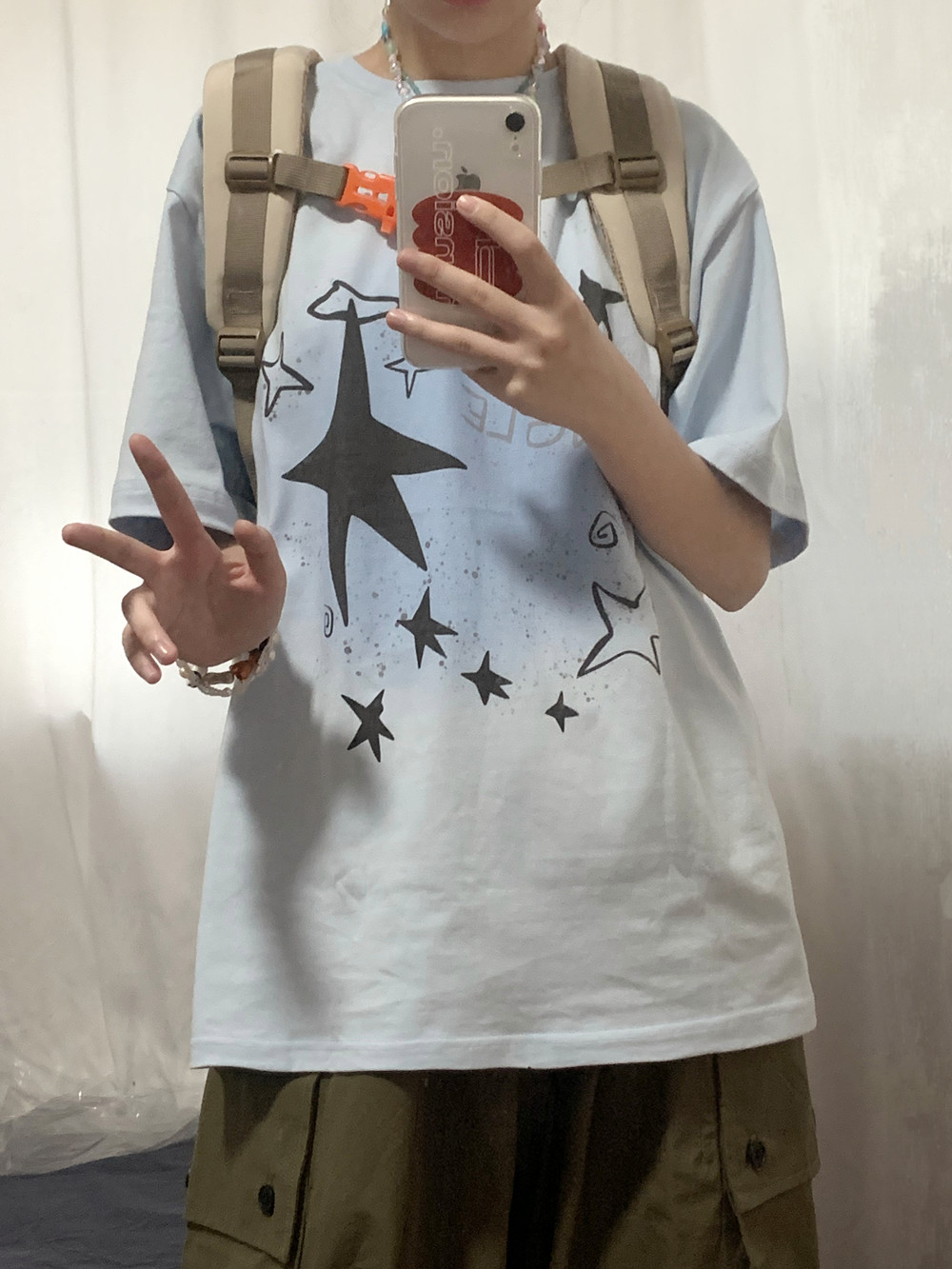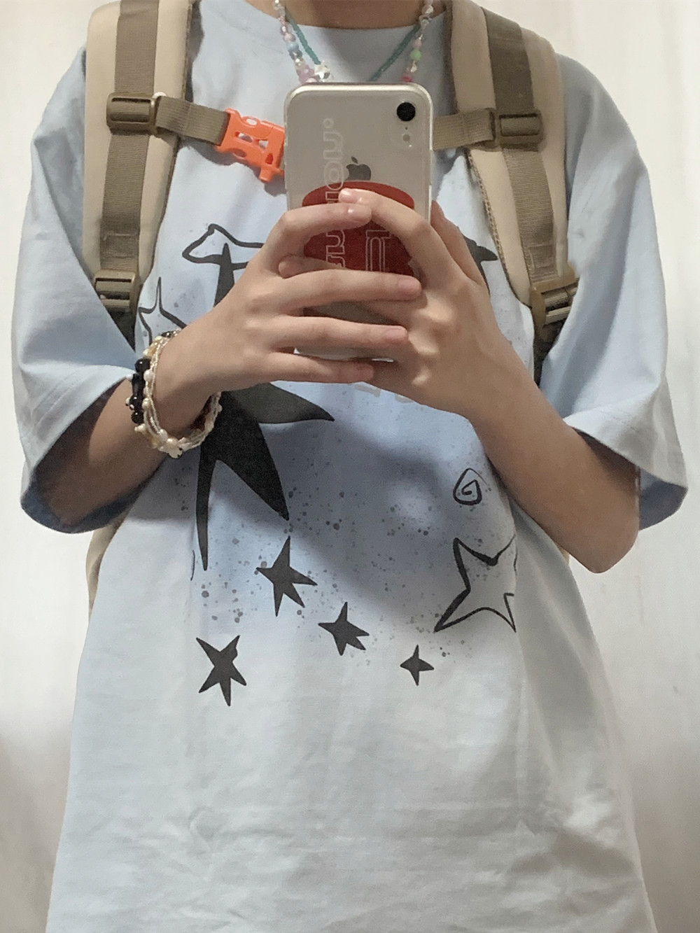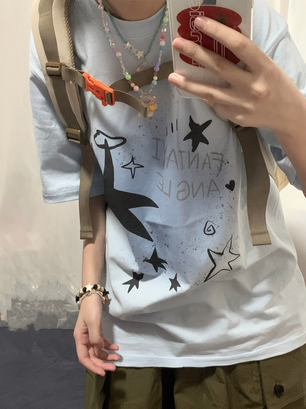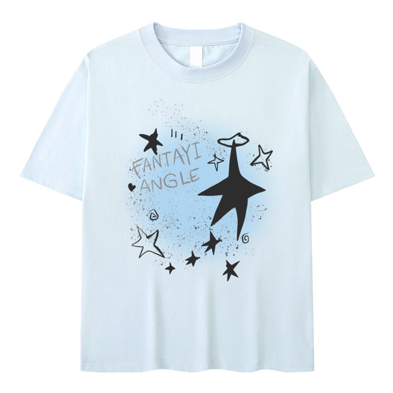 凡他姨【海鹽汽水】原創星星印花T恤女淺藍色重磅純棉圓領短袖夏C