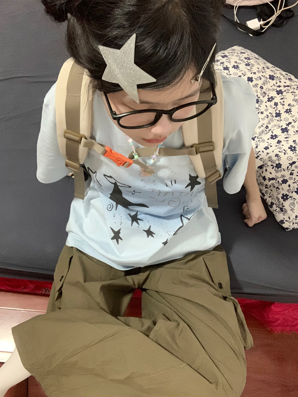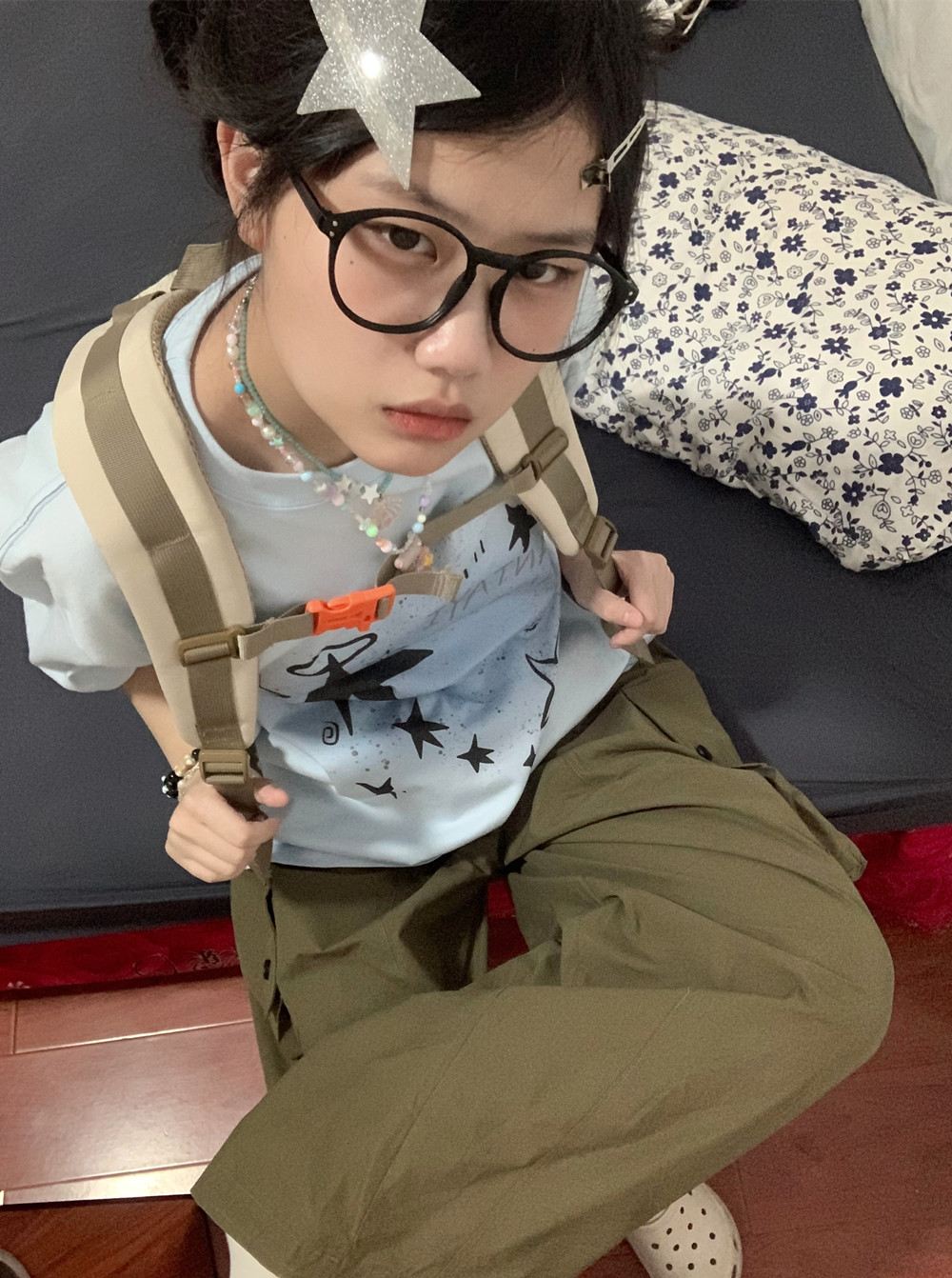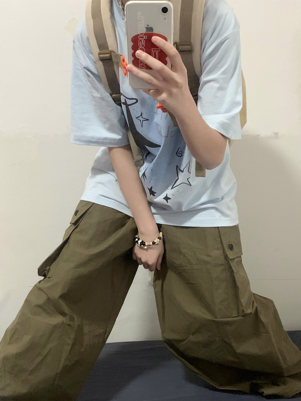 凡他姨【海鹽汽水】原創星星印花T恤女淺藍色重磅純棉圓領短袖夏C