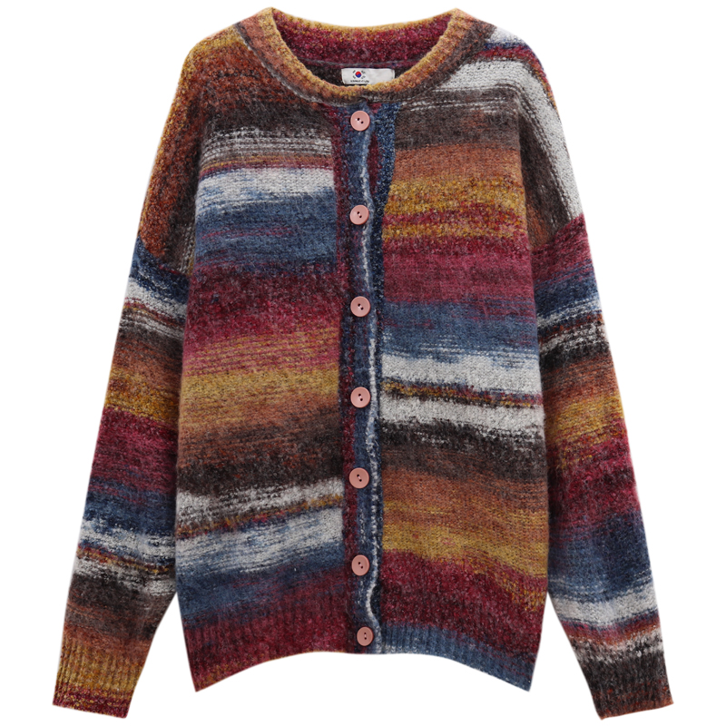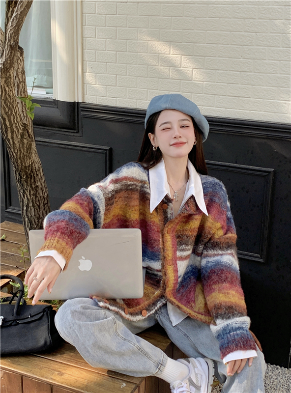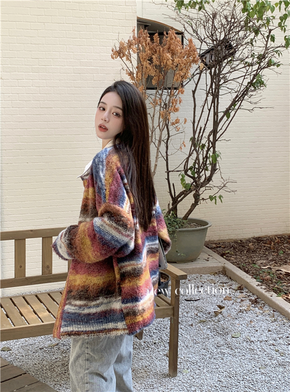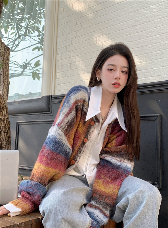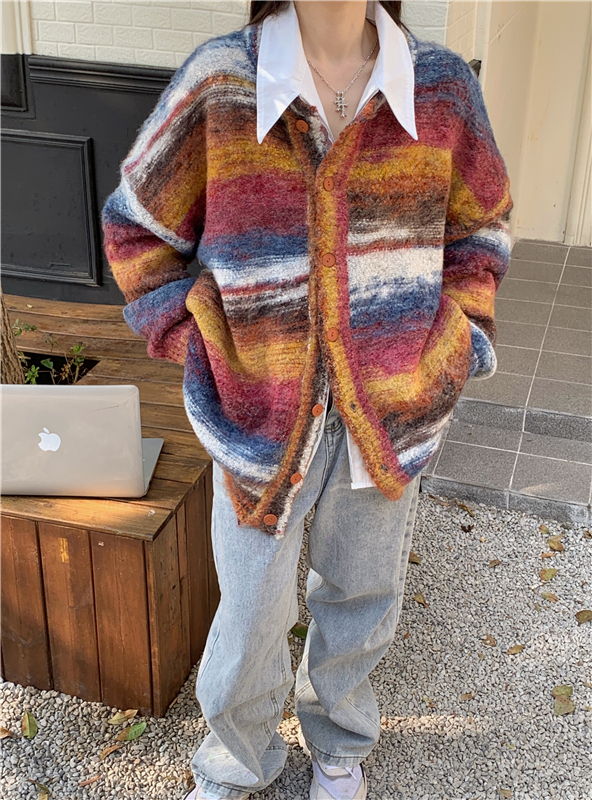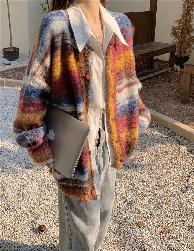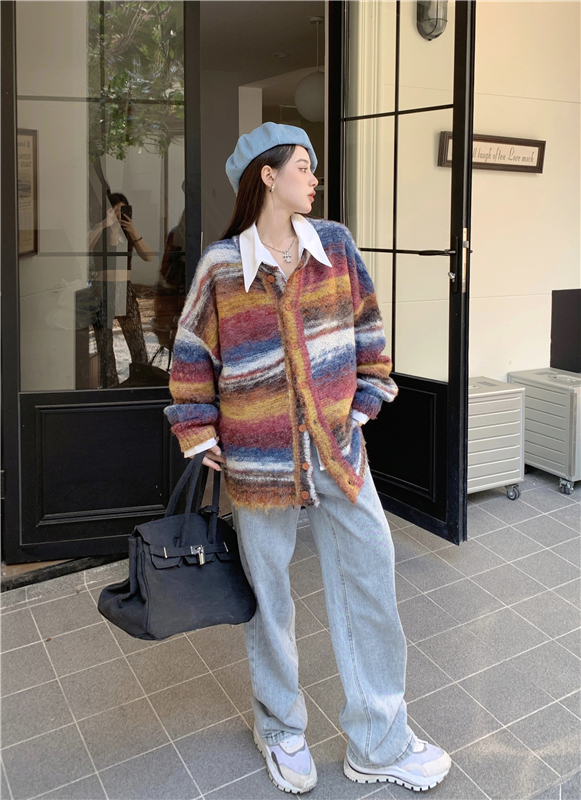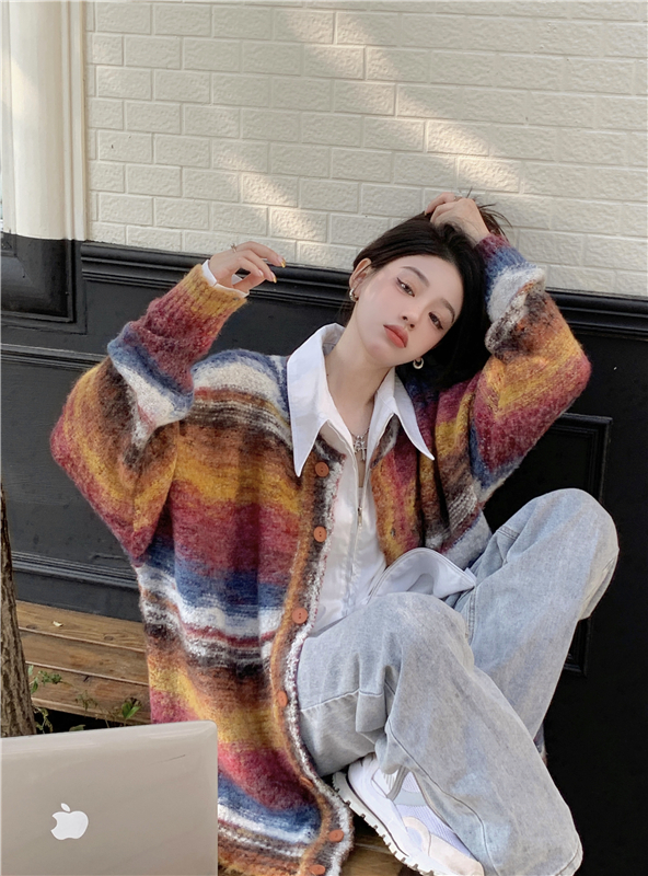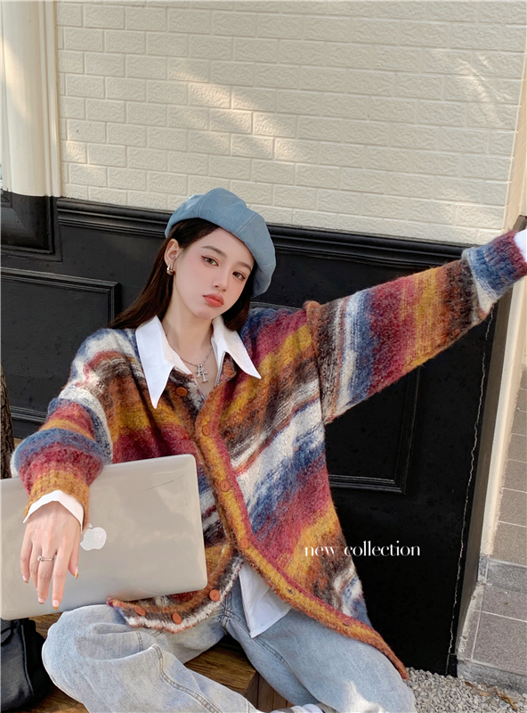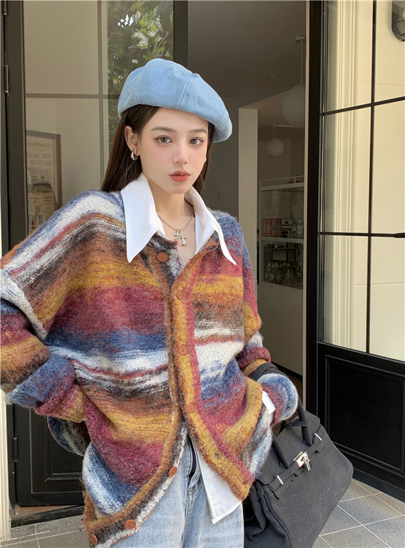別致彩色條紋毛衣外套女春季2023新款寬鬆氣質百搭中長版針織上衣