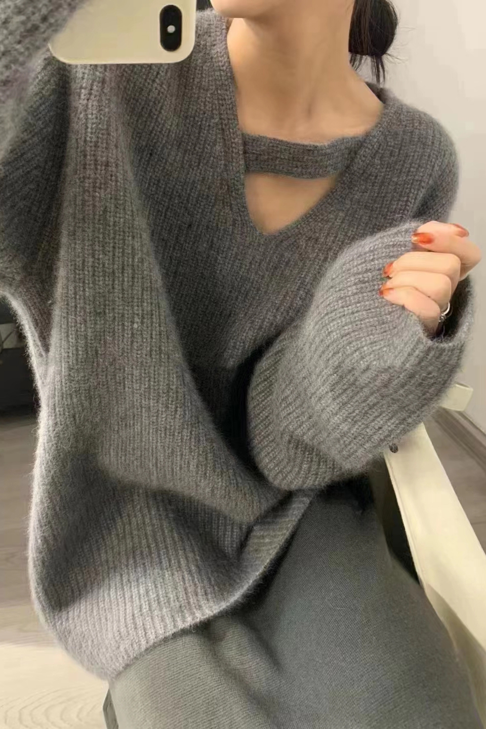 灰色V領鏤空套頭針織毛衣女秋冬冬季加厚設計感小眾高級感慵懶風