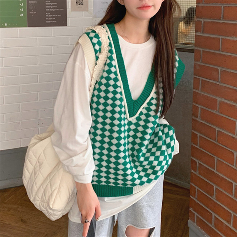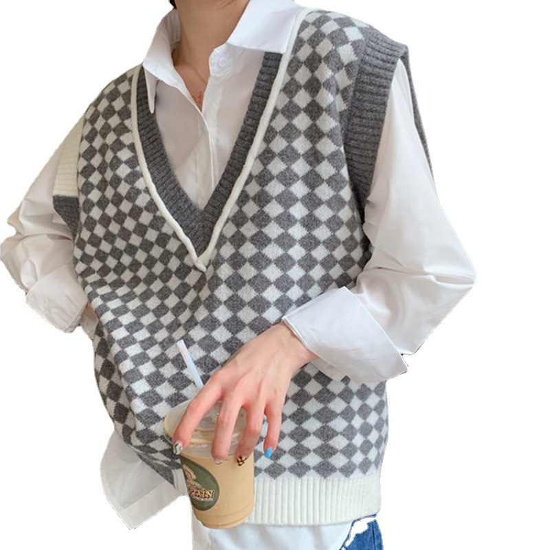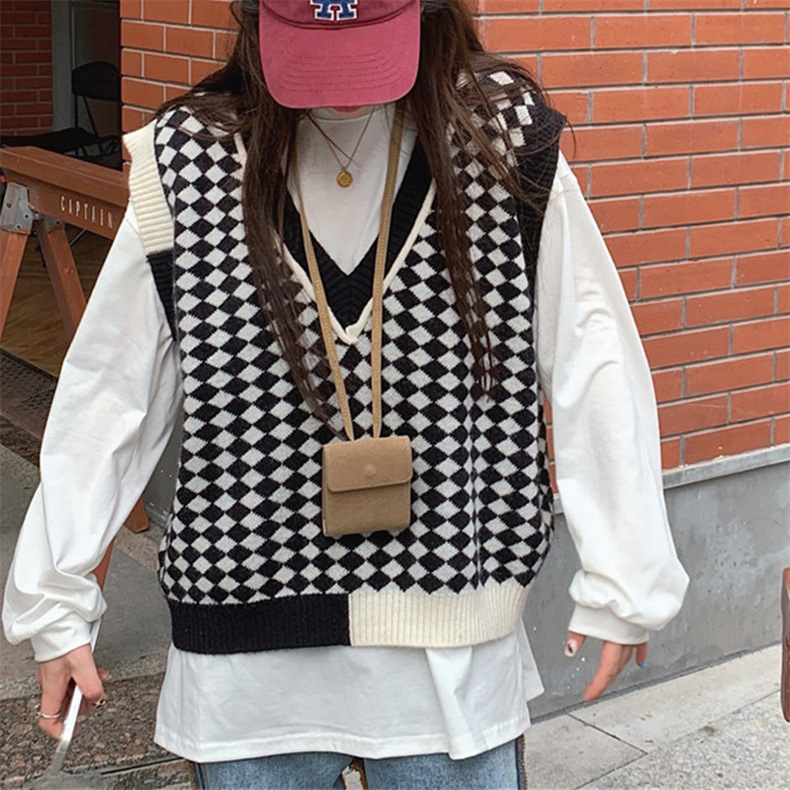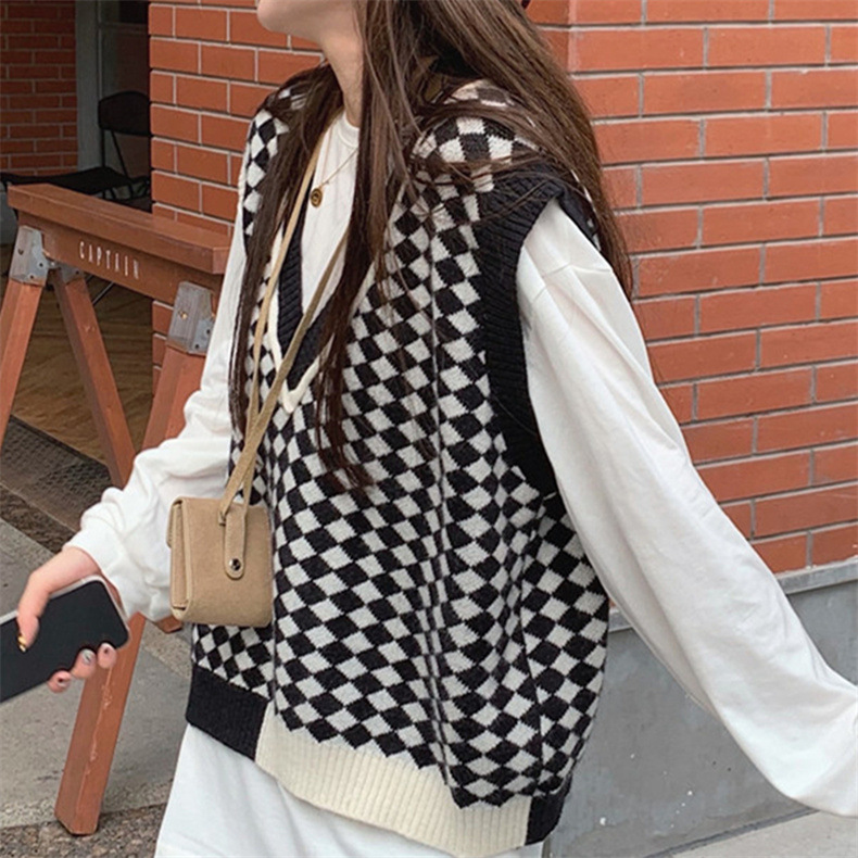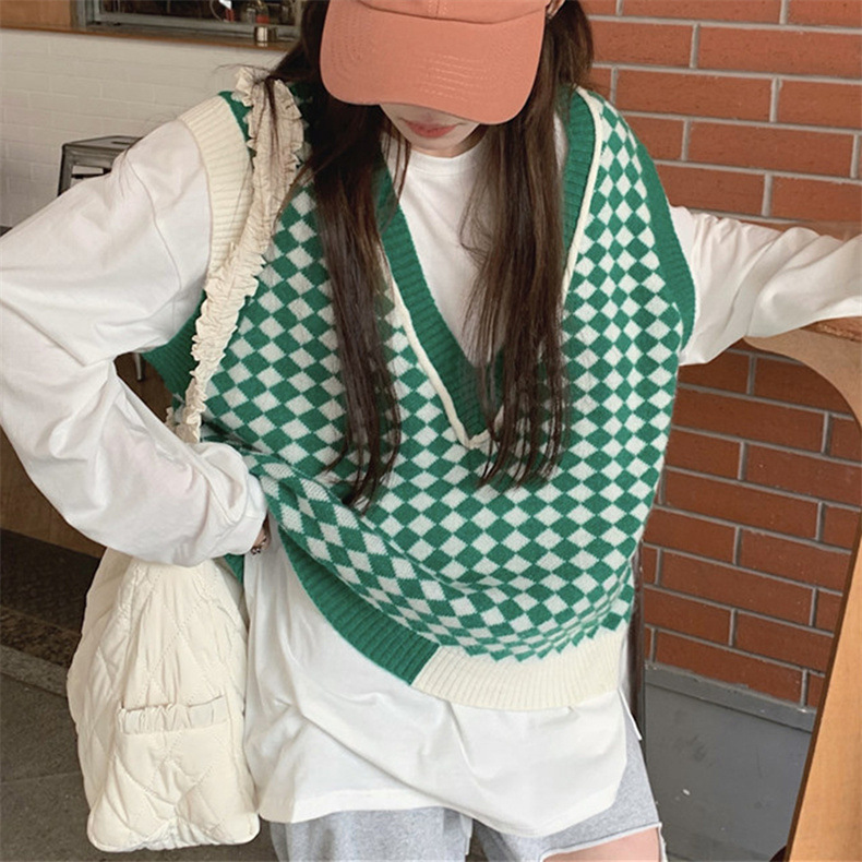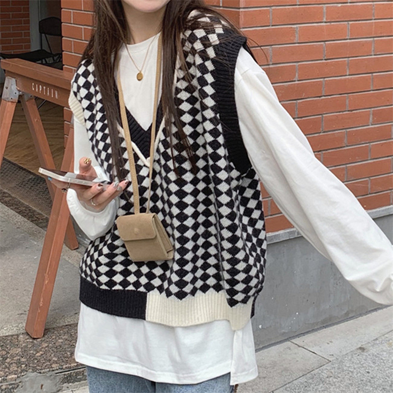 棋盘格v领针织马甲女装气质时尚2022秋冬新款网红宽松毛衣马甲女