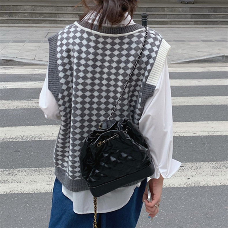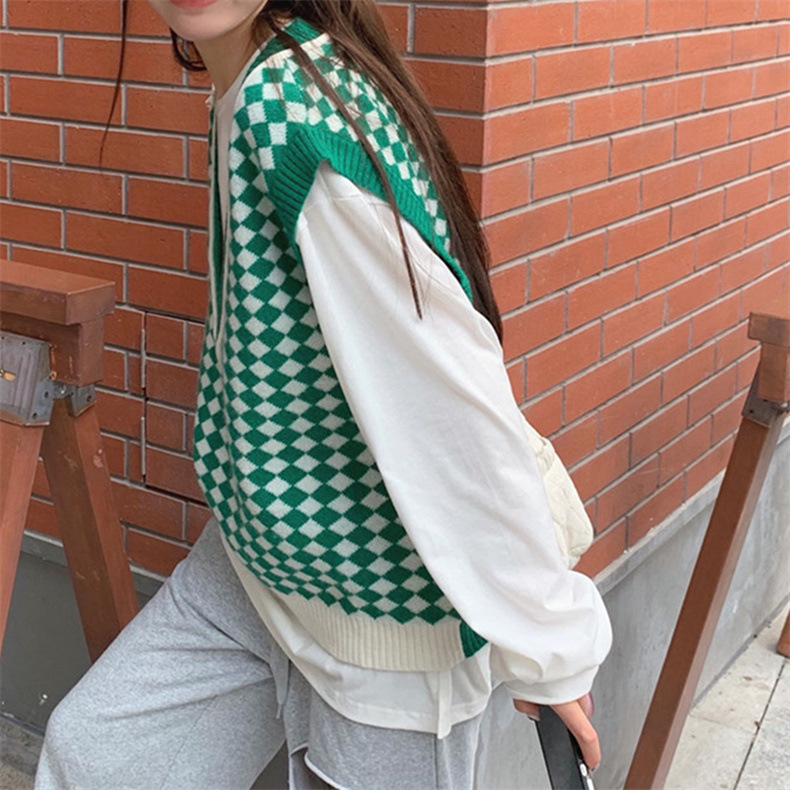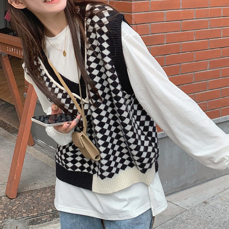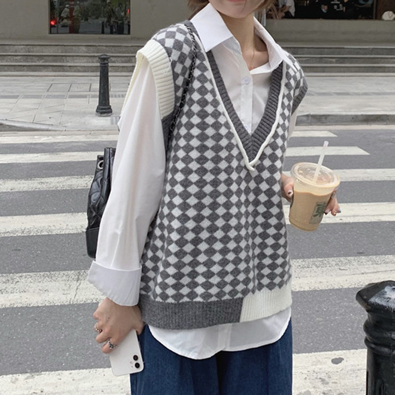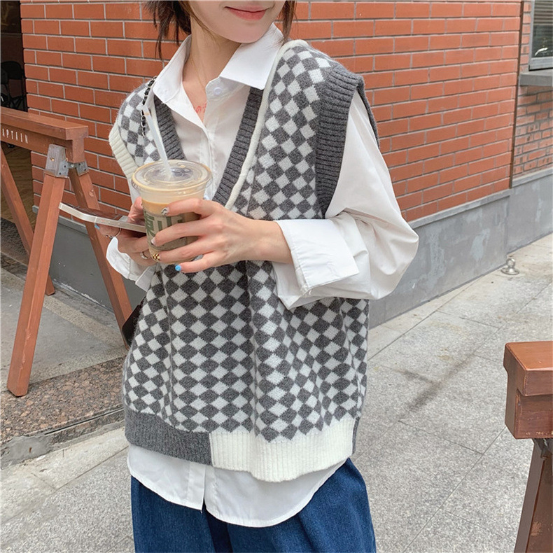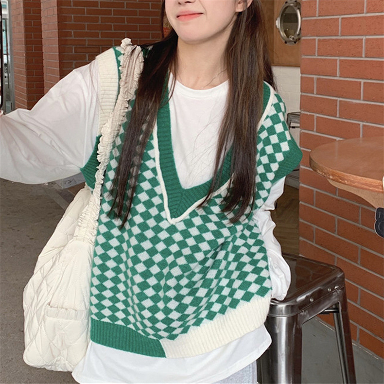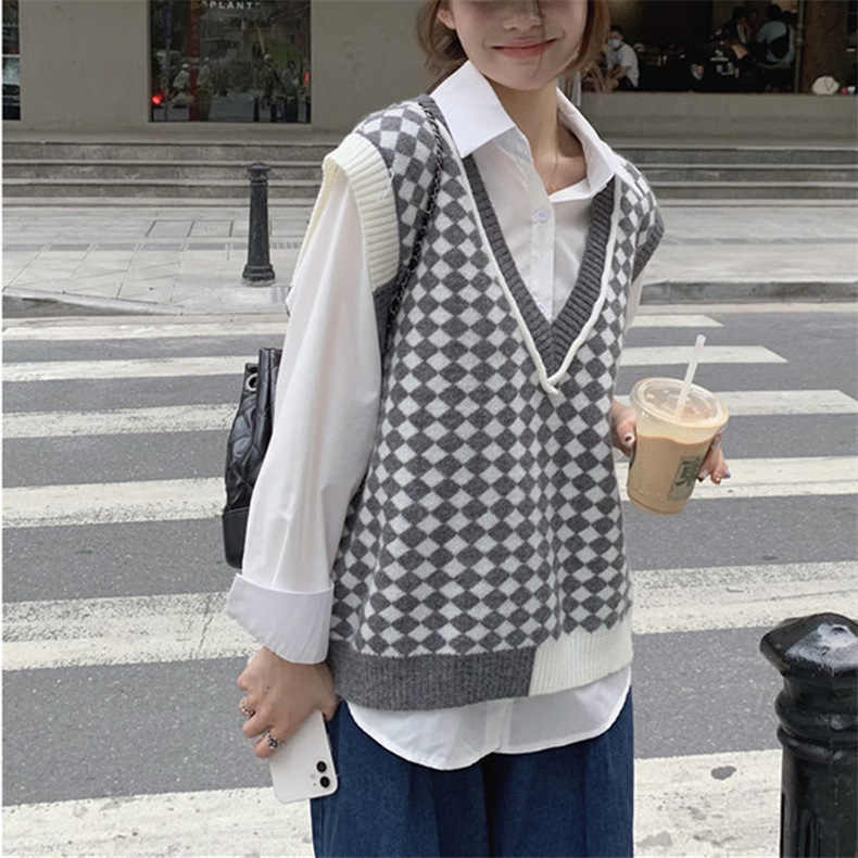 棋盘格v领针织马甲女装气质时尚2022秋冬新款网红宽松毛衣马甲女