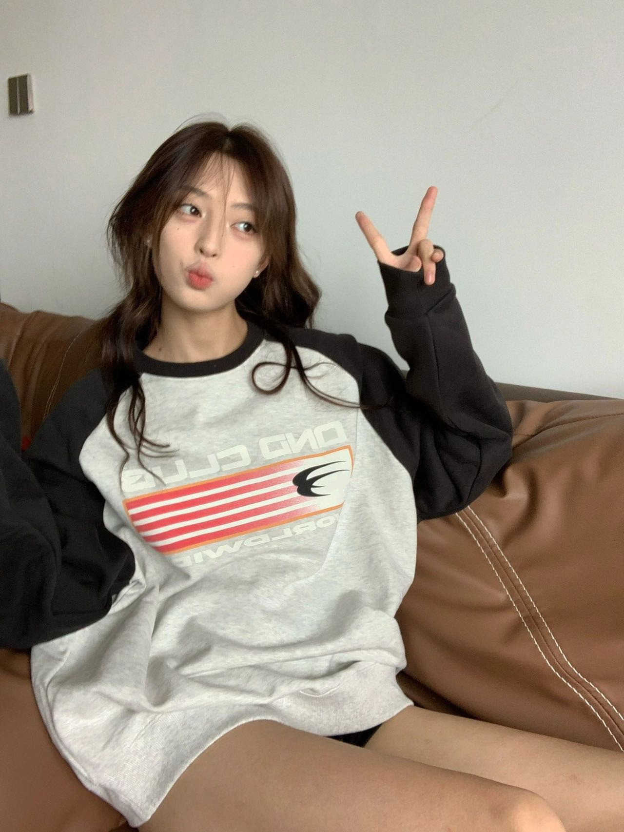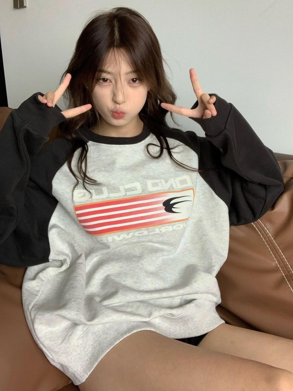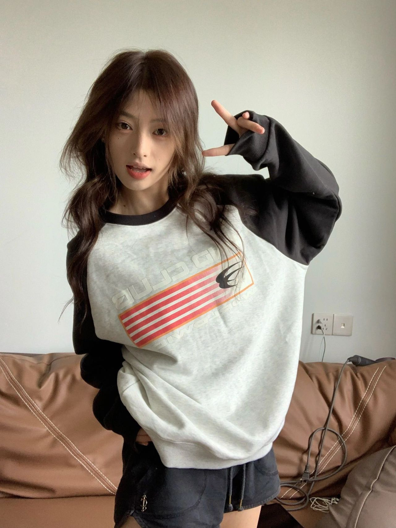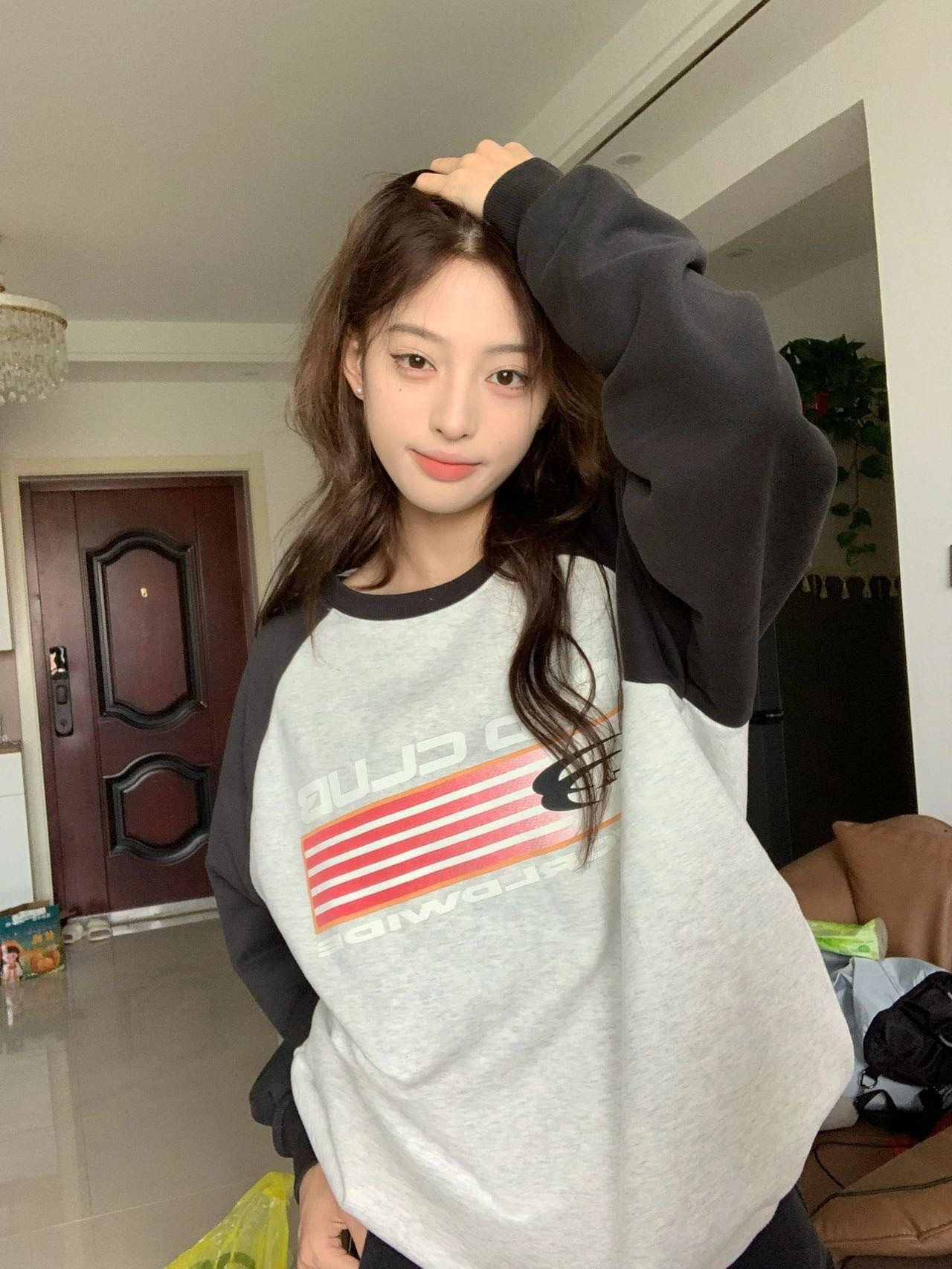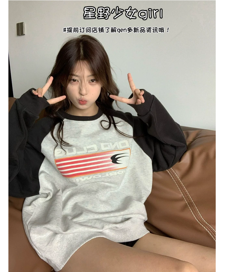 國潮美式復古小眾拼色插肩袖寬鬆圓領情侶厚T恤女秋冬oversize上衣