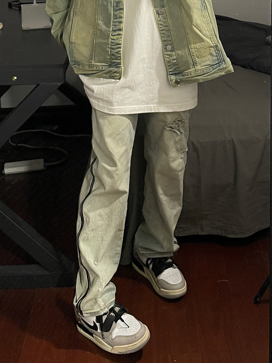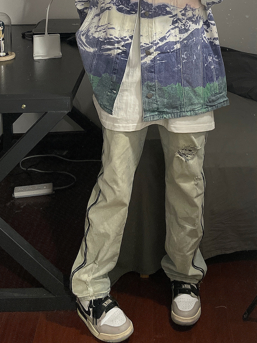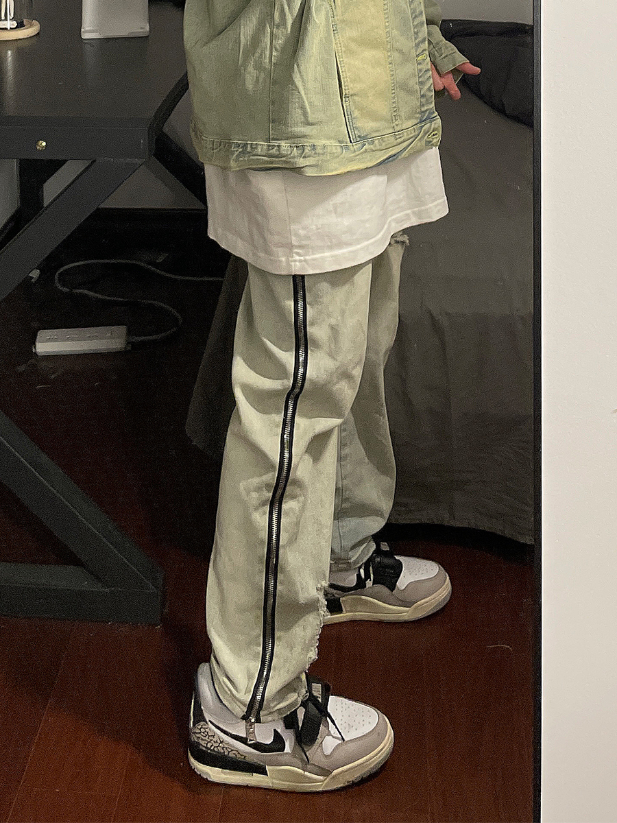 大尺碼歐美式vibe復古高街水洗做舊拉鍊牛仔褲情侶百搭直筒休閒長褲