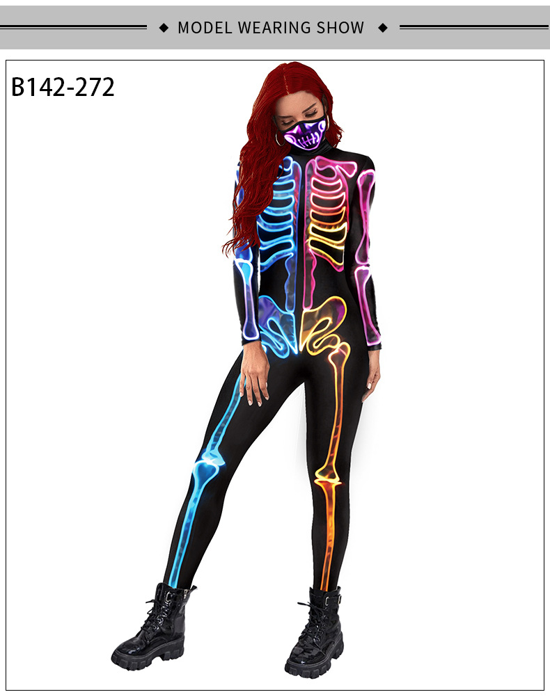 欧美新款彩色骨架印花 cos万圣节长袖紧身衣女士连体裤舞台表演服