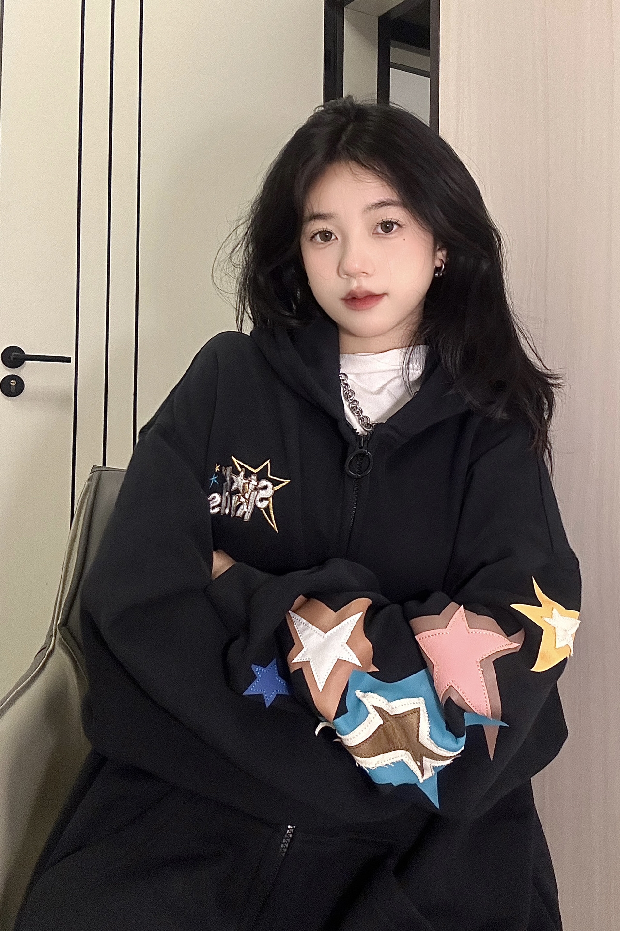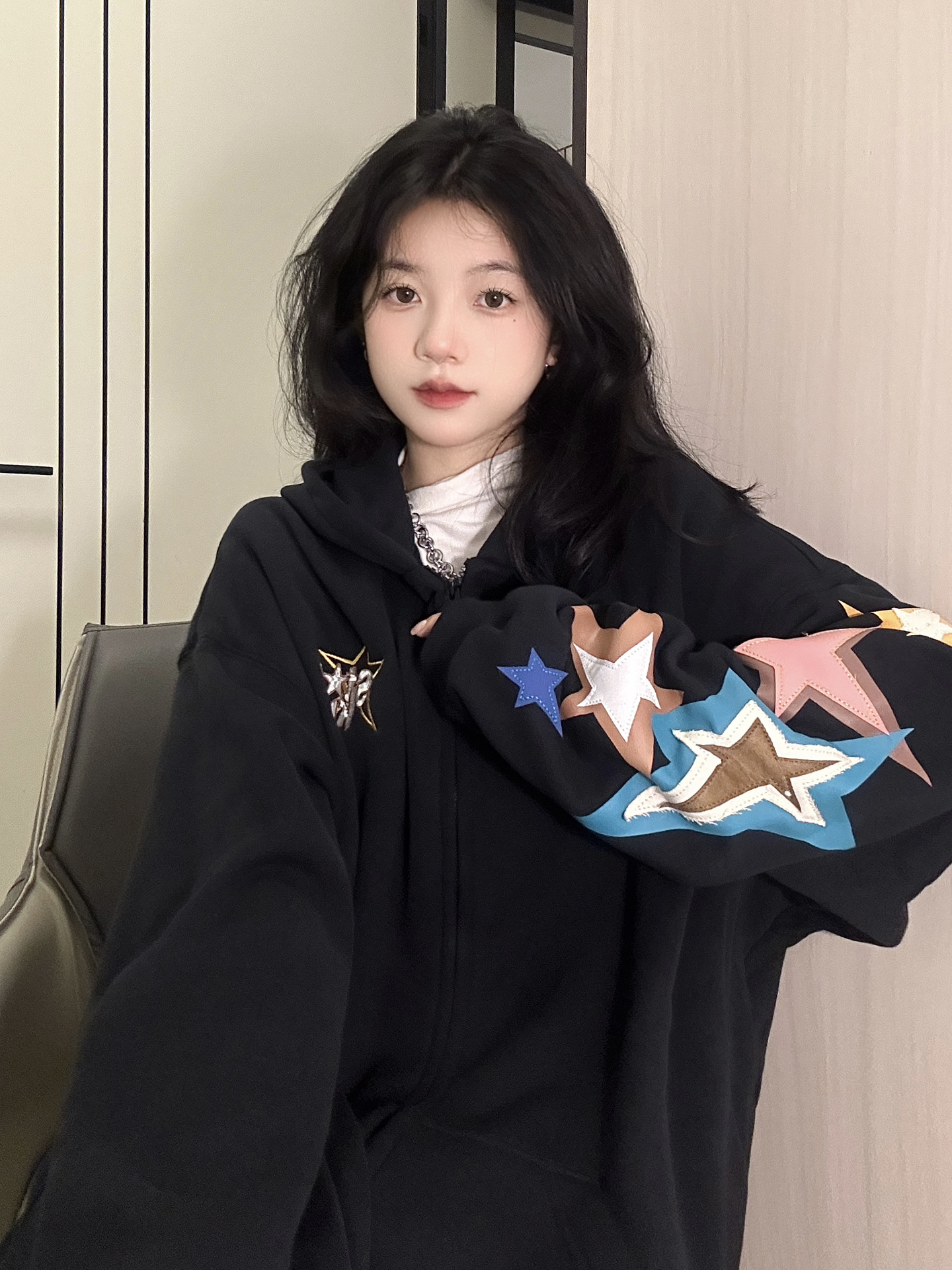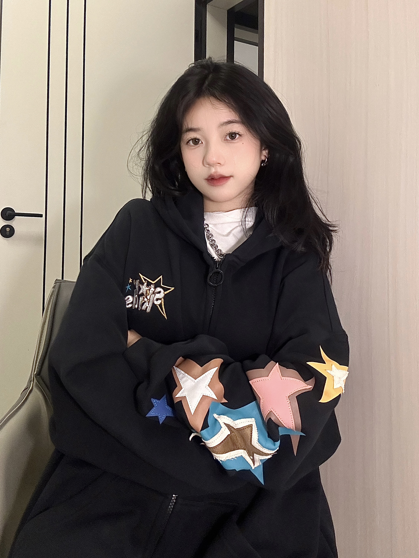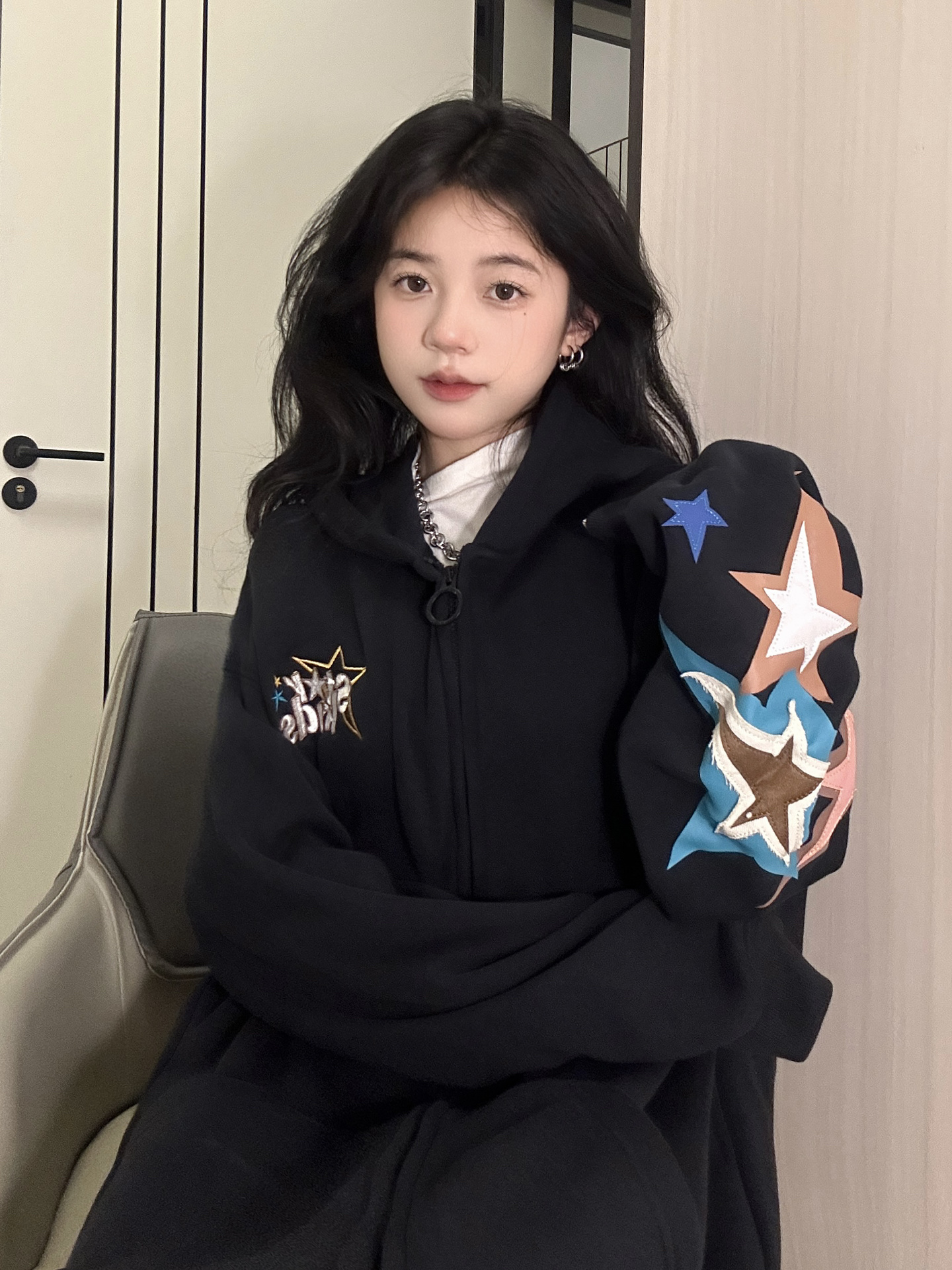 hiphop美式小眾衛衣女春秋季寬鬆oversize慵懶風黑色連帽開衫外套