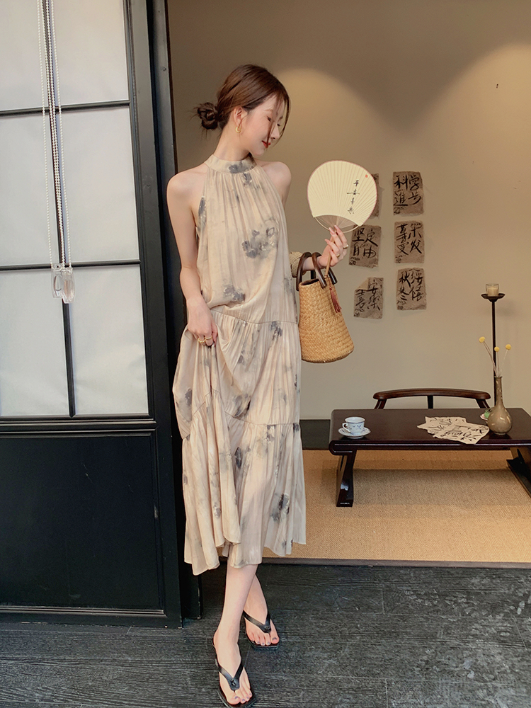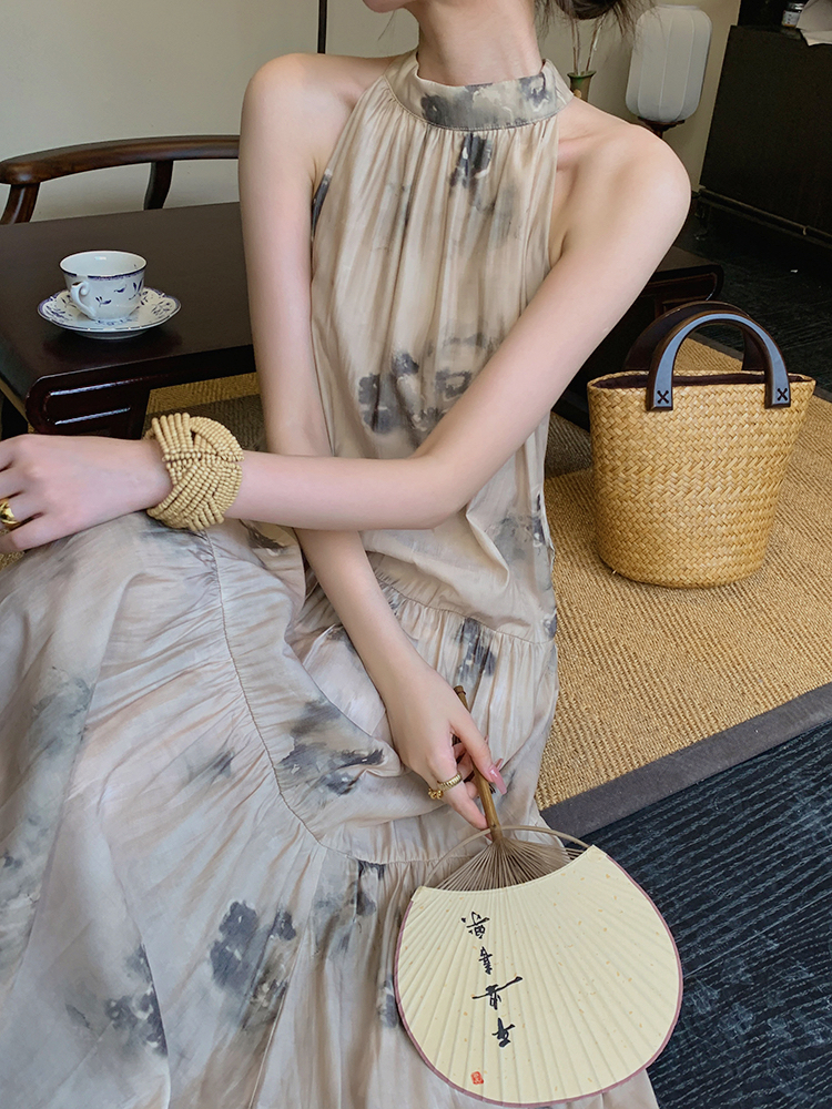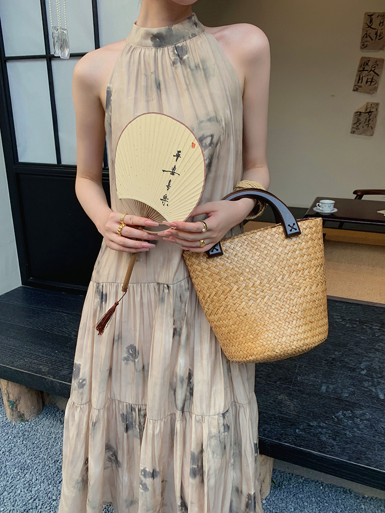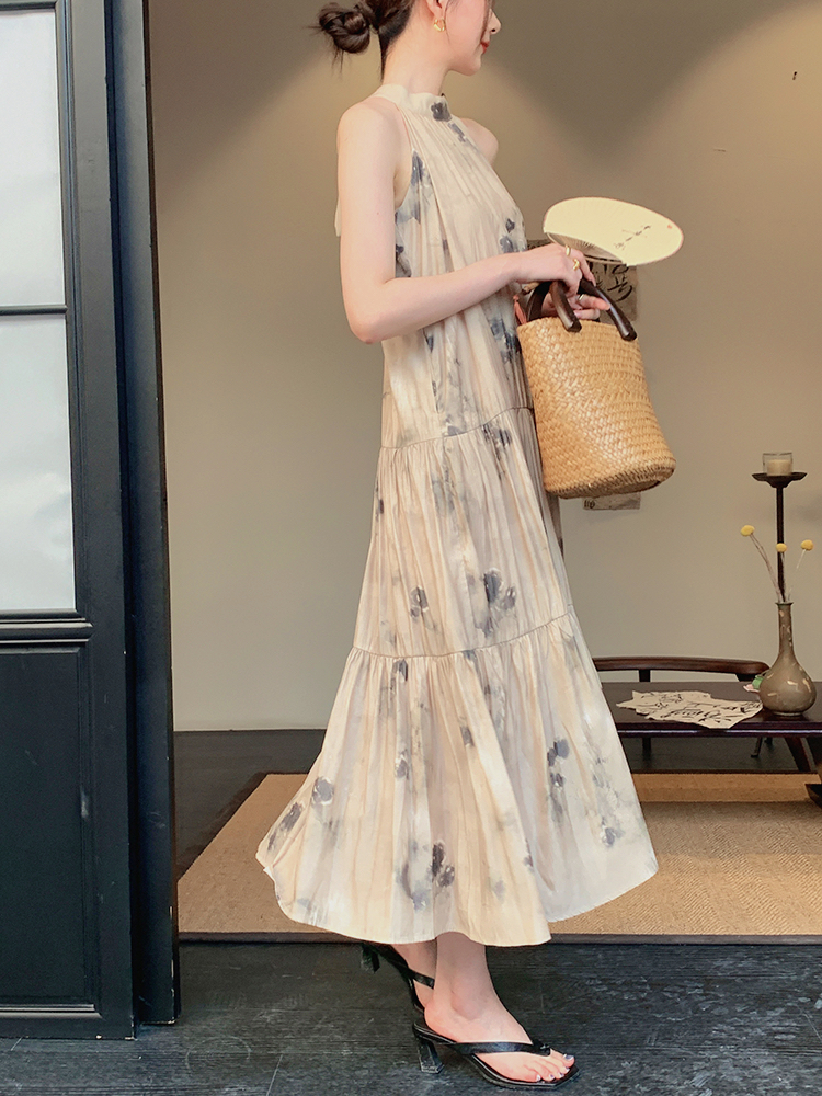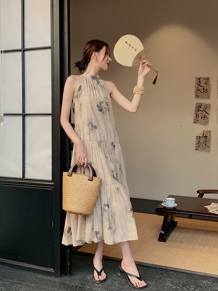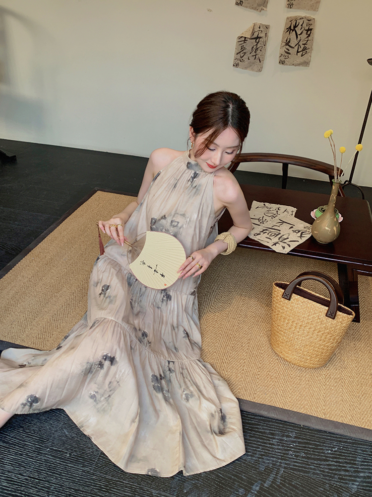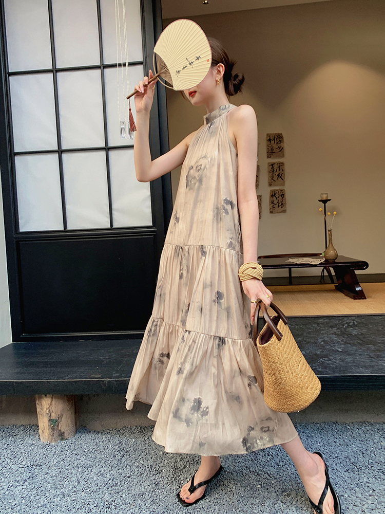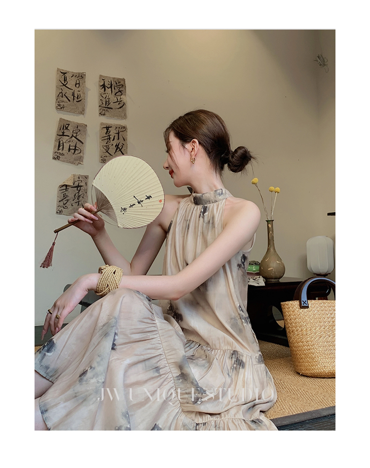 JWUNIQUE杏色高級感無袖洋裝女夏季2023新款寬鬆新中式國風裙子