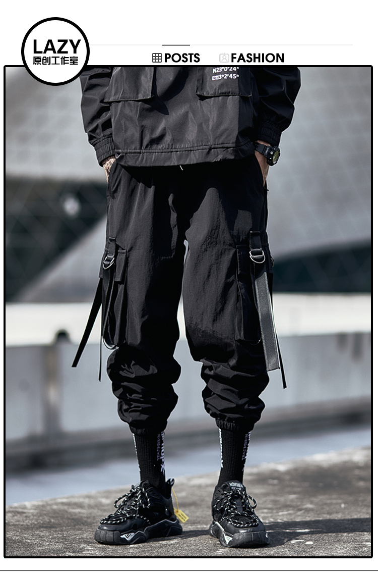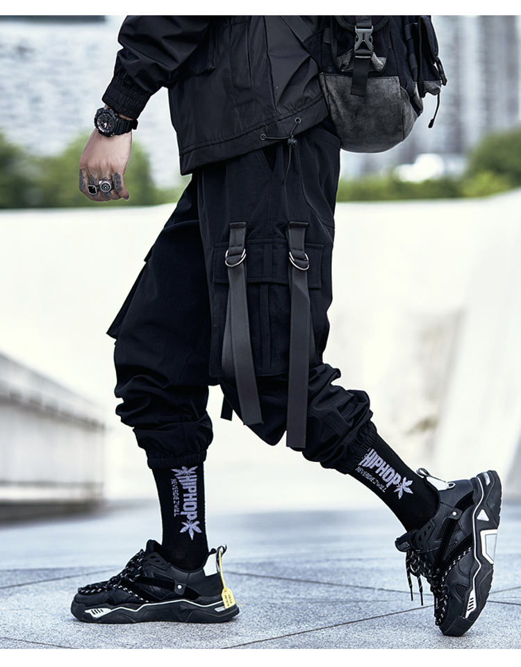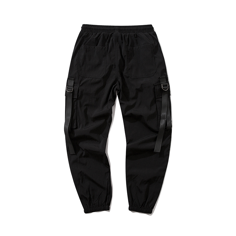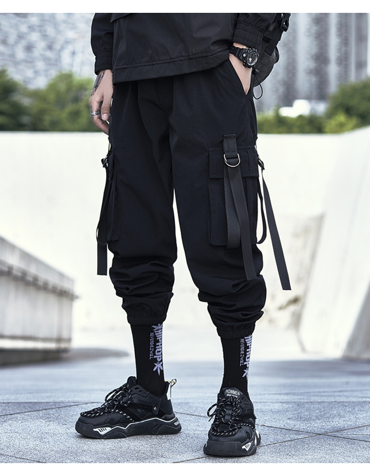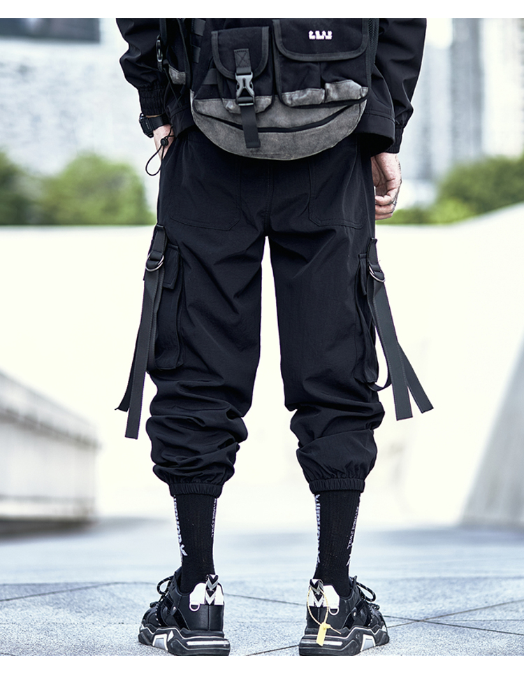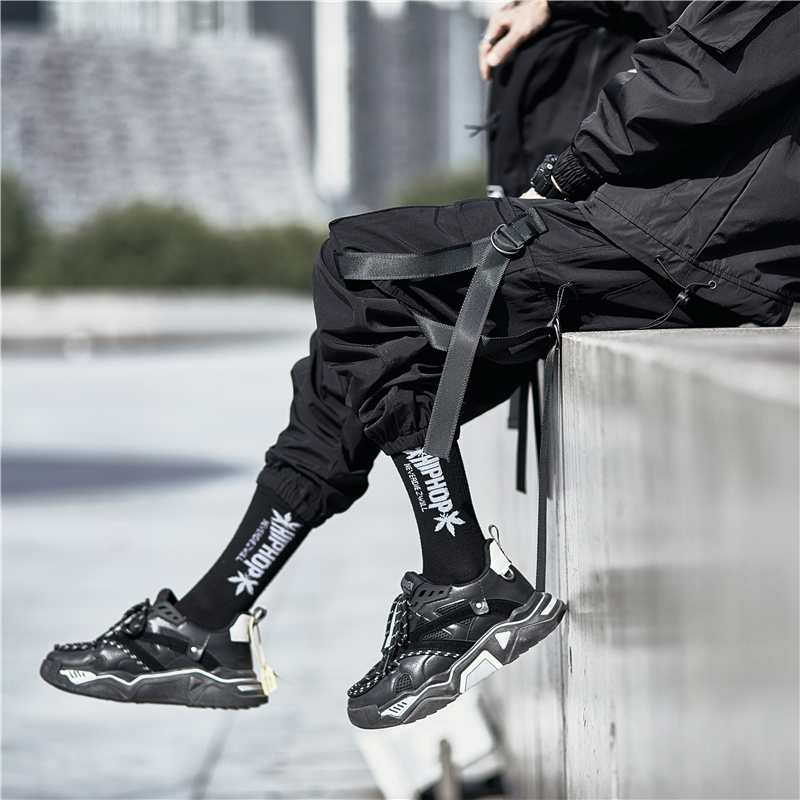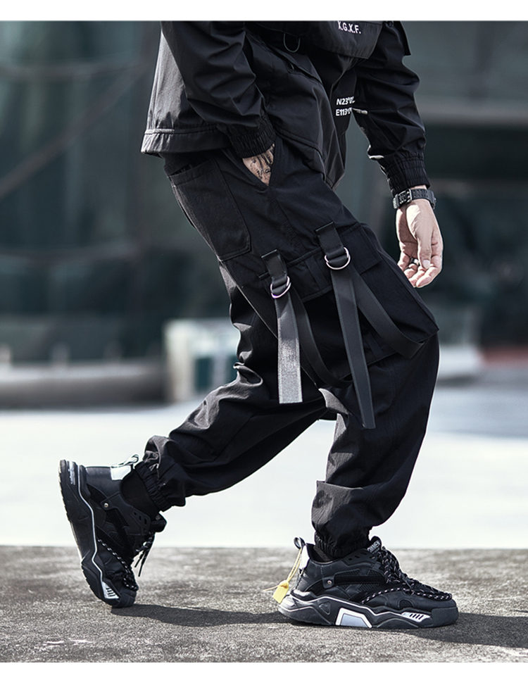 暗黑機能風工裝褲男潮牌寬鬆痞帥飄帶束腳傘兵褲春秋季休閒長褲