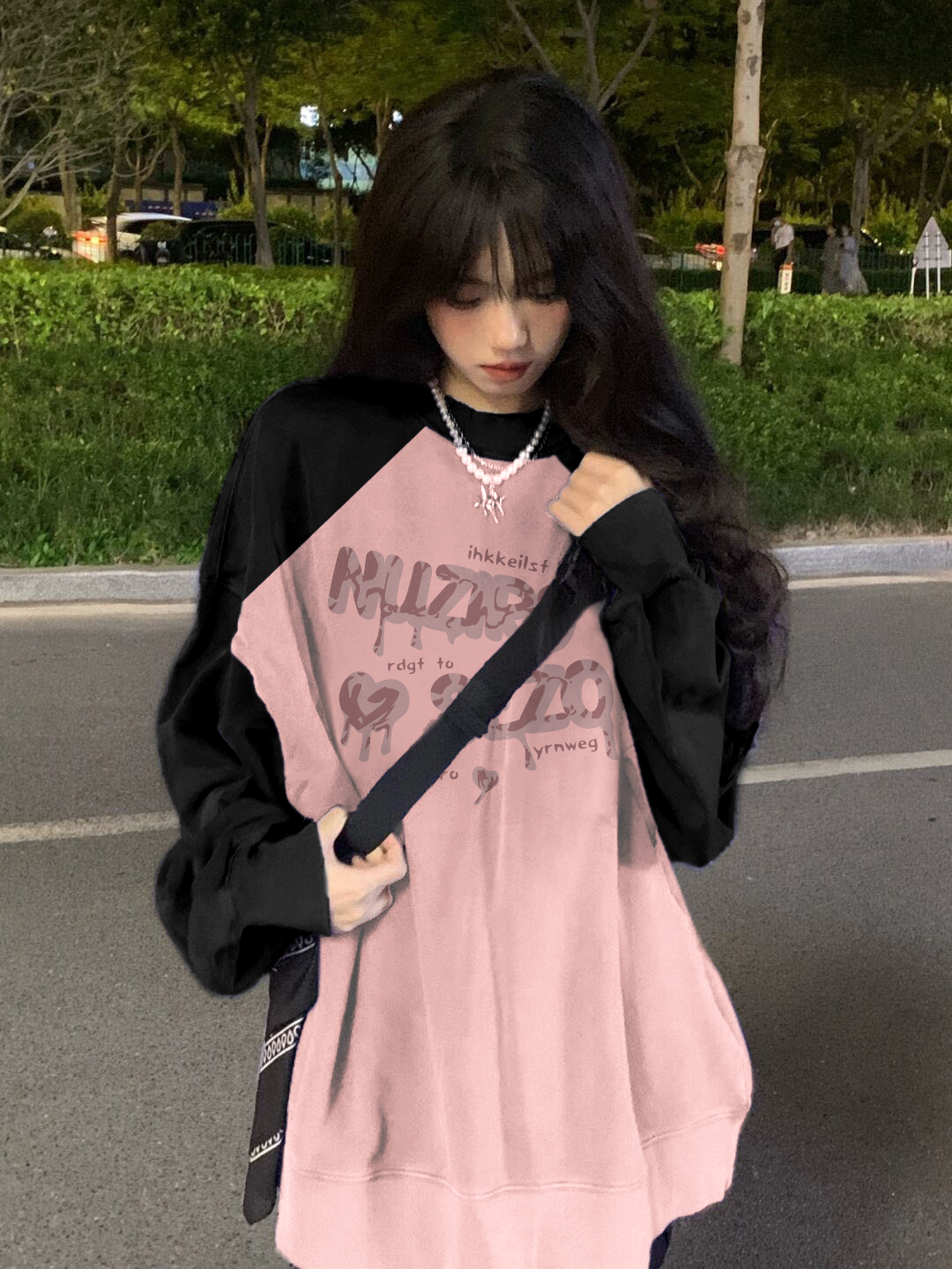 黑粉撞色插肩长袖T恤女春秋2023新款宽松oversize显瘦打底衫上衣