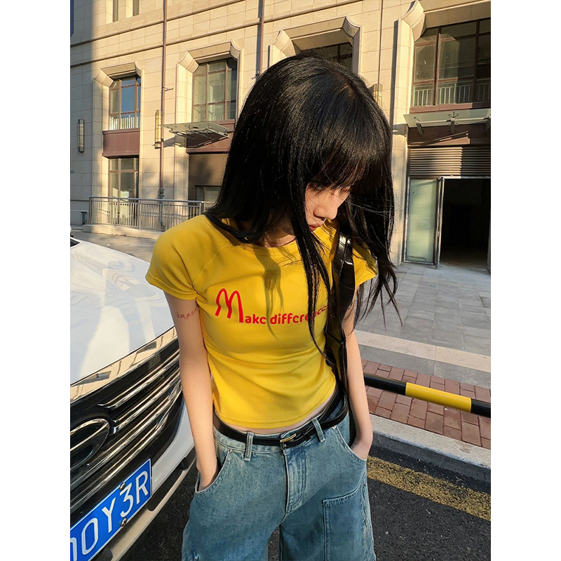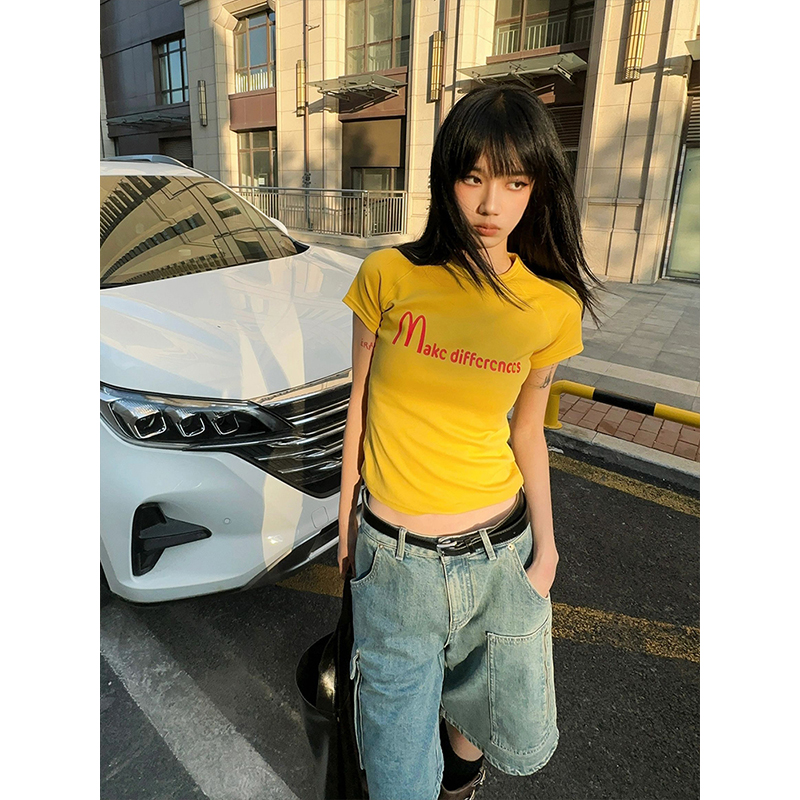 夏日多巴胺穿搭短版t恤女2023新款美式辣妹彈力修身純欲風上衣ins