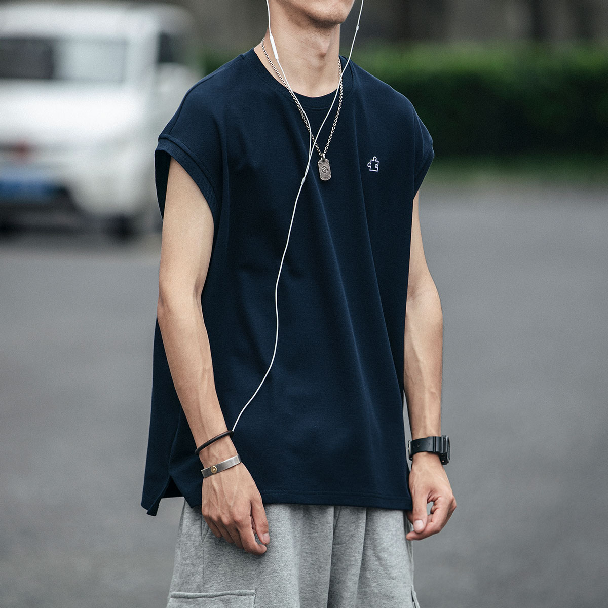 日系復古百搭無袖T恤男夏季韓版潮流運動汗背心馬甲2022新款短袖