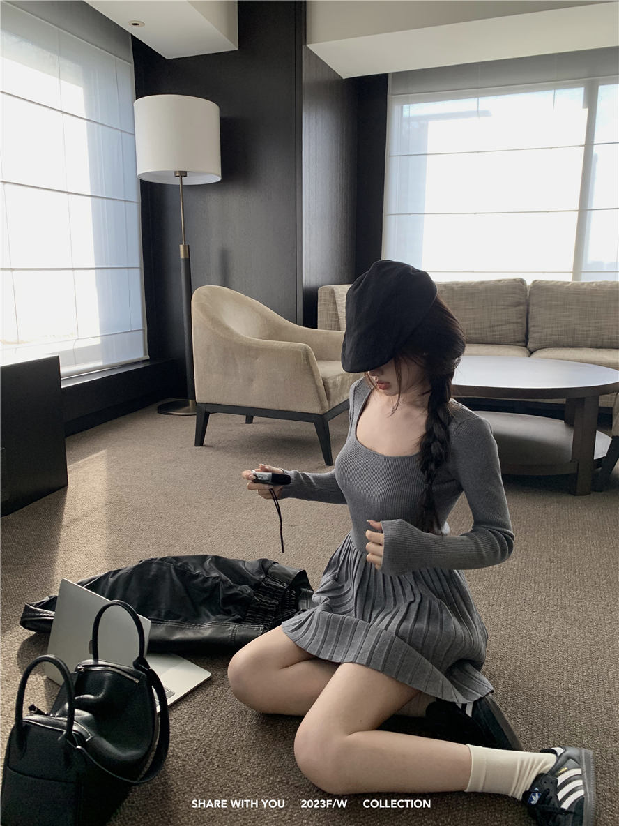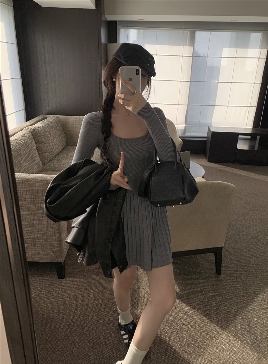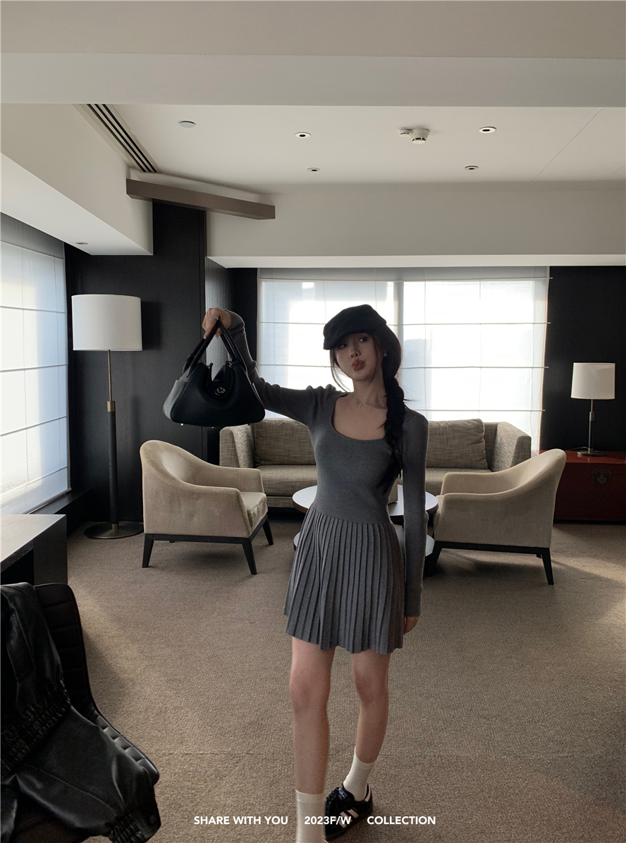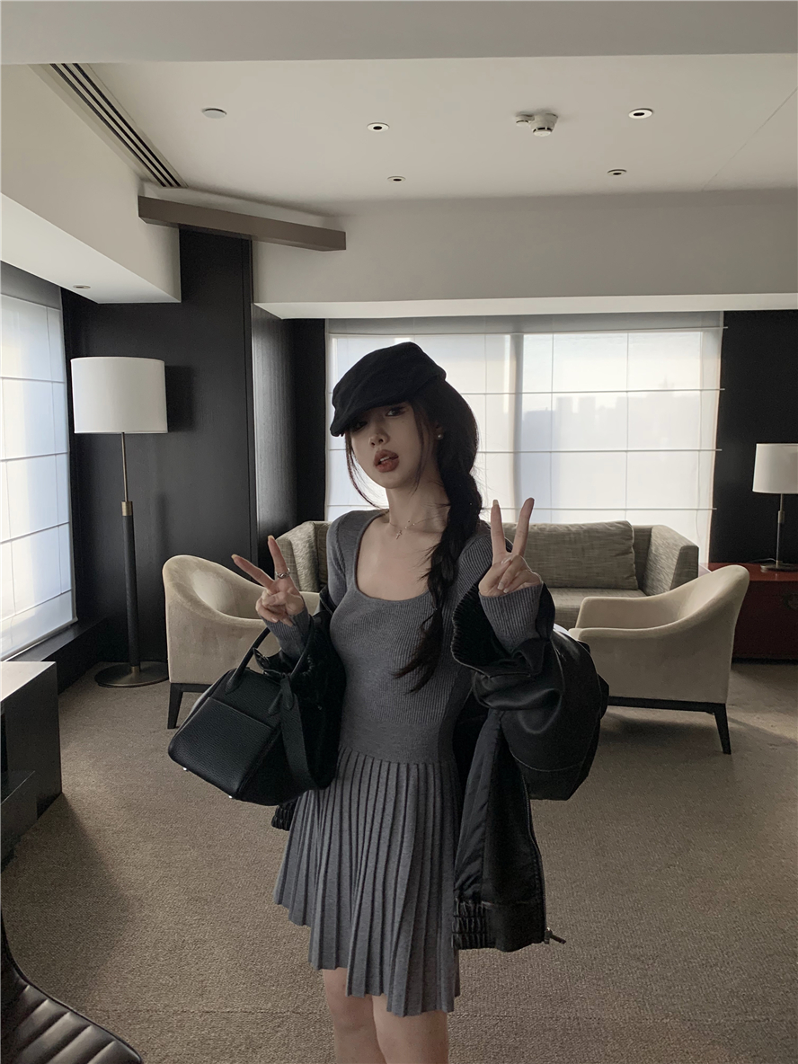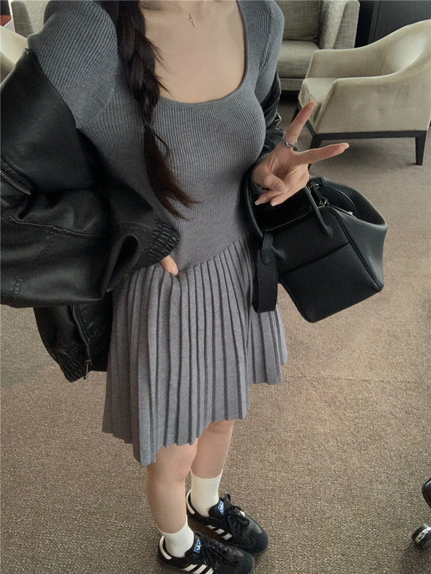 法式氣質長袖灰色針織洋裝女秋季修身百褶裙內搭短裙子打底裙潮