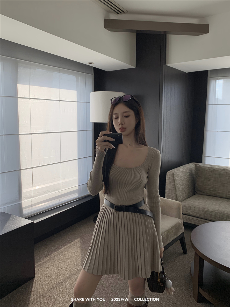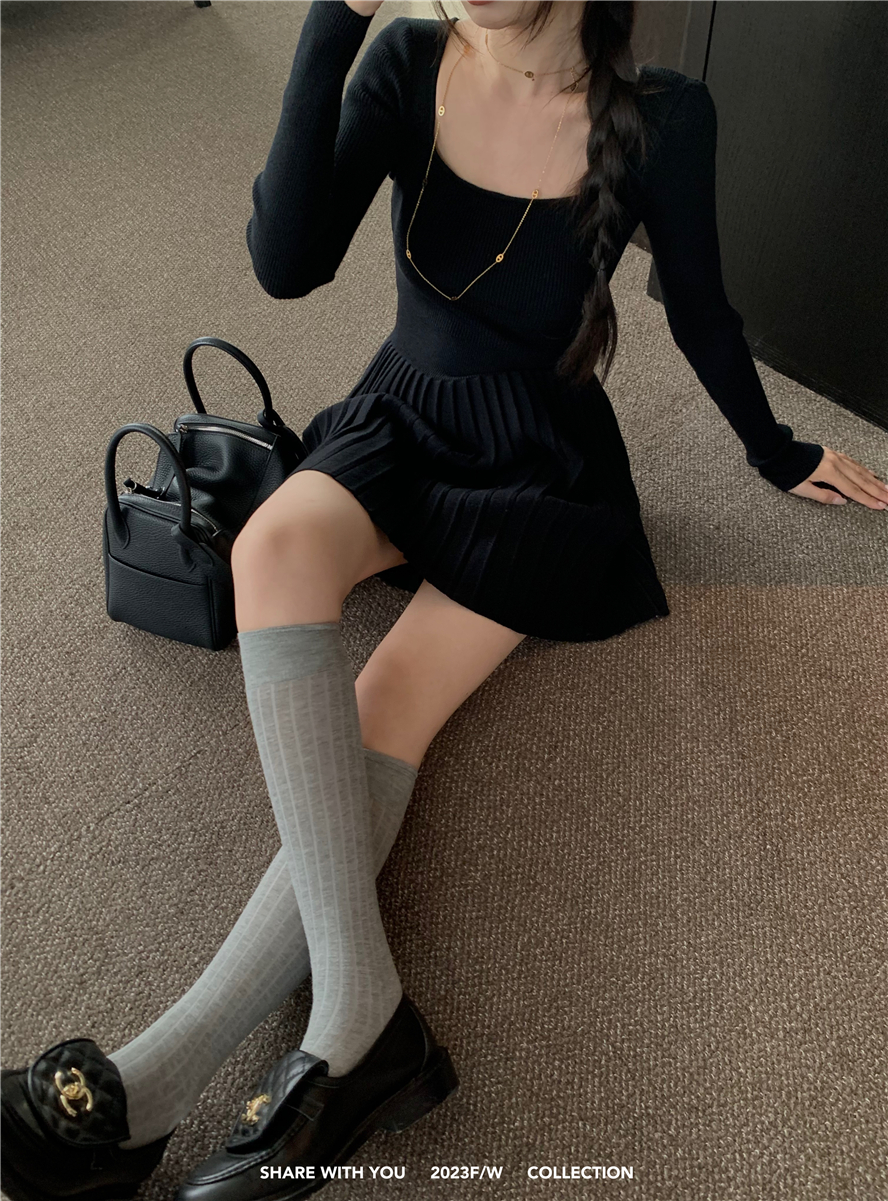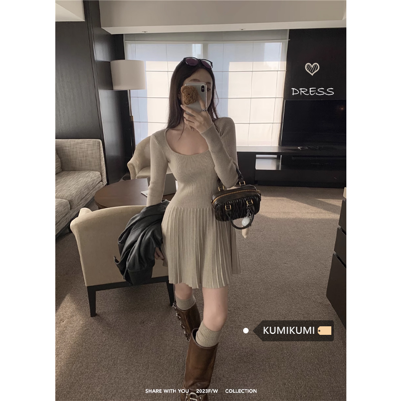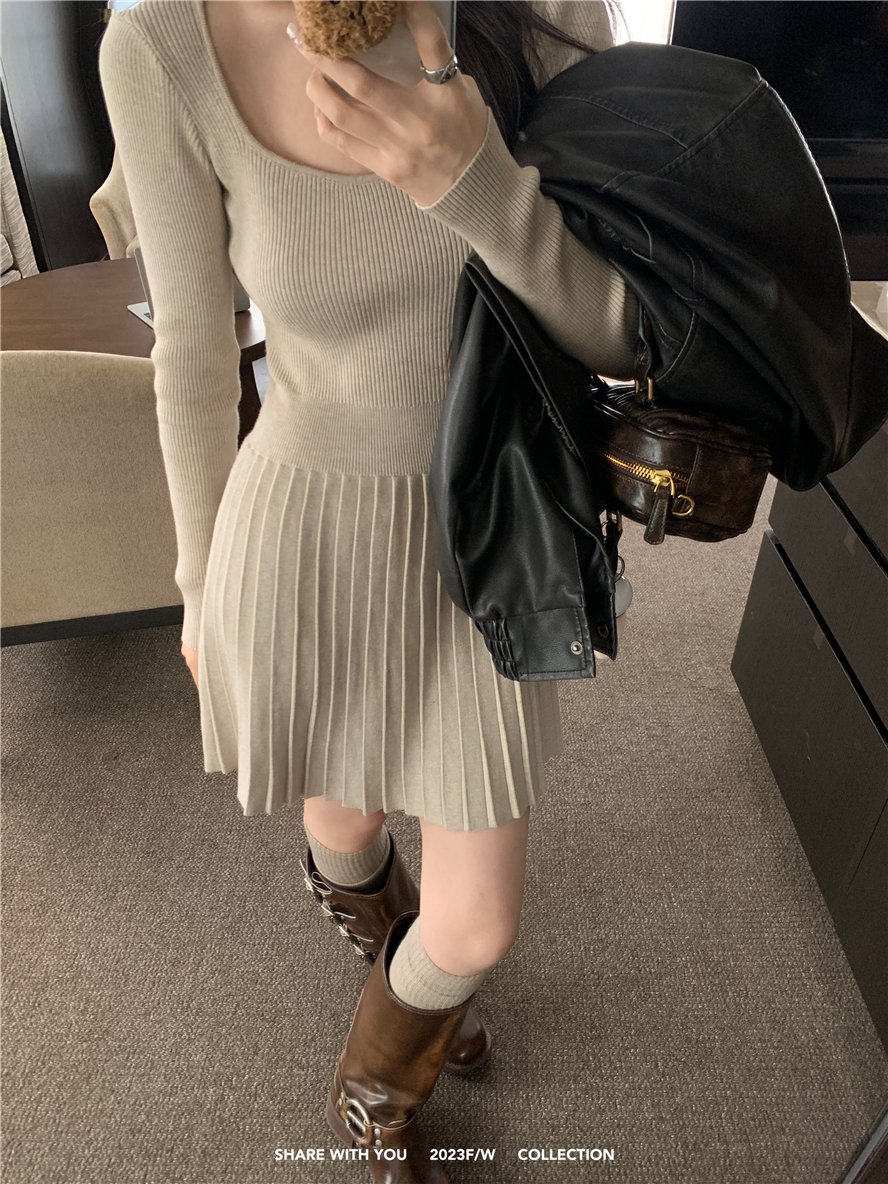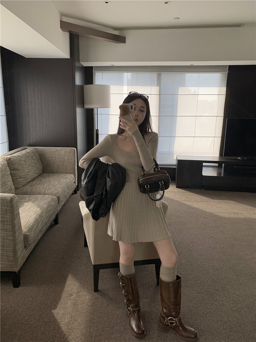 法式氣質長袖灰色針織洋裝女秋季修身百褶裙內搭短裙子打底裙潮