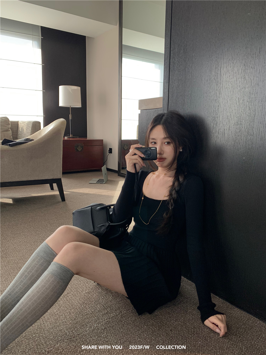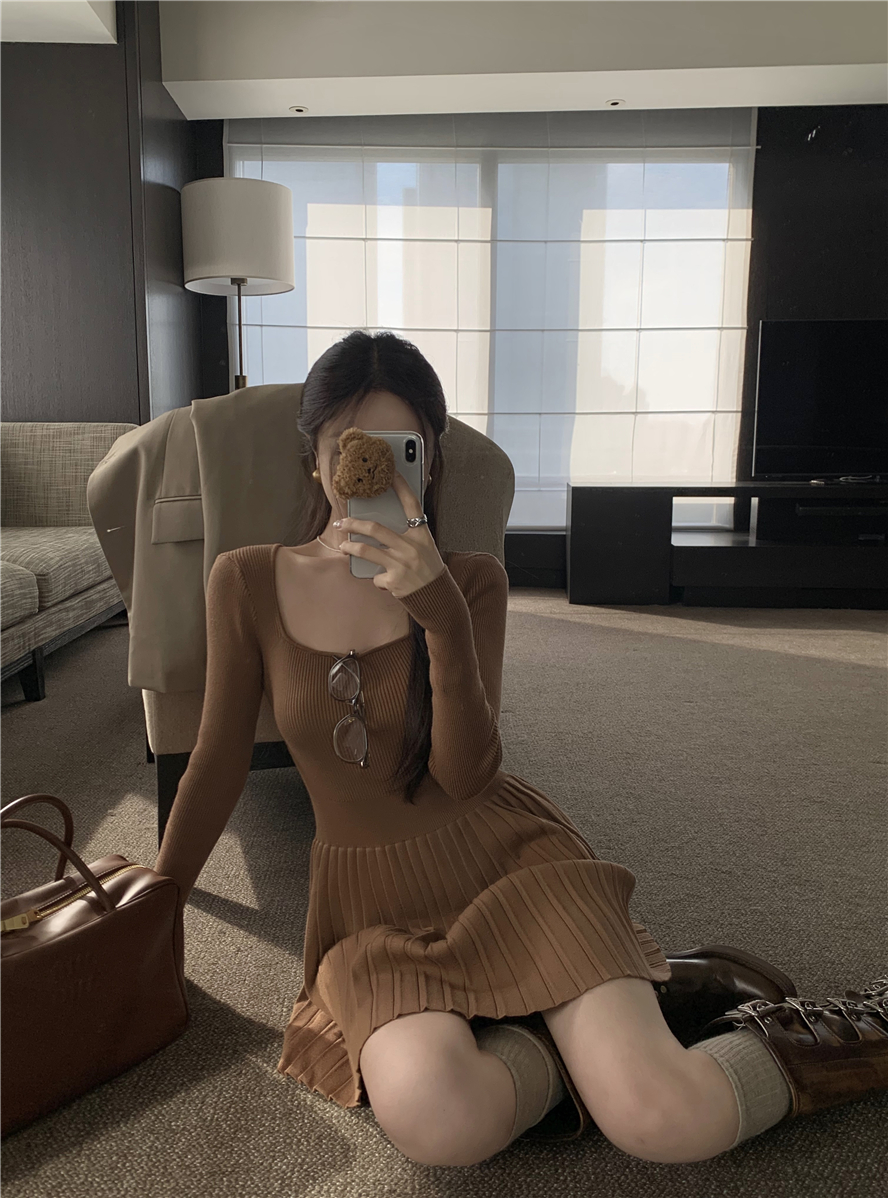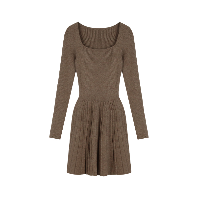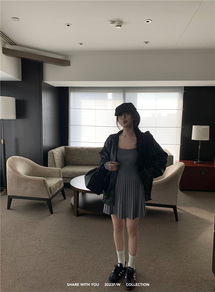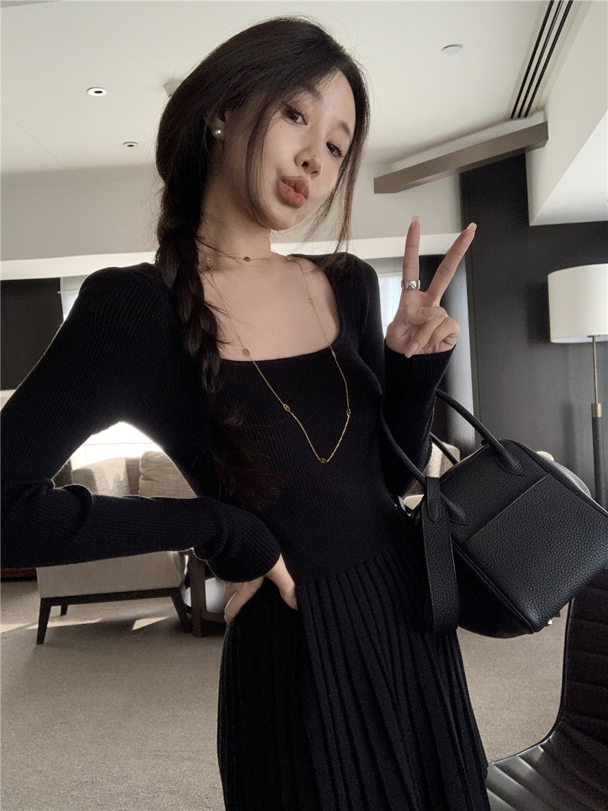 法式氣質長袖灰色針織洋裝女秋季修身百褶裙內搭短裙子打底裙潮