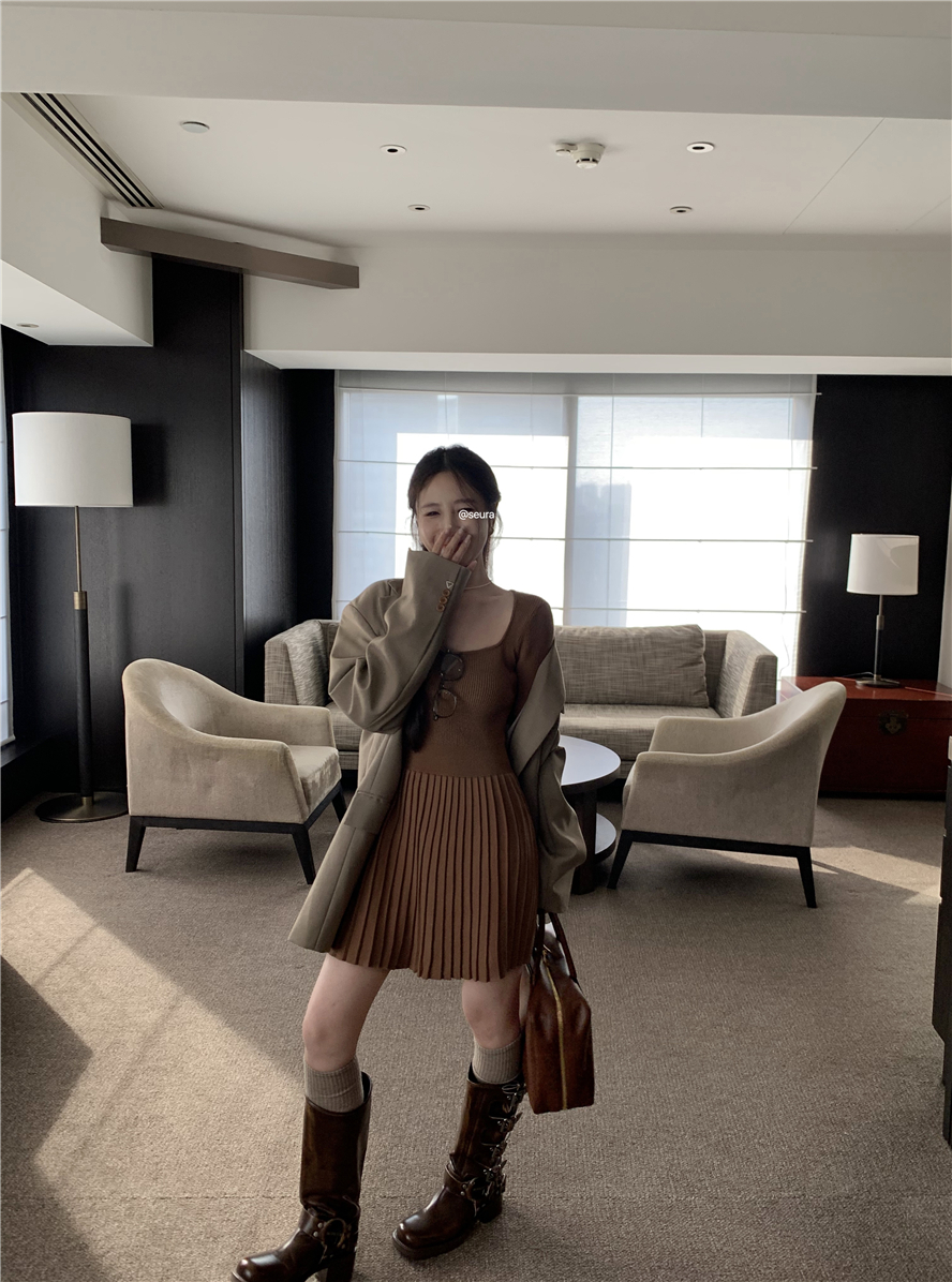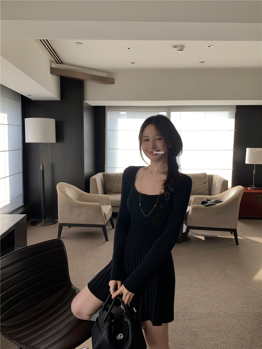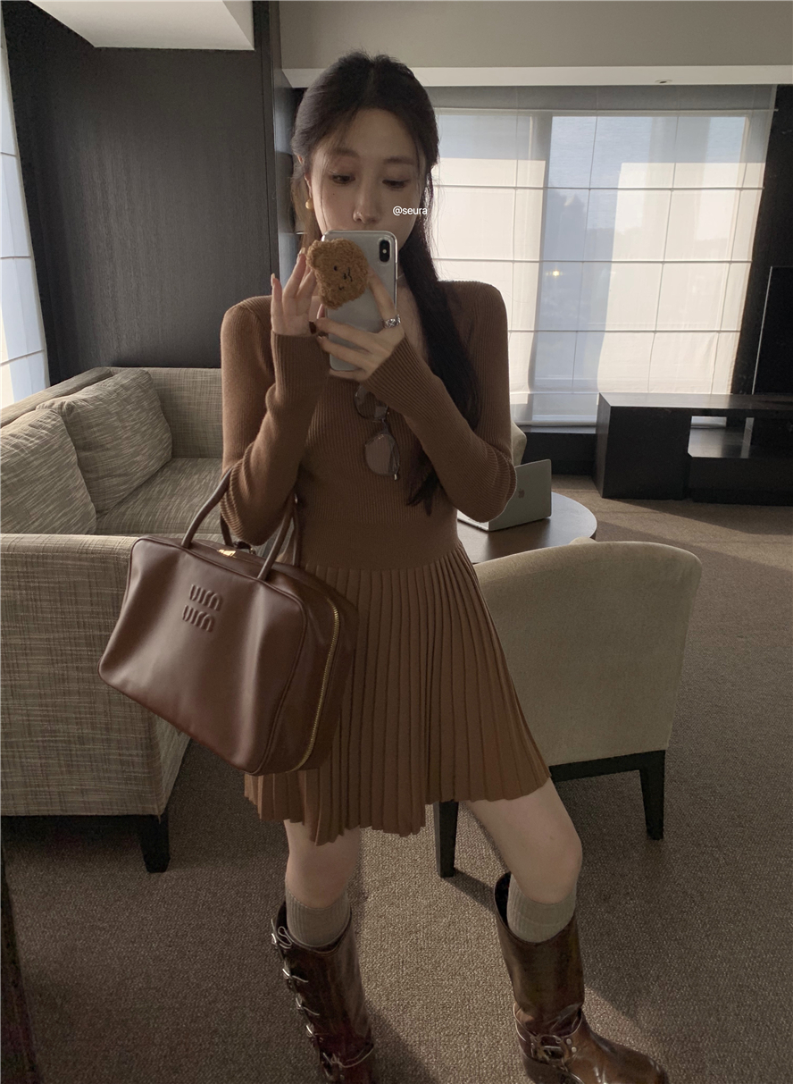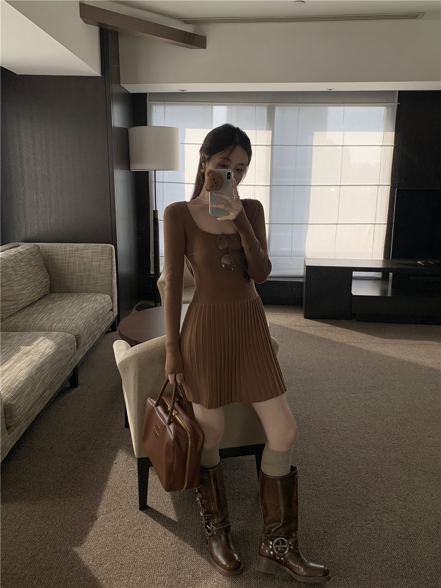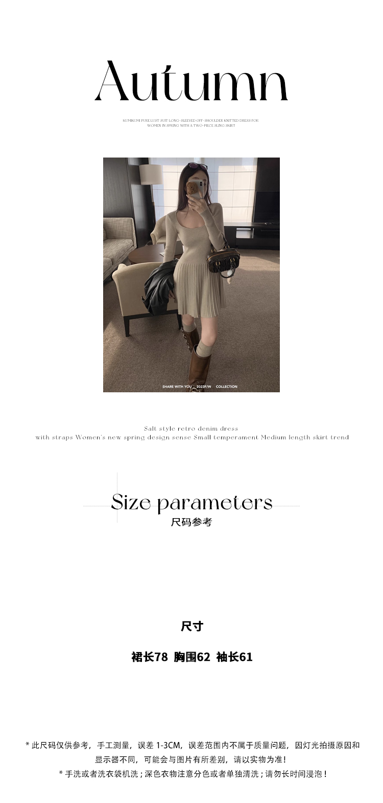 法式氣質長袖灰色針織洋裝女秋季修身百褶裙內搭短裙子打底裙潮