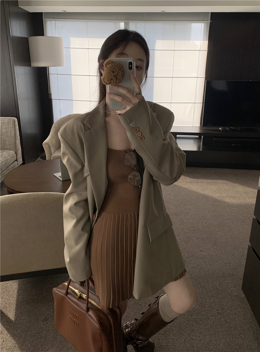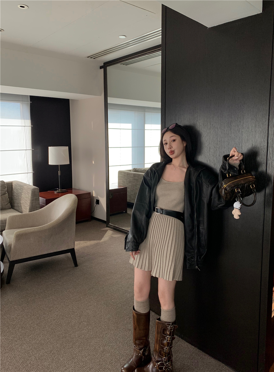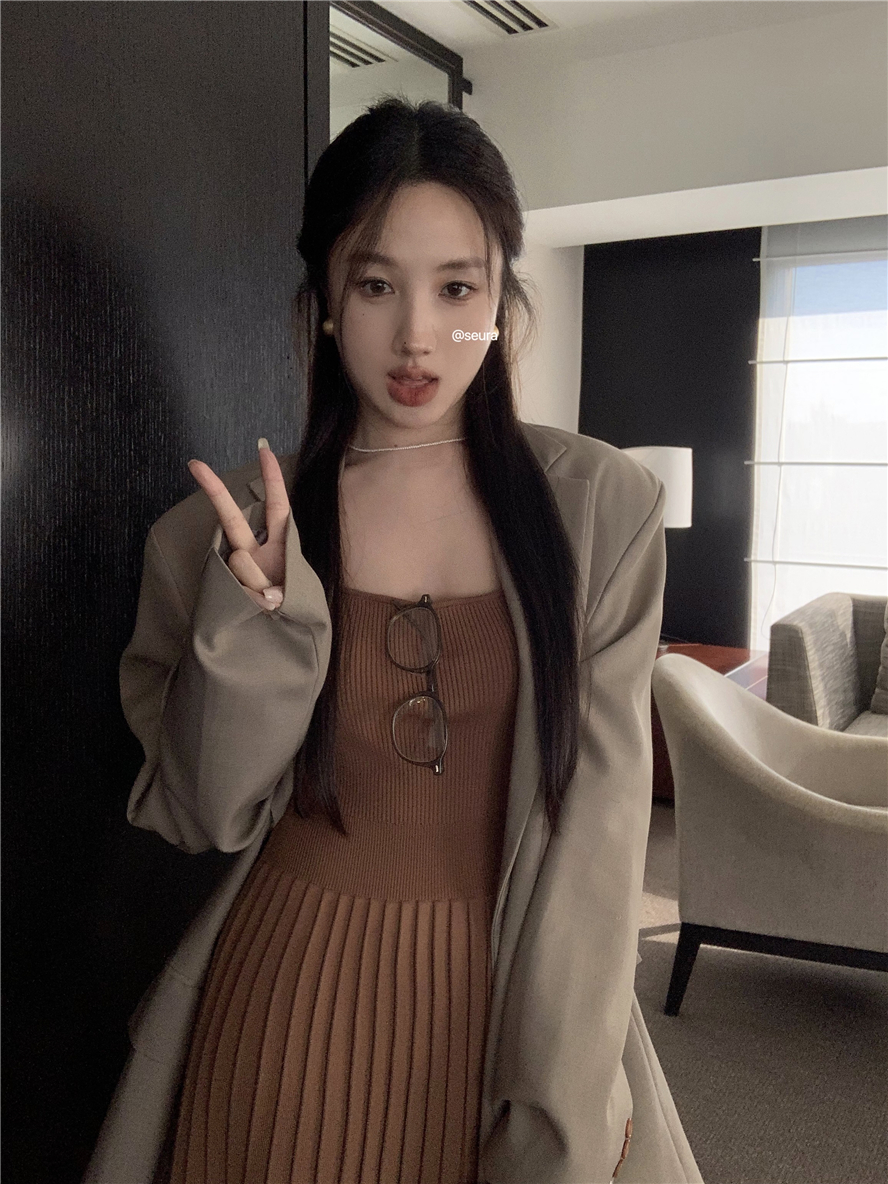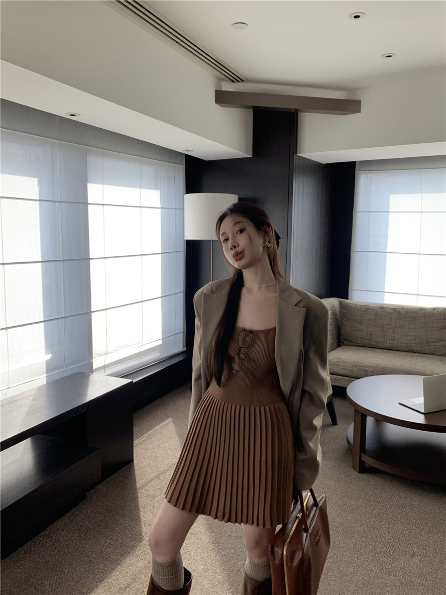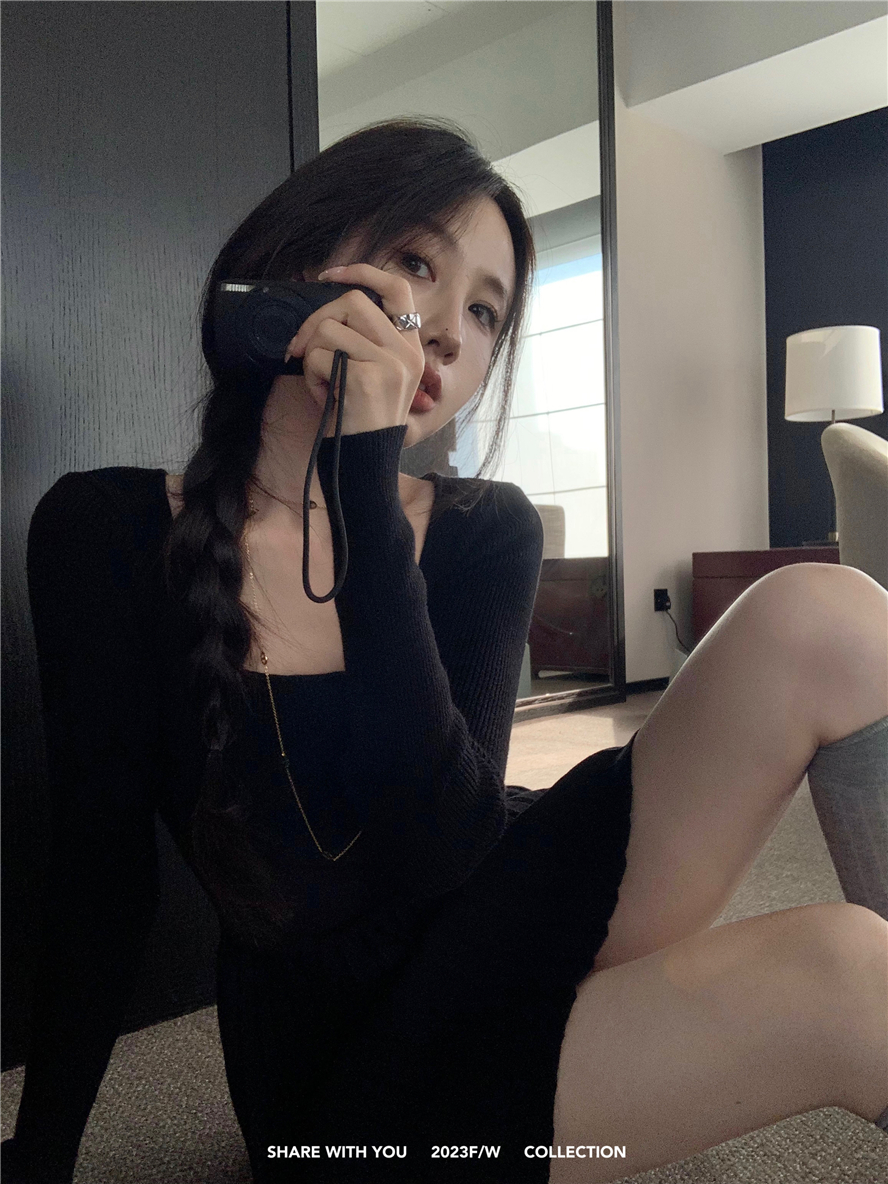 法式氣質長袖灰色針織洋裝女秋季修身百褶裙內搭短裙子打底裙潮