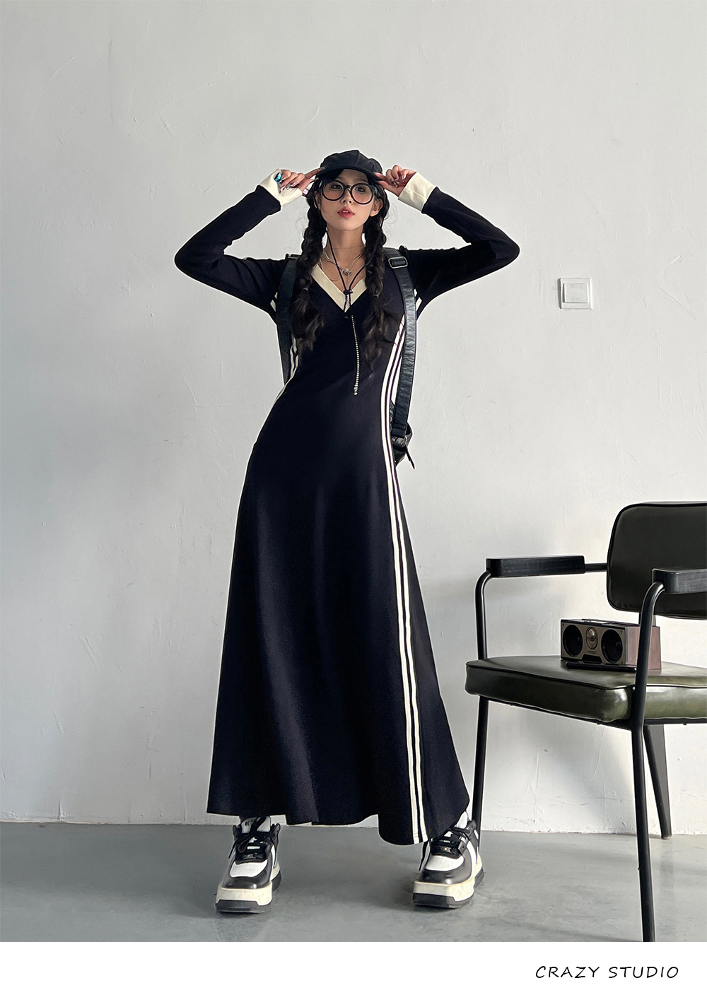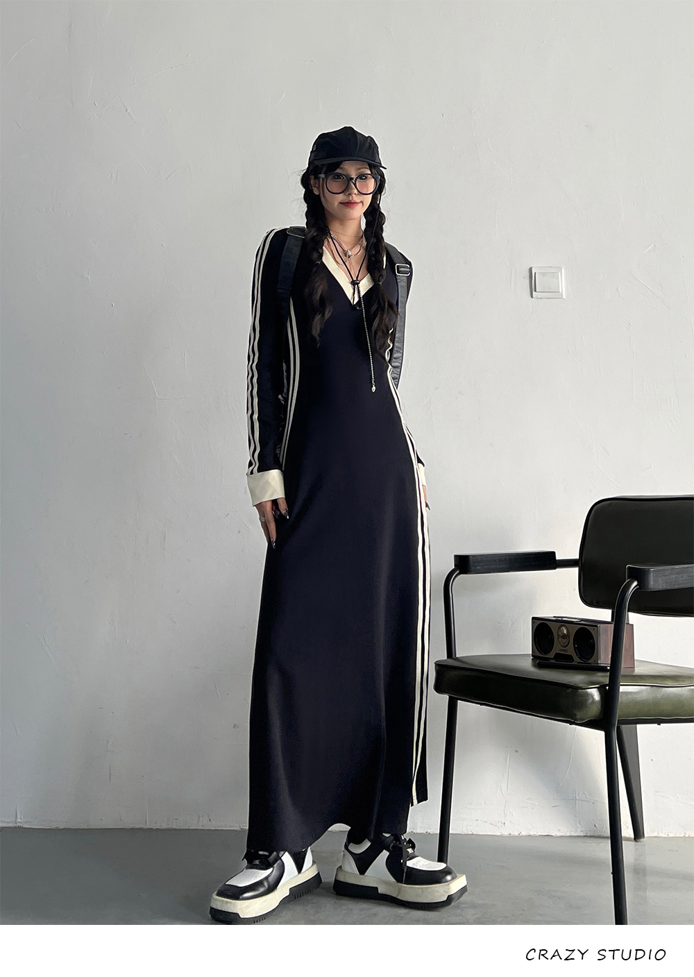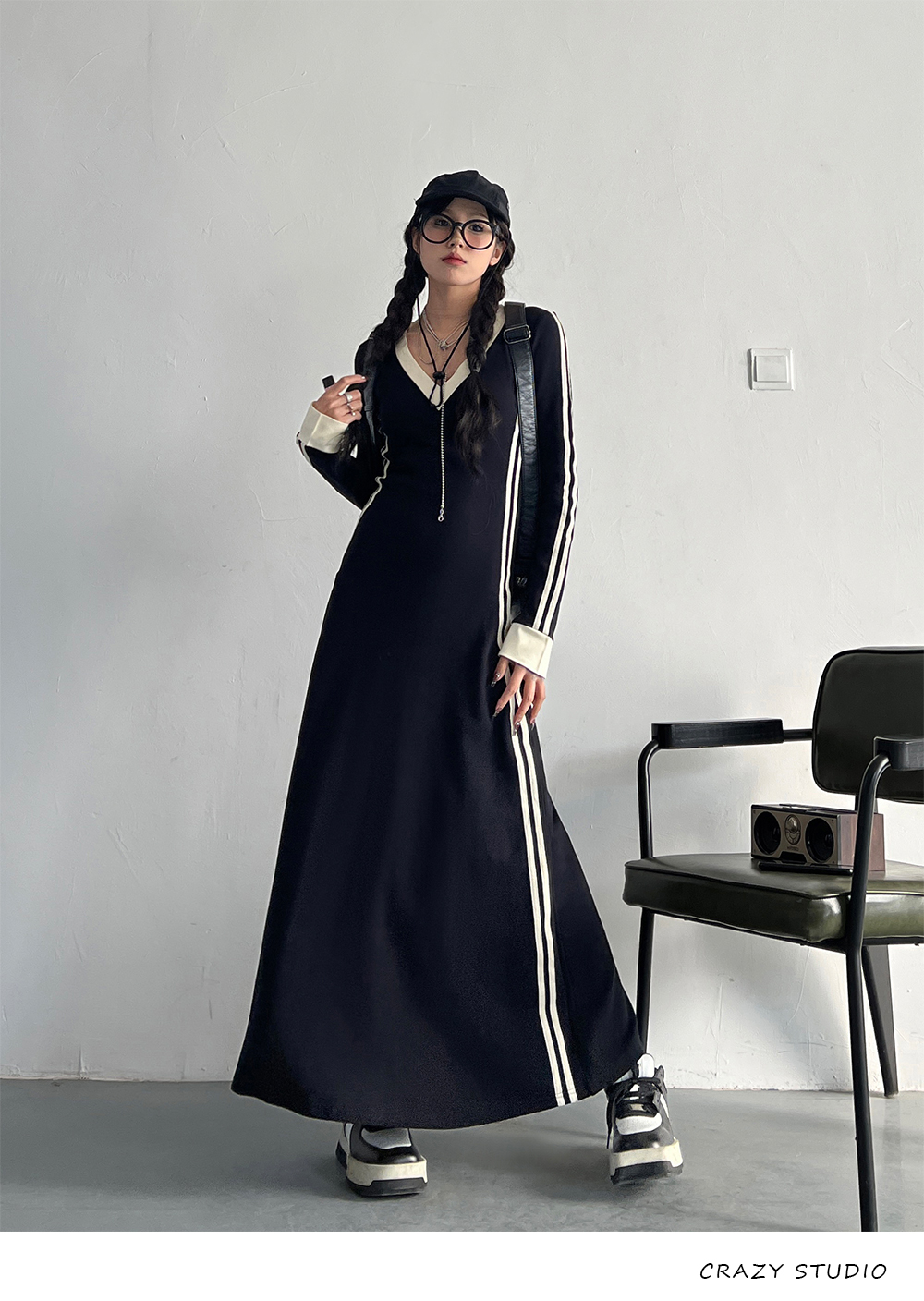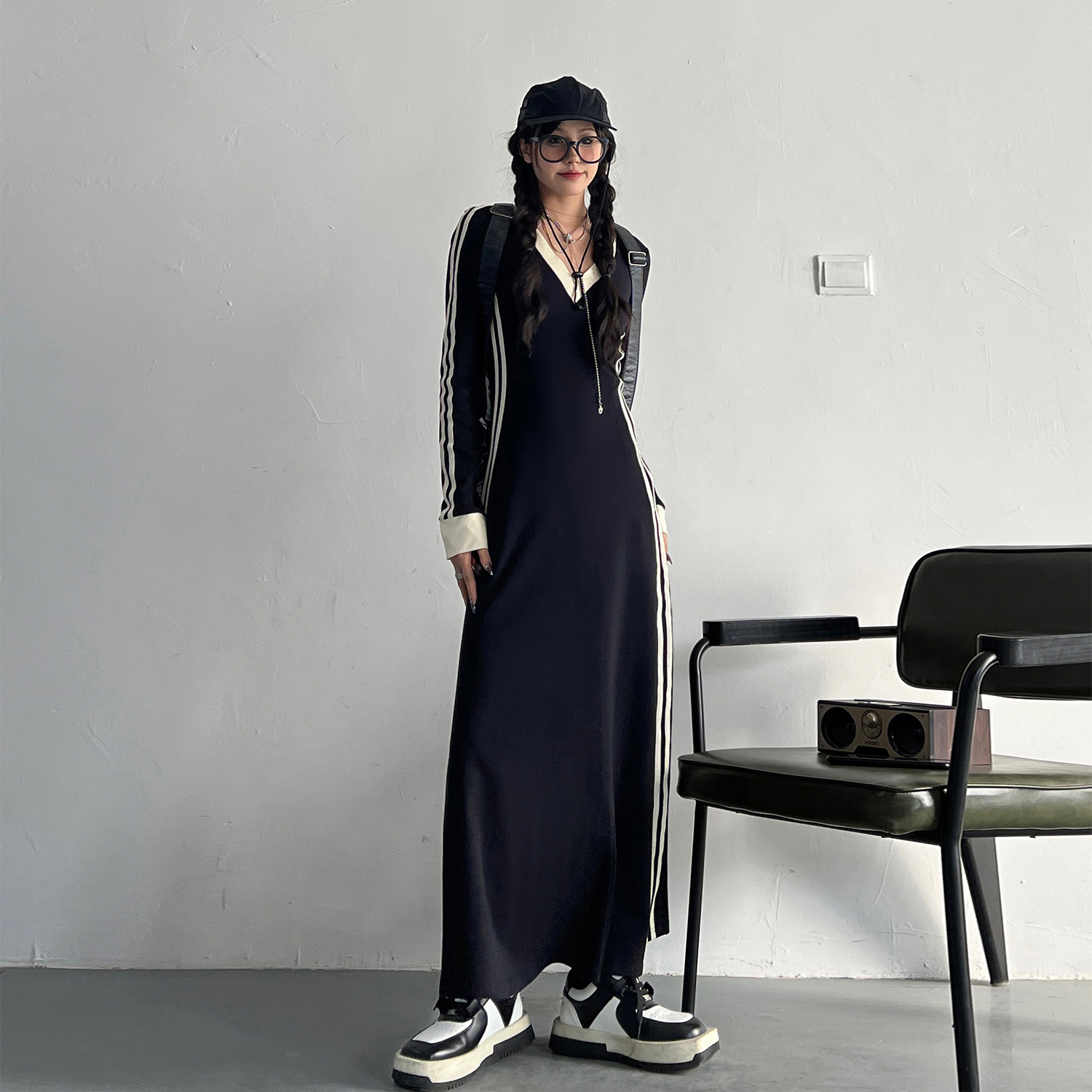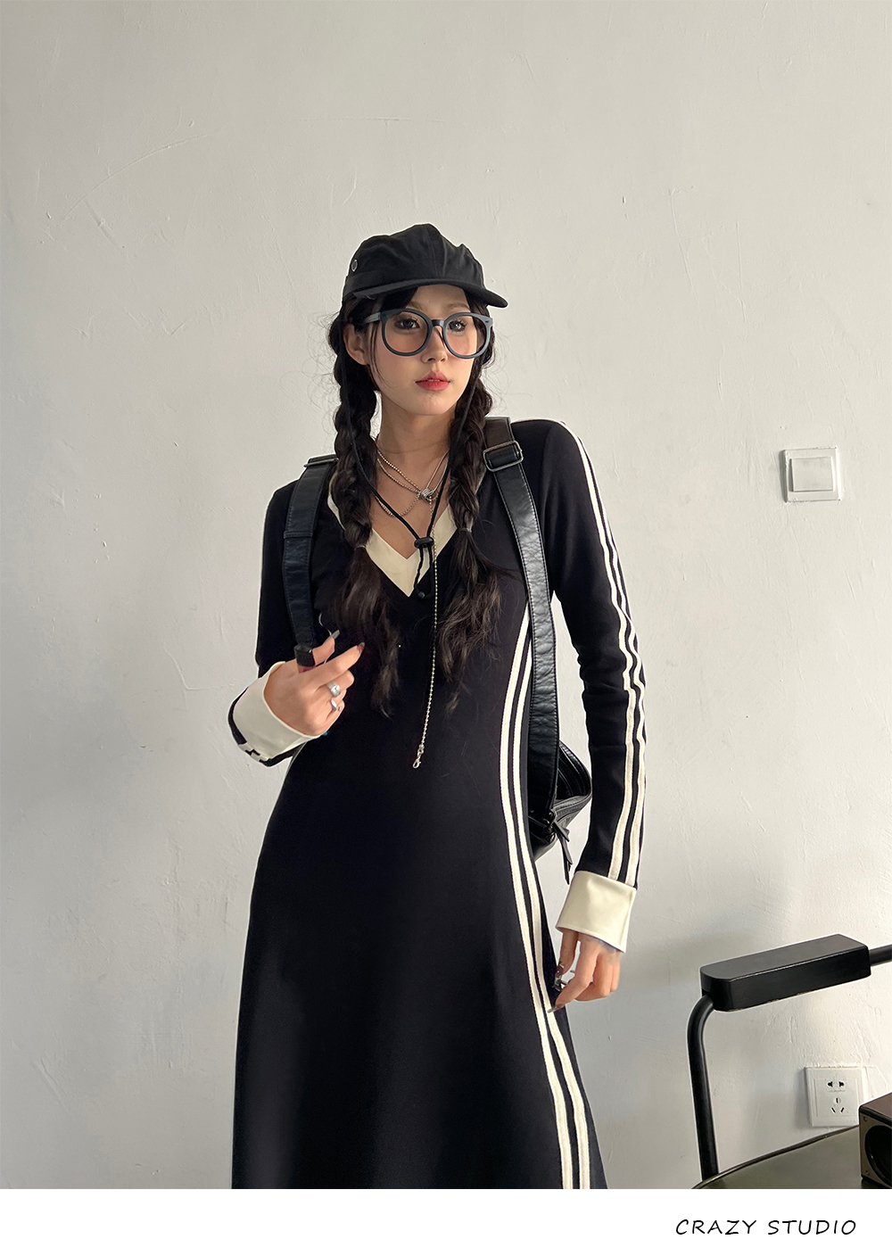 2023新款V領休閒學院風薄款氣質條紋黑色長袖洋裝女長版裙子
