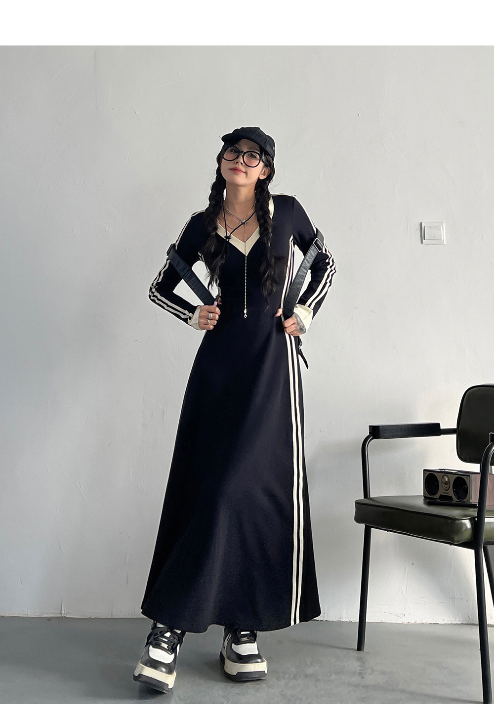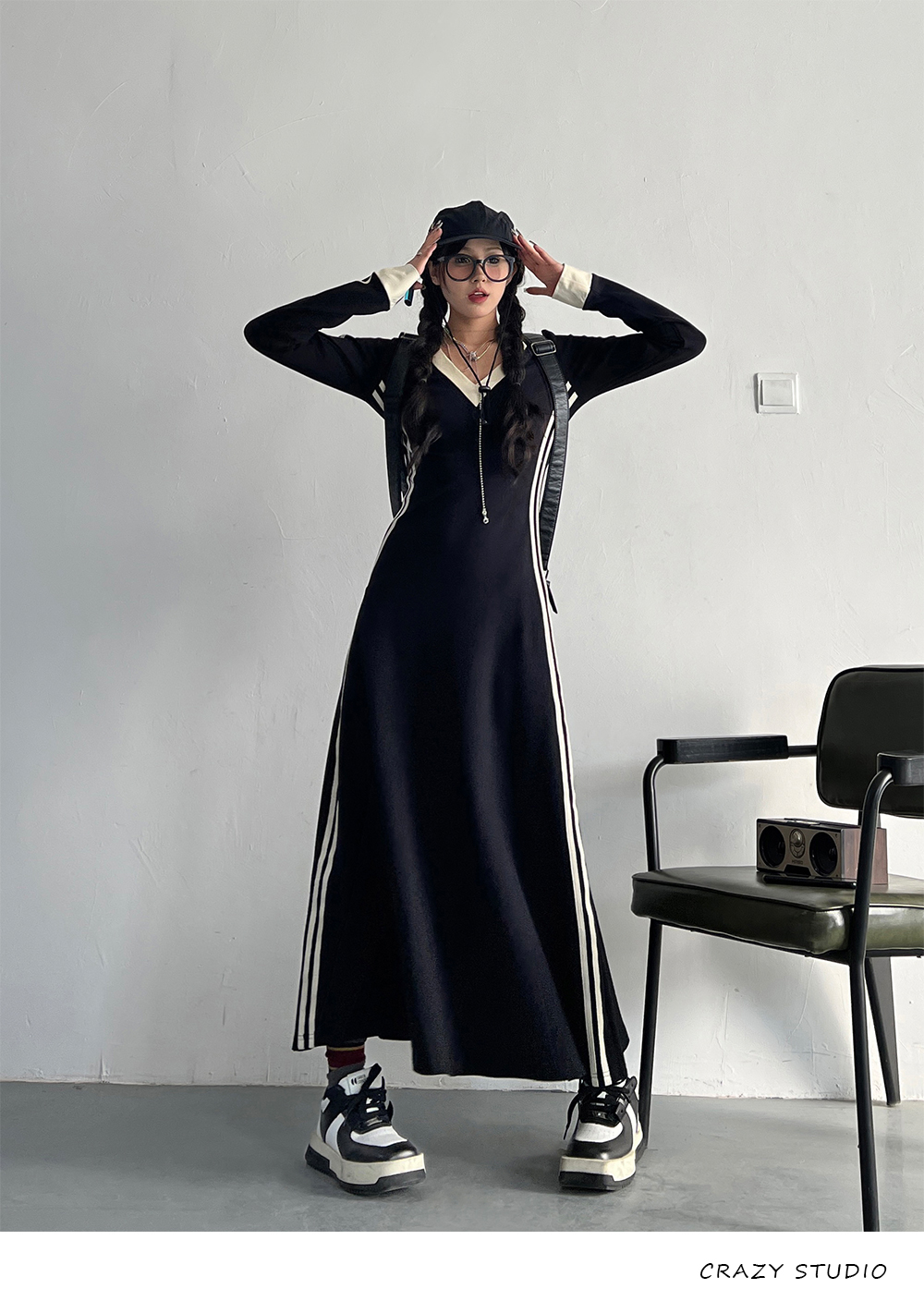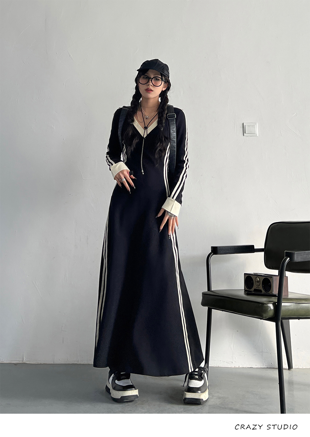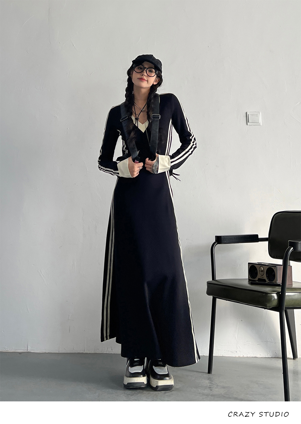 2023新款V領休閒學院風薄款氣質條紋黑色長袖洋裝女長版裙子