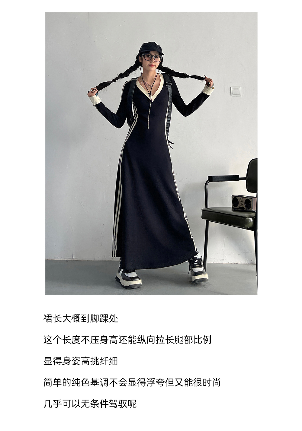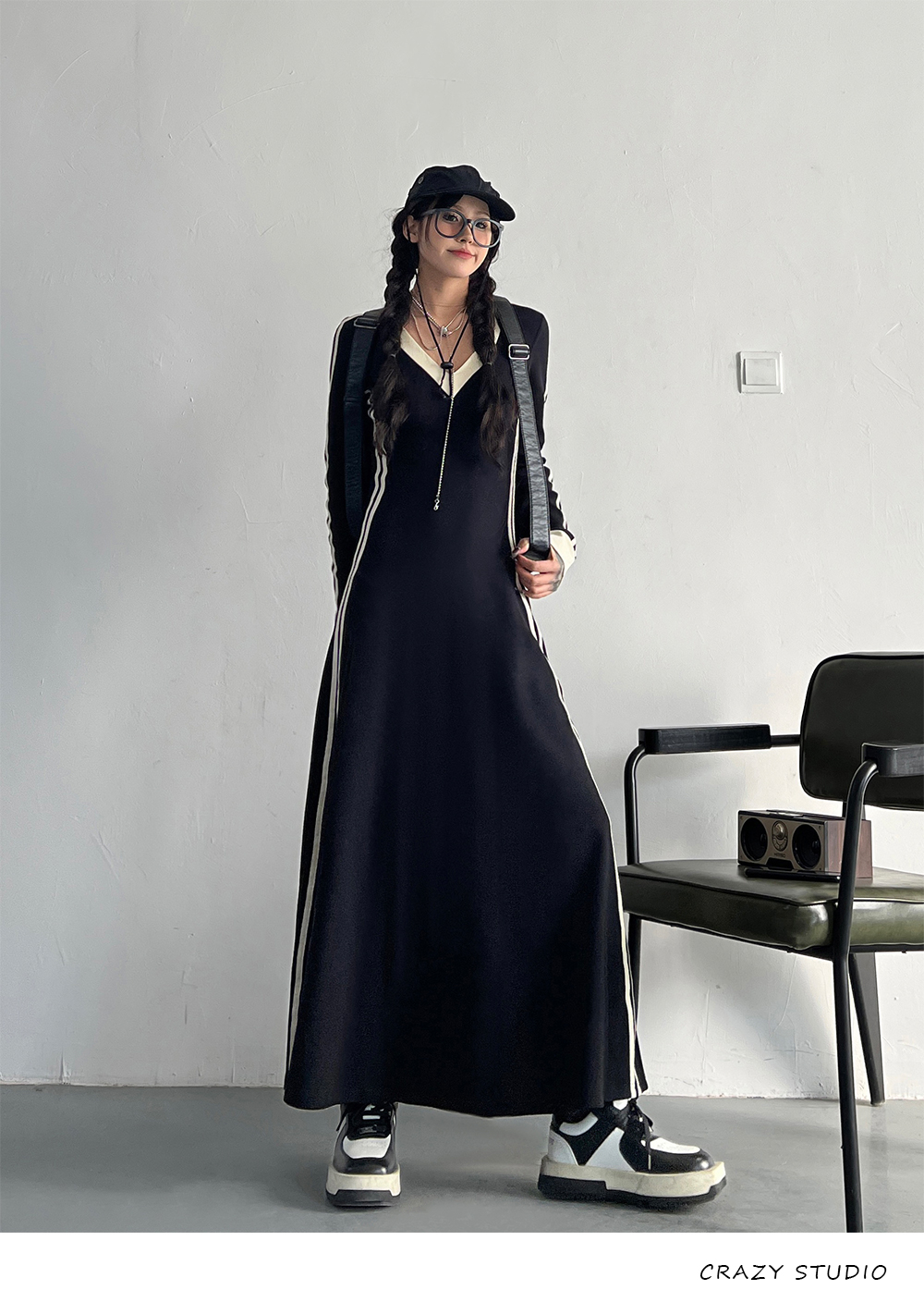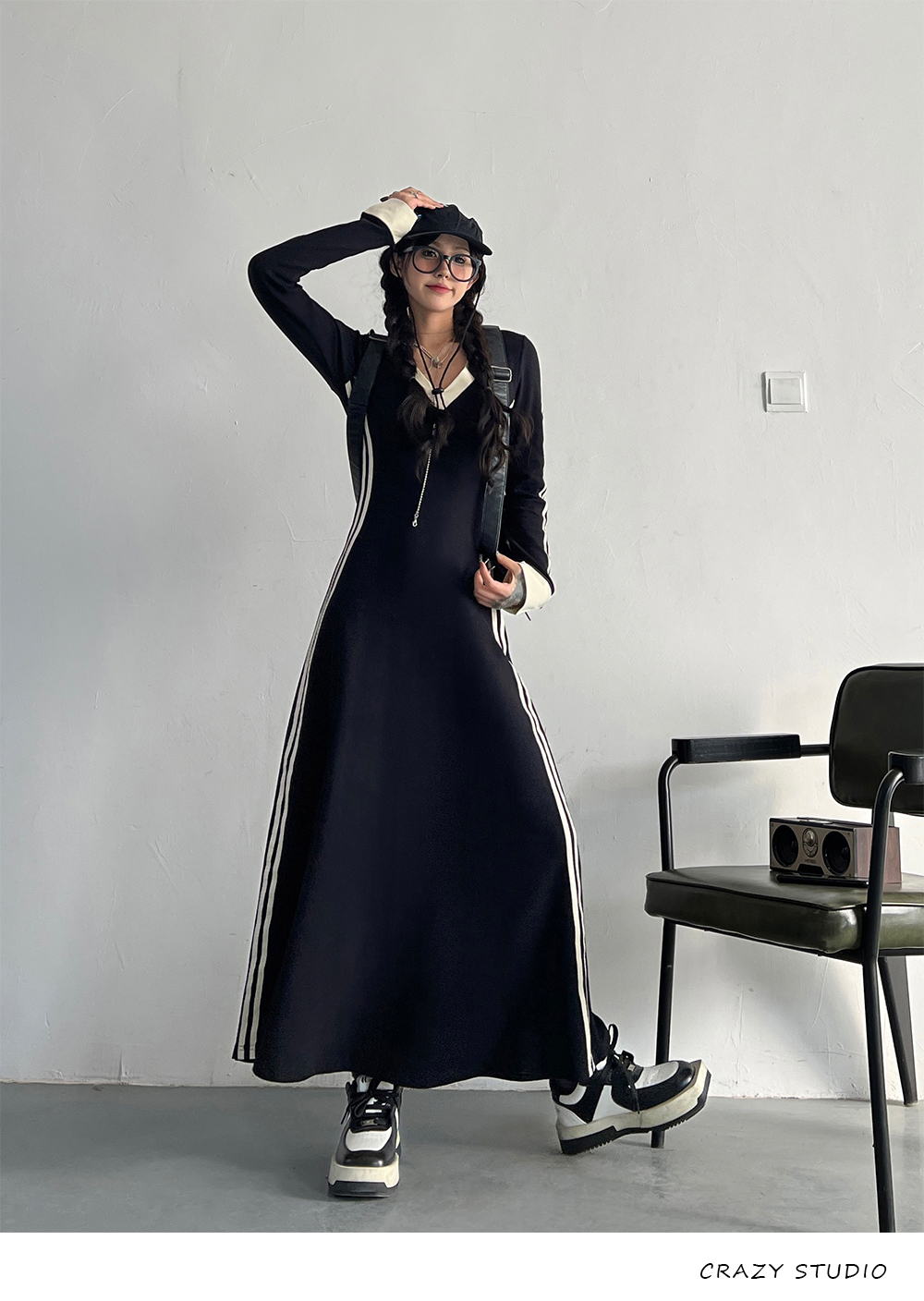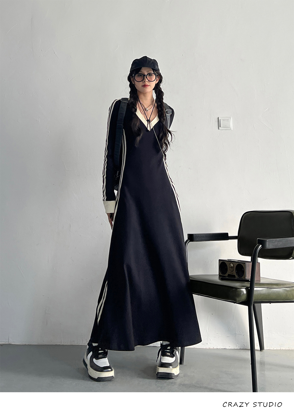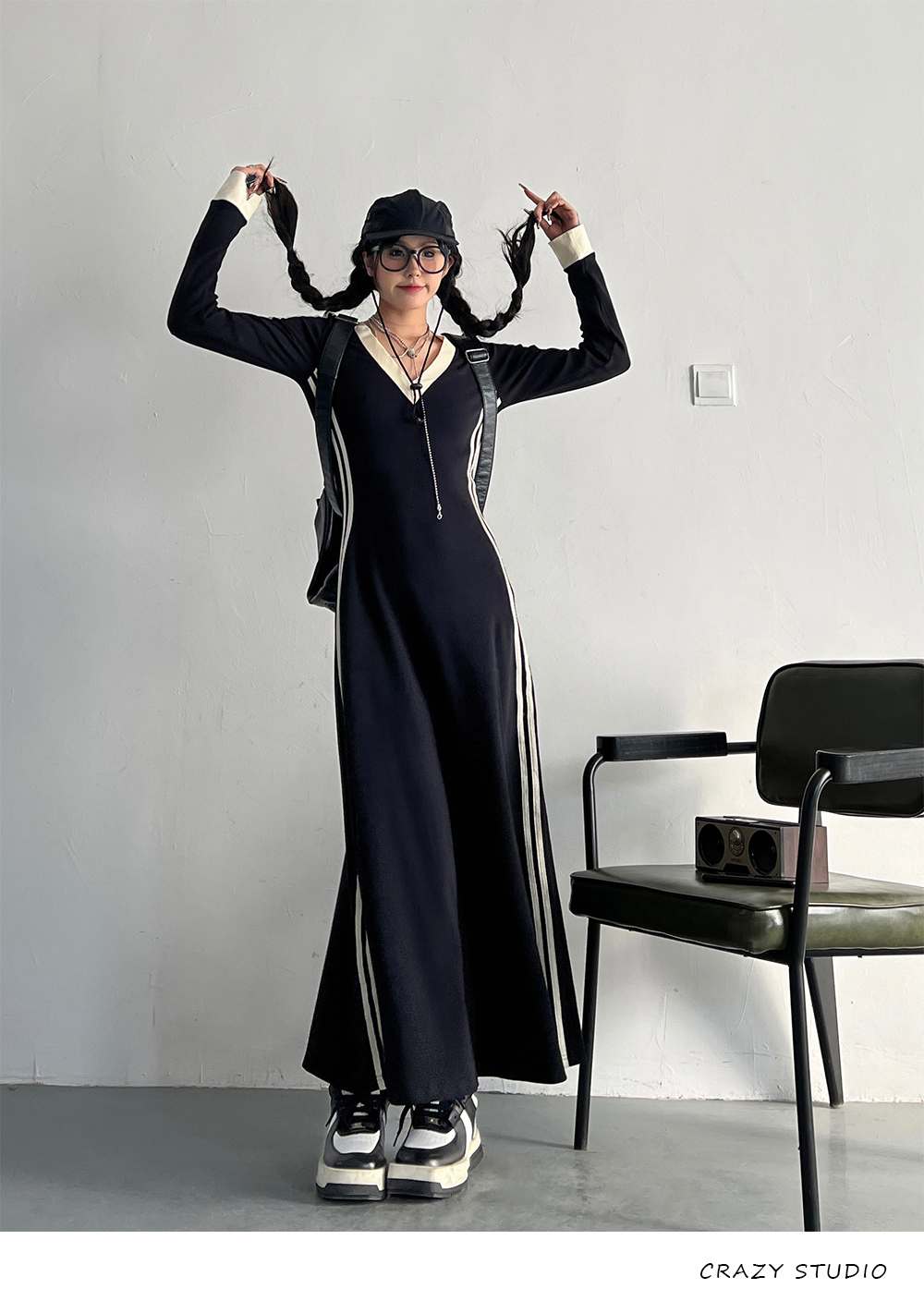 2023新款V領休閒學院風薄款氣質條紋黑色長袖洋裝女長版裙子