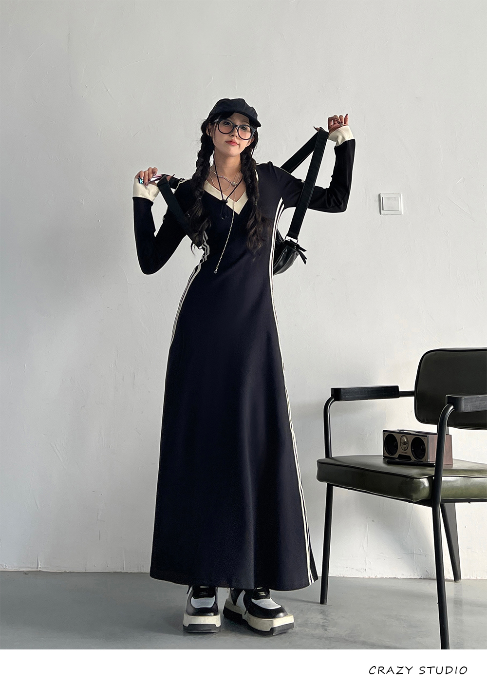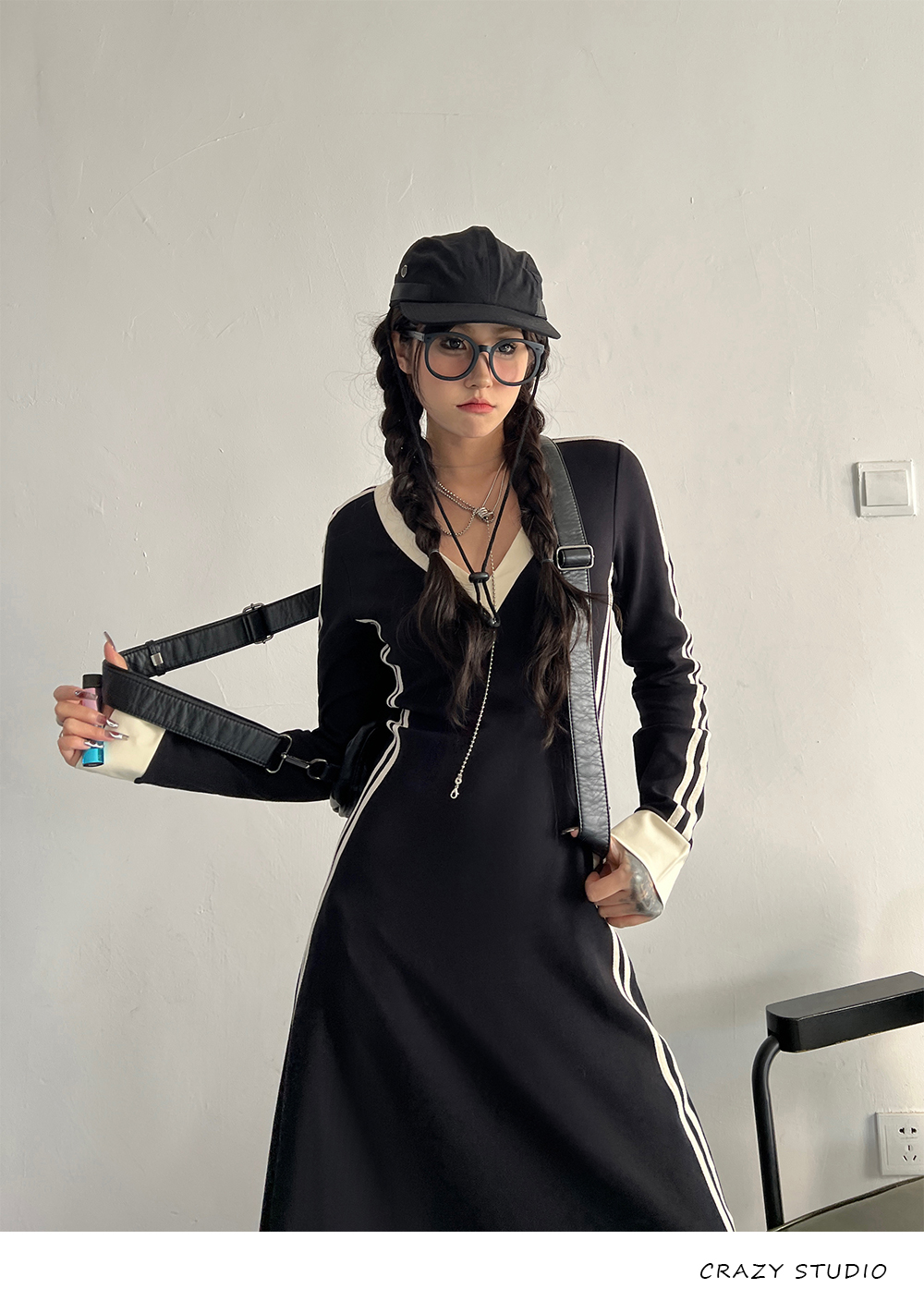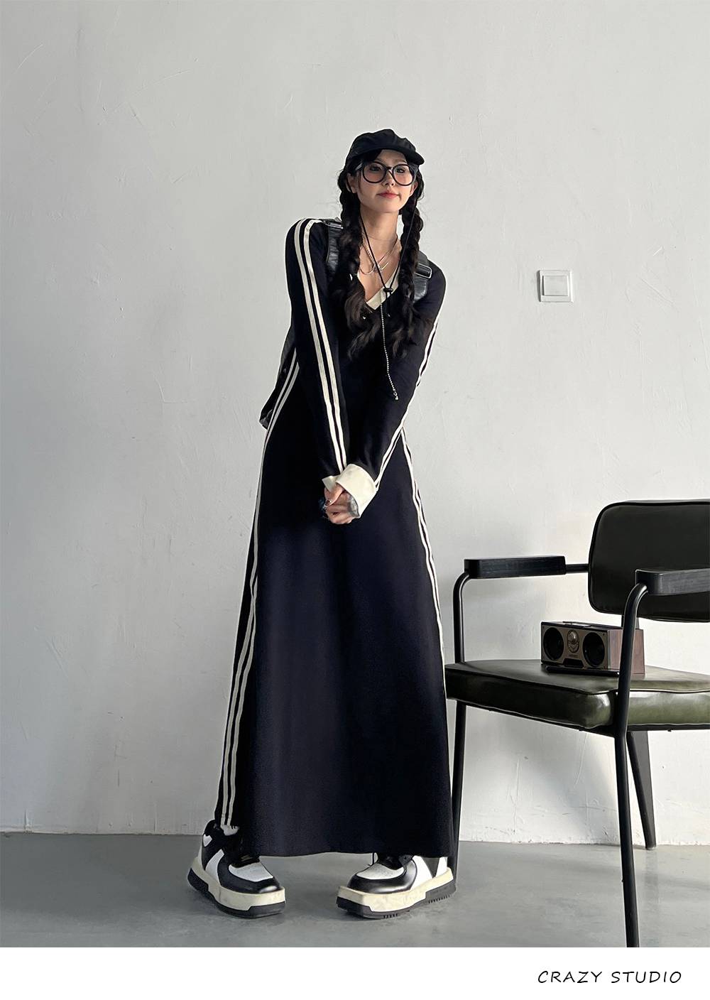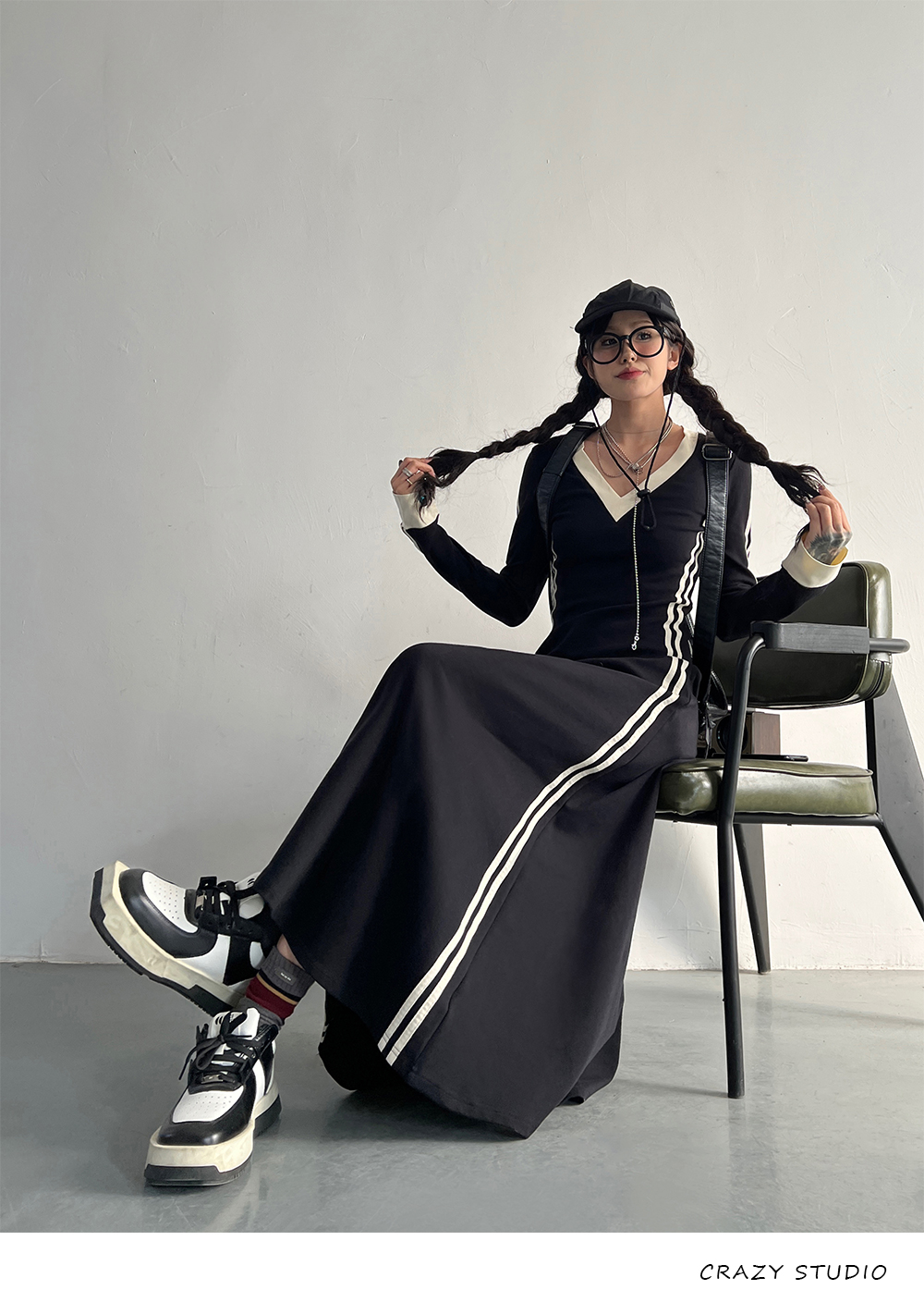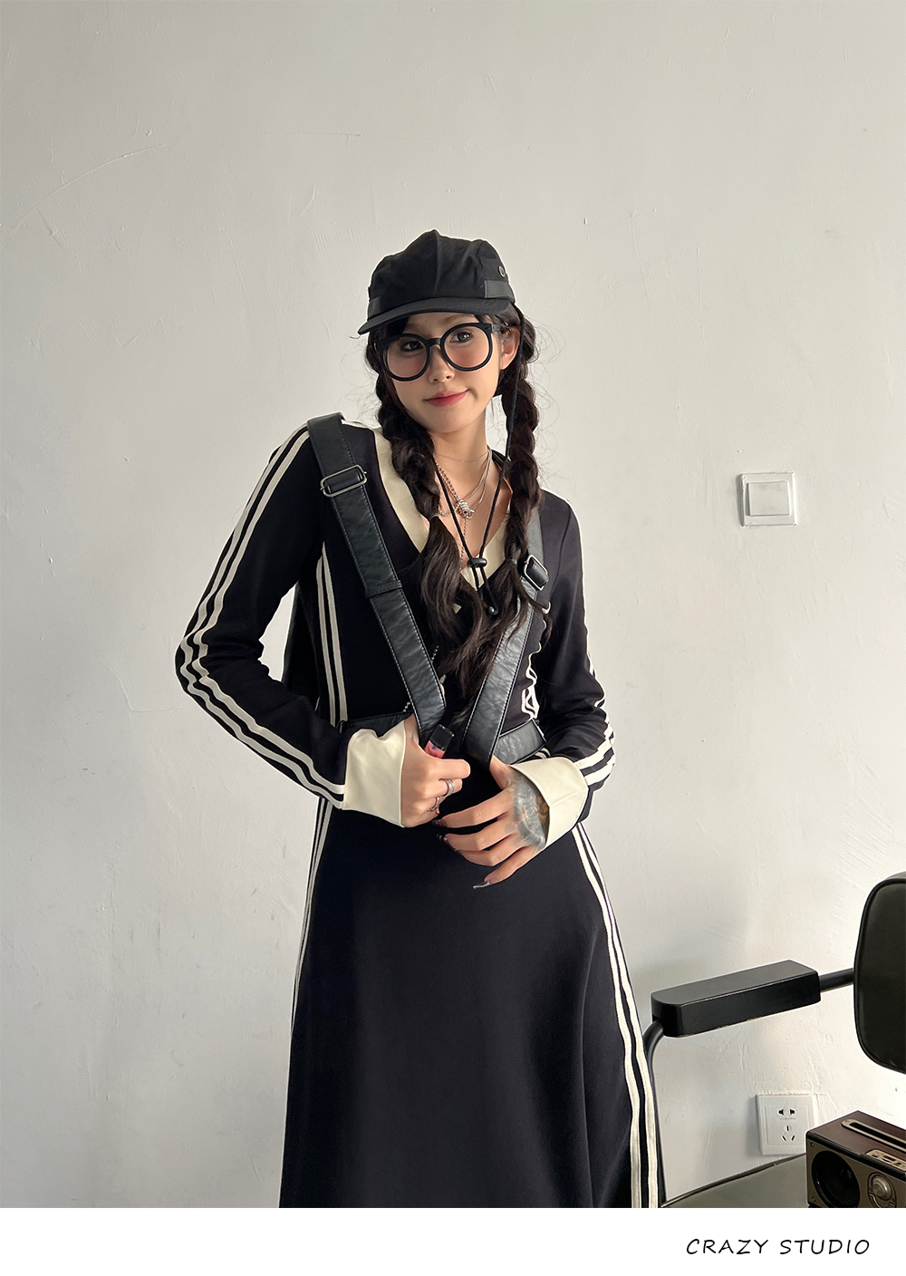 2023新款V領休閒學院風薄款氣質條紋黑色長袖洋裝女長版裙子