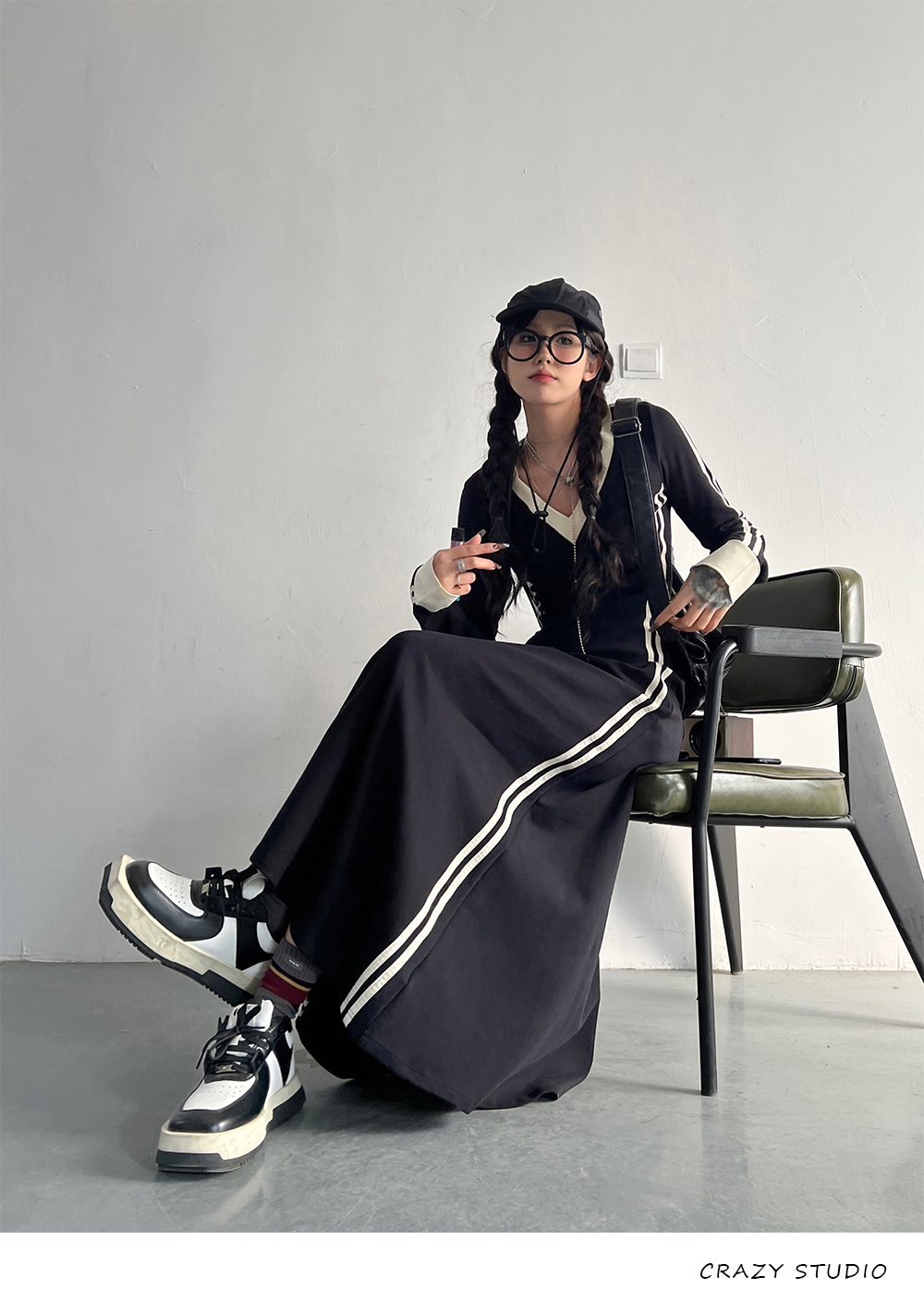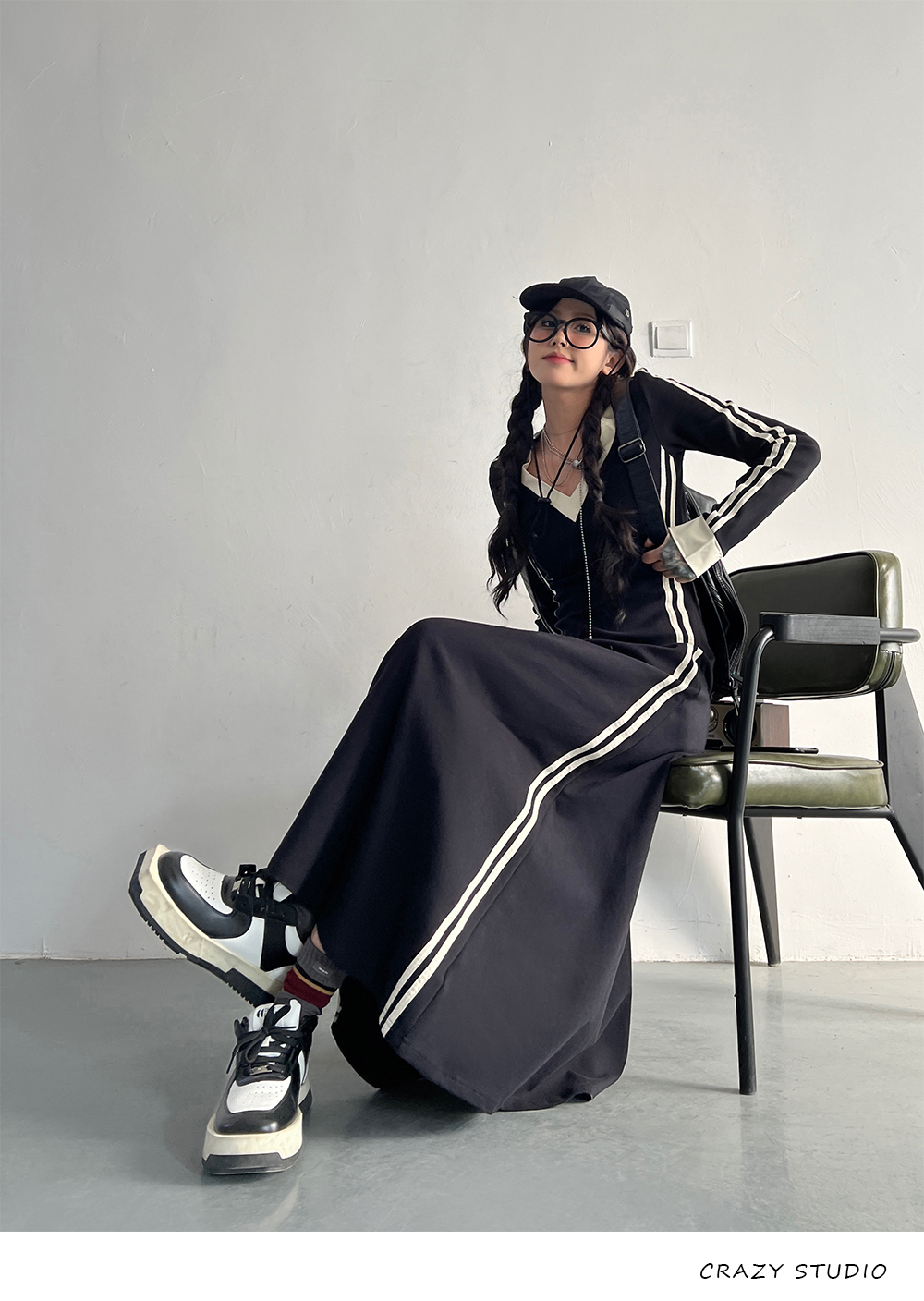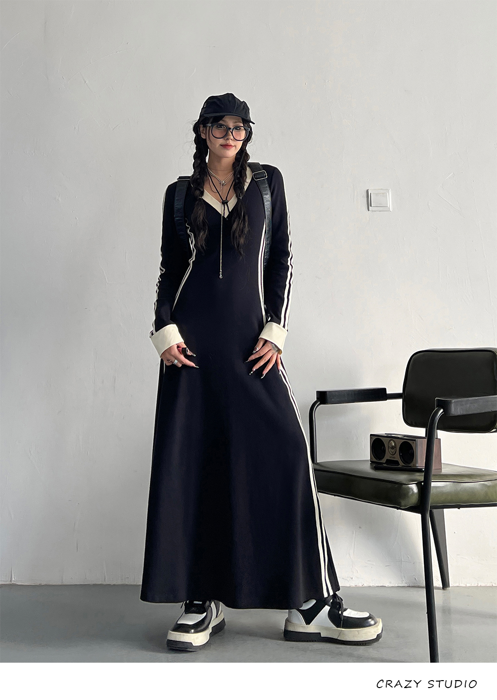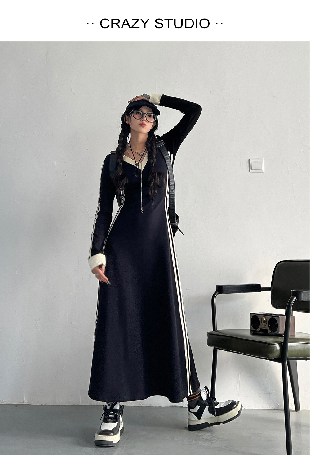 2023新款V領休閒學院風薄款氣質條紋黑色長袖洋裝女長版裙子