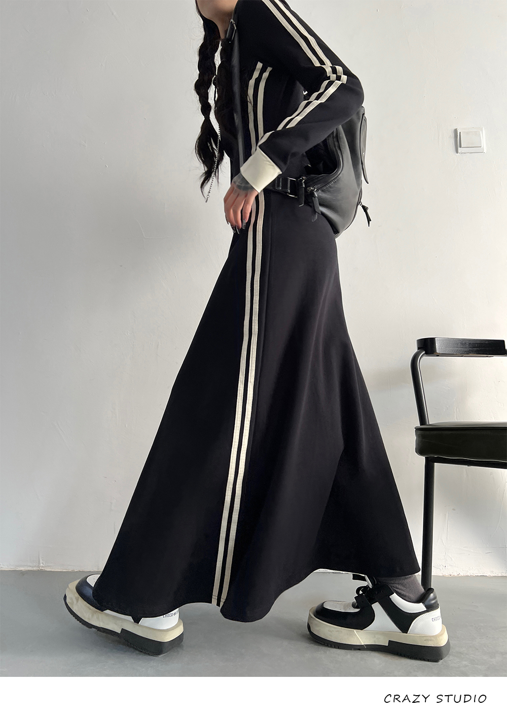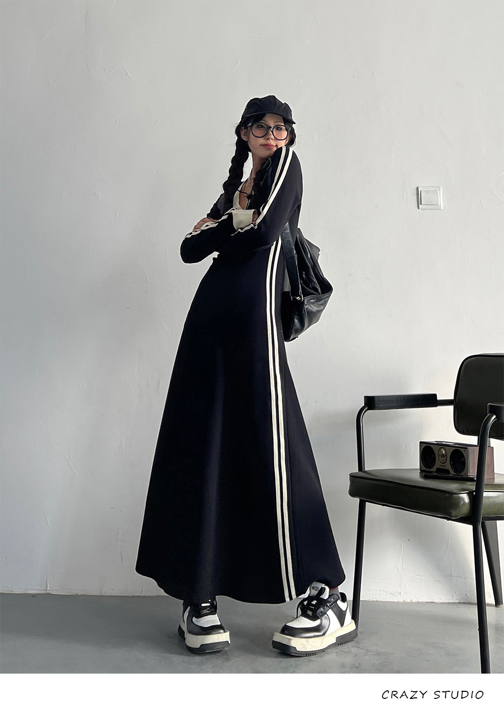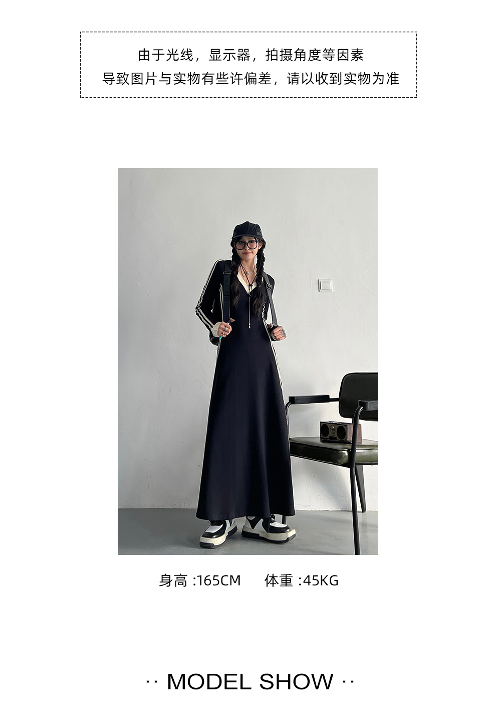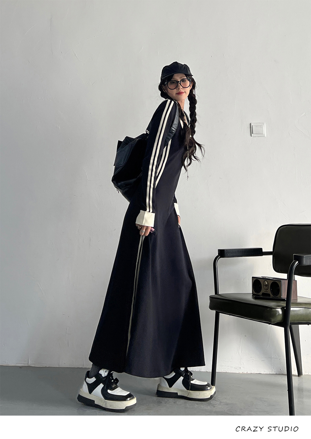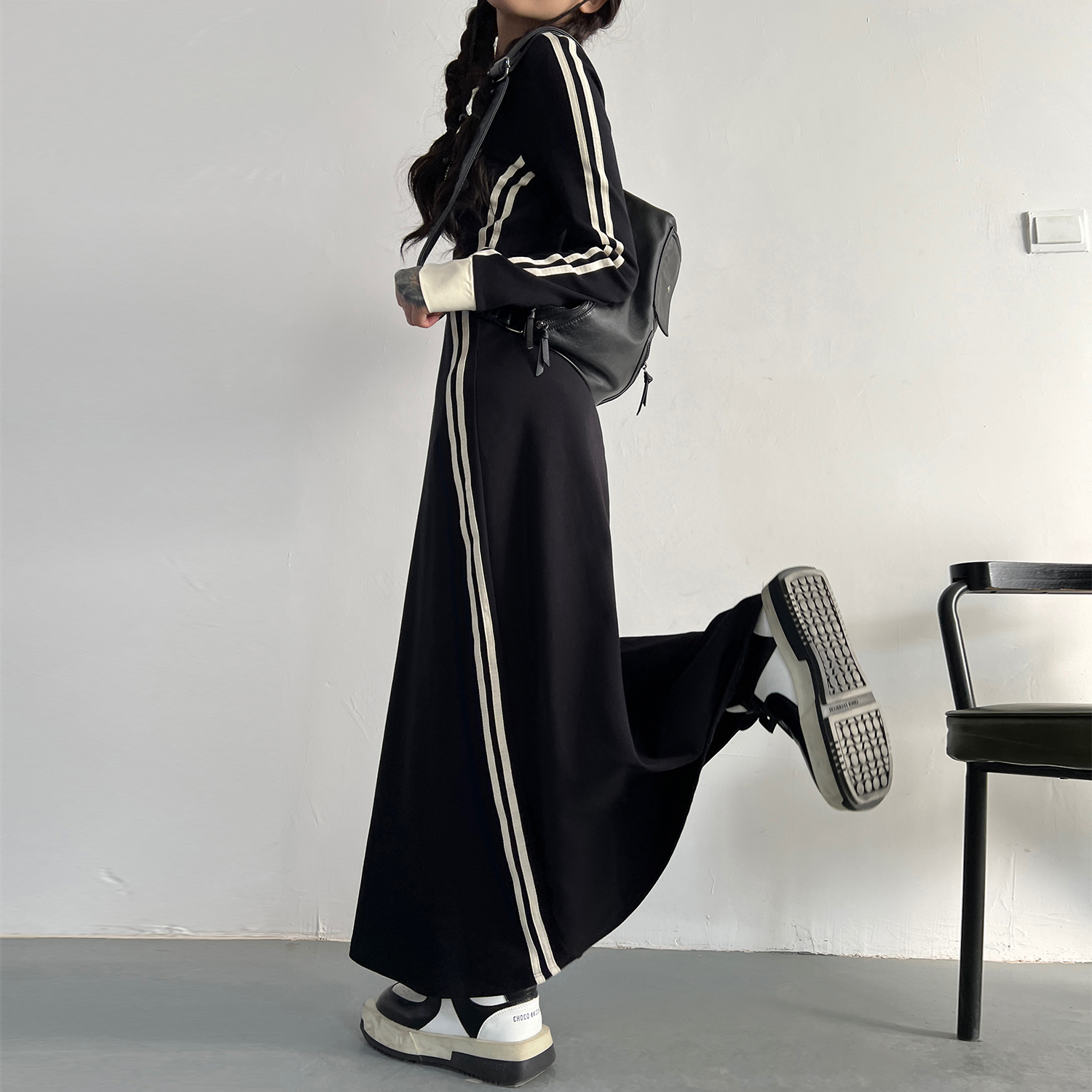 2023新款V領休閒學院風薄款氣質條紋黑色長袖洋裝女長版裙子