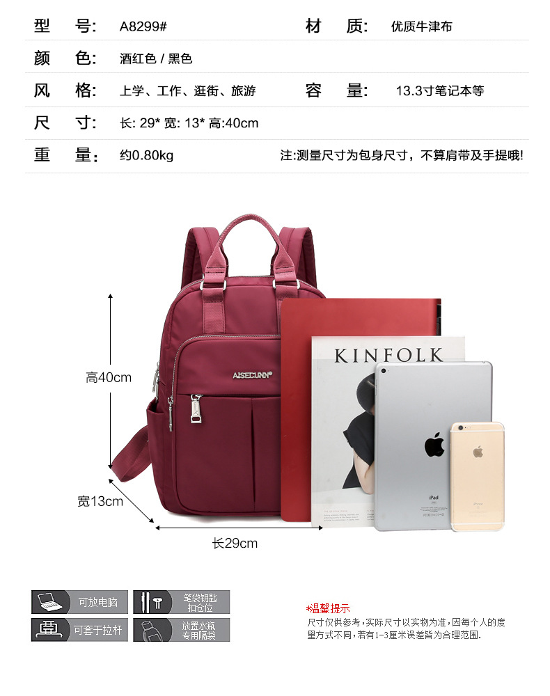 颜色 酒红色中号(可放入14寸笔记本电脑),黑色中号【可放入14寸笔记本电脑】,玫瑰粉中号【无现货 50个起订】,蓝色中号【无现货 50个起订】,浅粉中号(可放入14寸笔记本电脑),烟雾白中号(可放入14寸笔记本电脑)