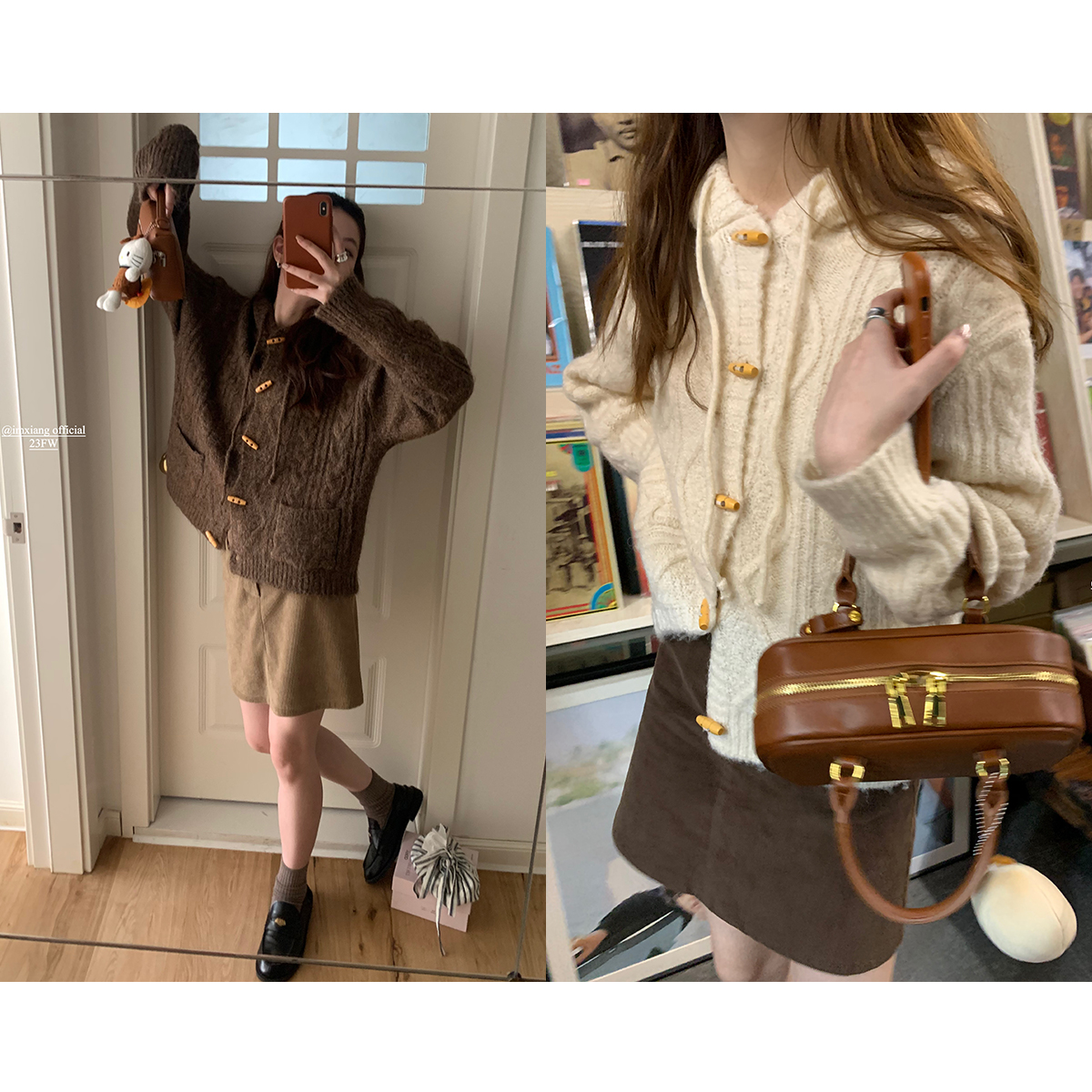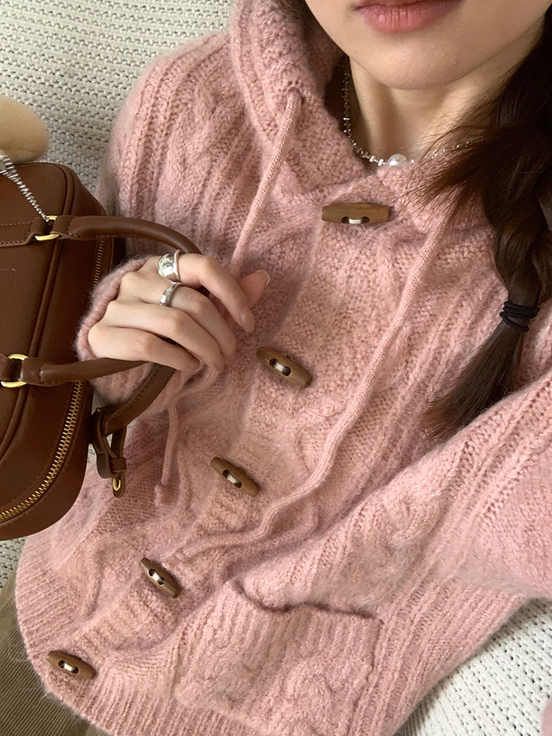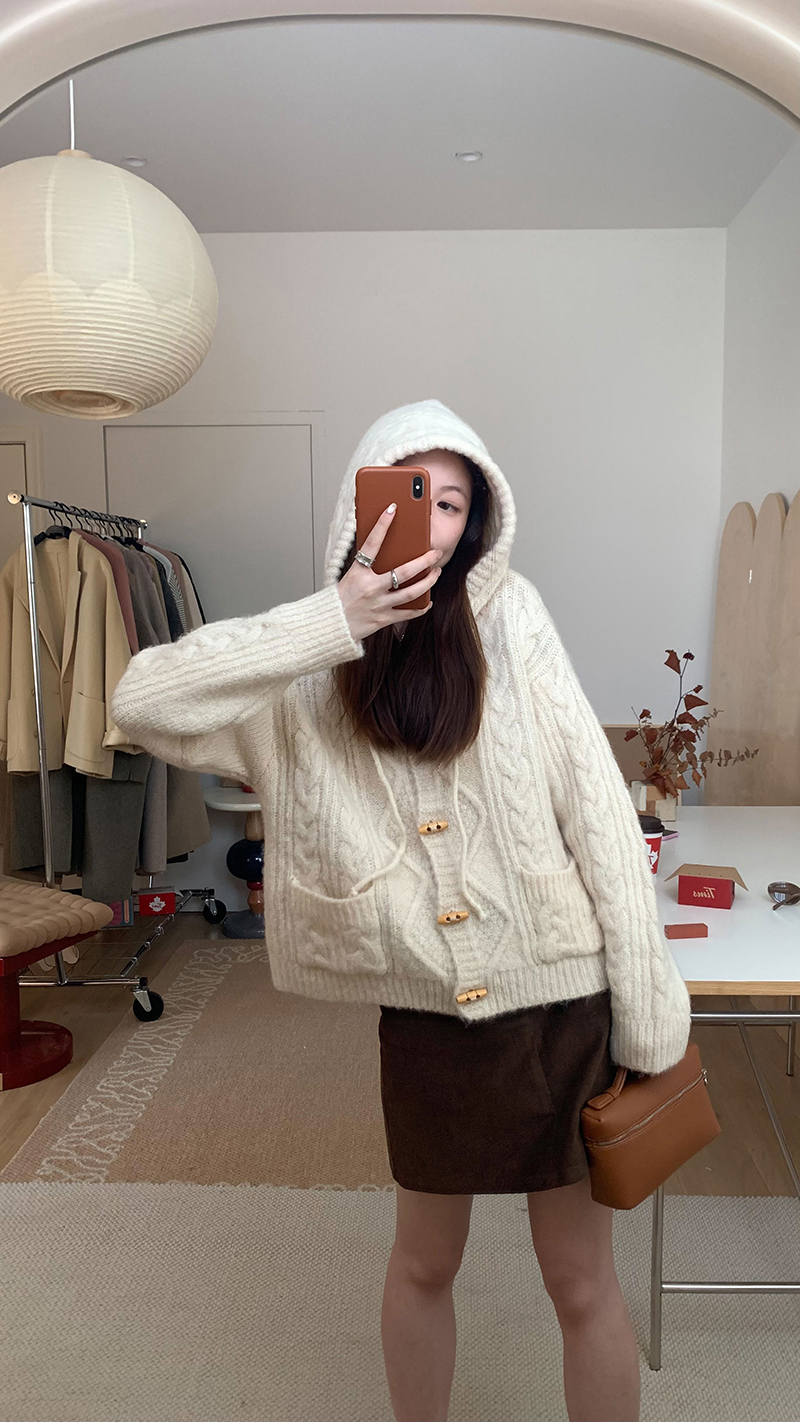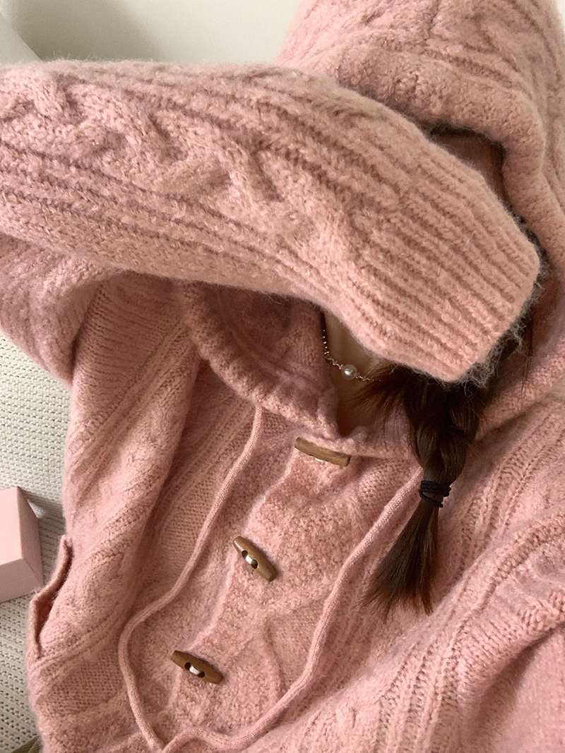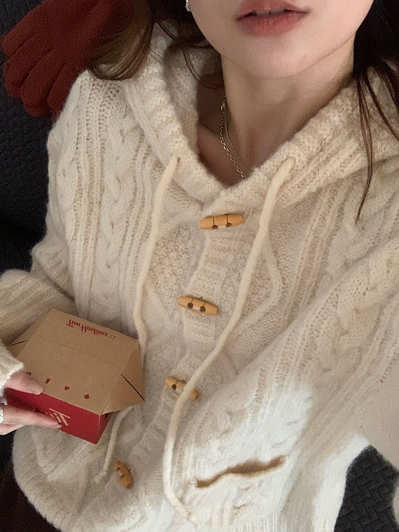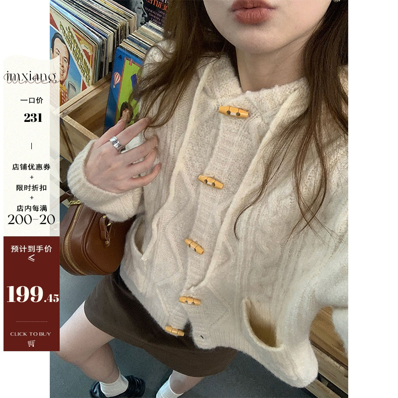 im向 焦糖雪芙 蓬鬆毛感牛角扣麻花毛衣女秋冬連帽抽繩針織外套