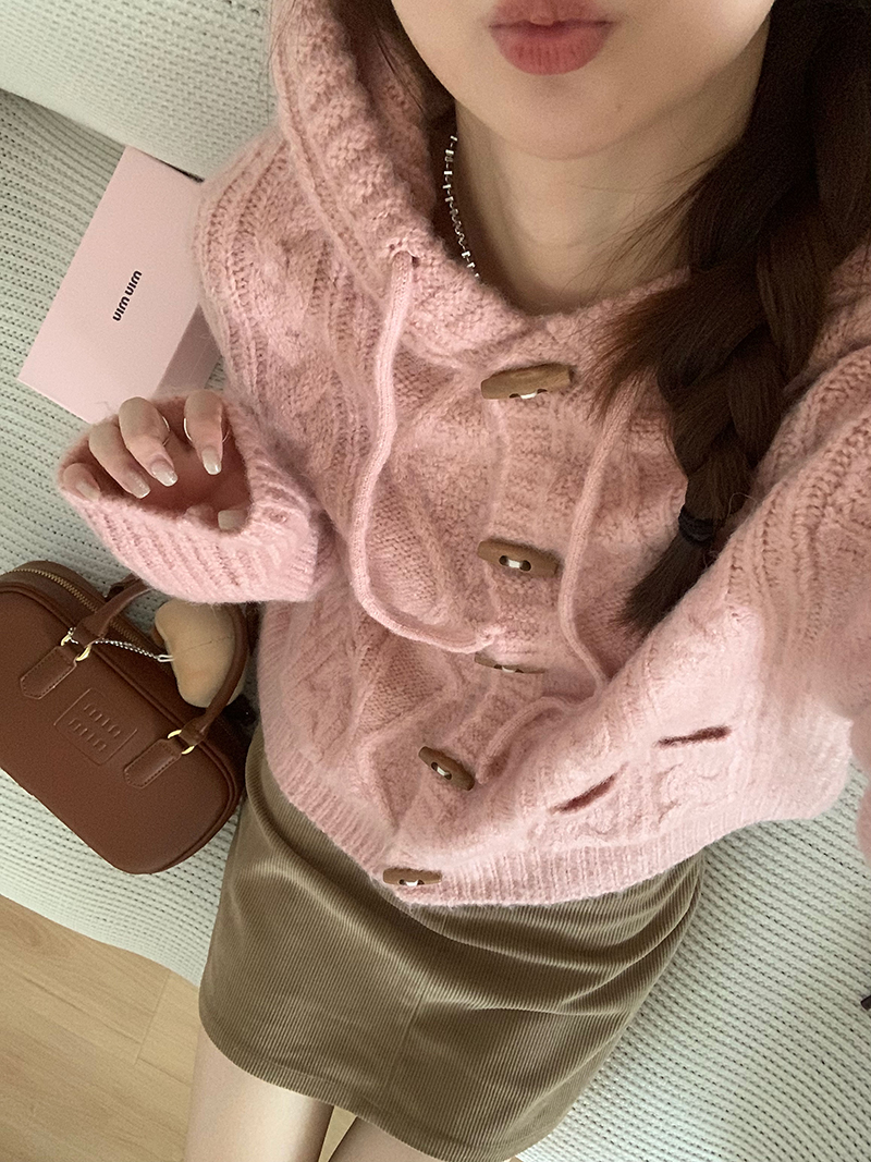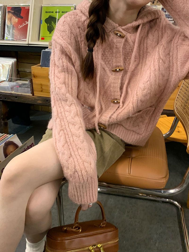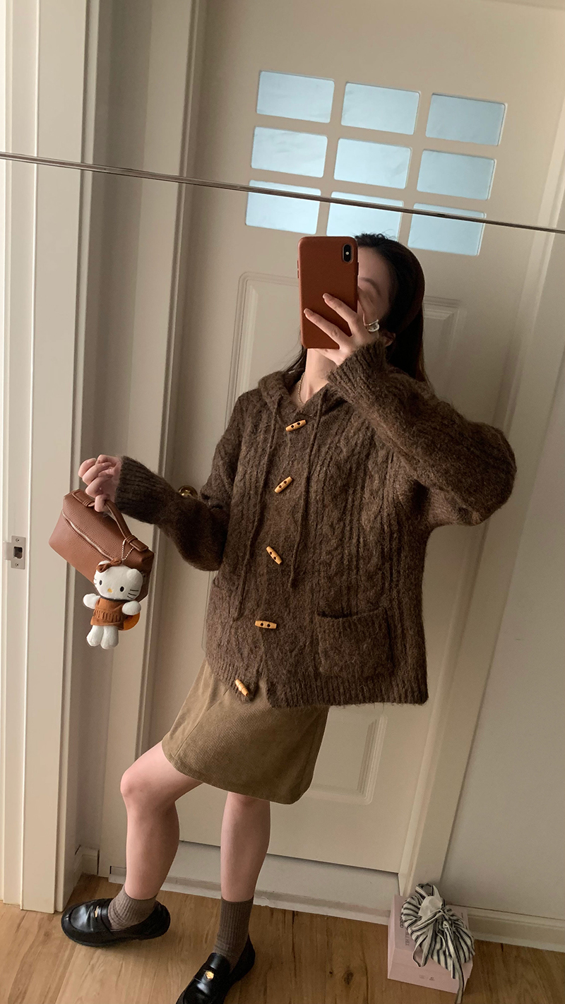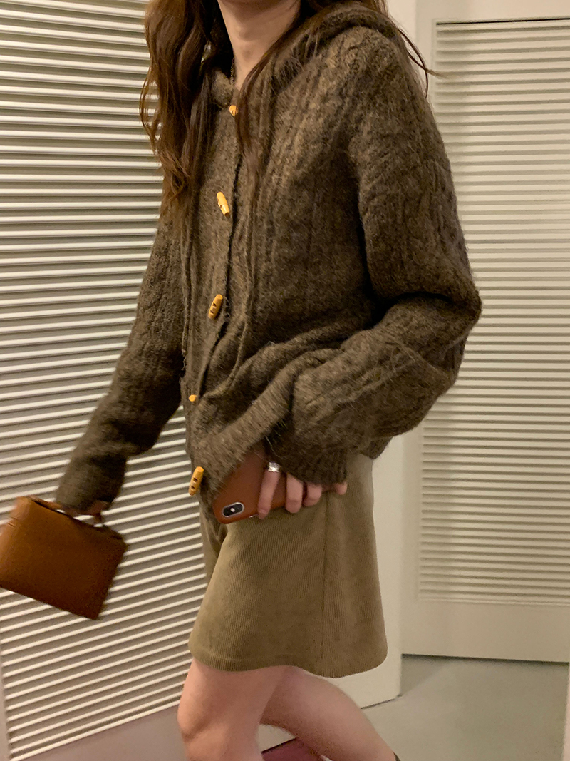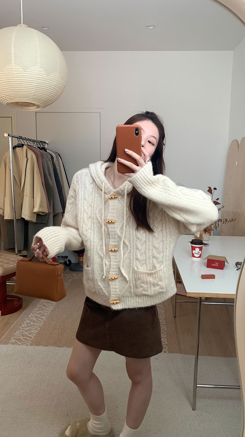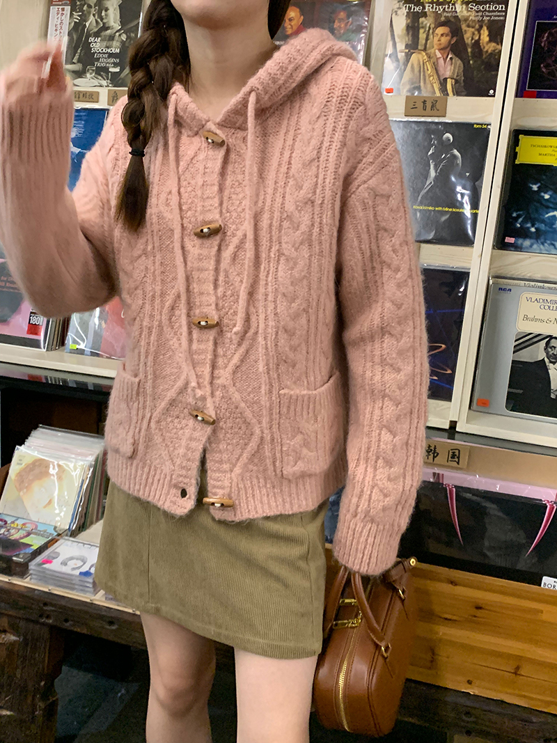 im向 焦糖雪芙 蓬鬆毛感牛角扣麻花毛衣女秋冬連帽抽繩針織外套