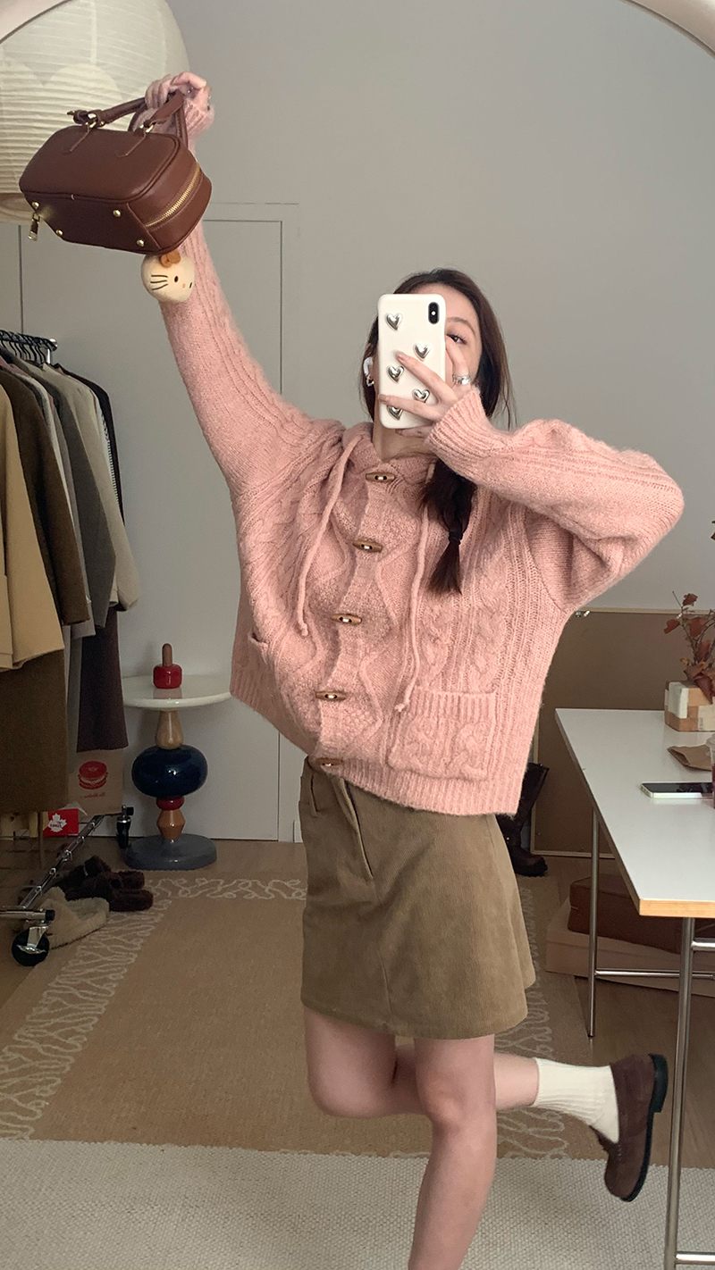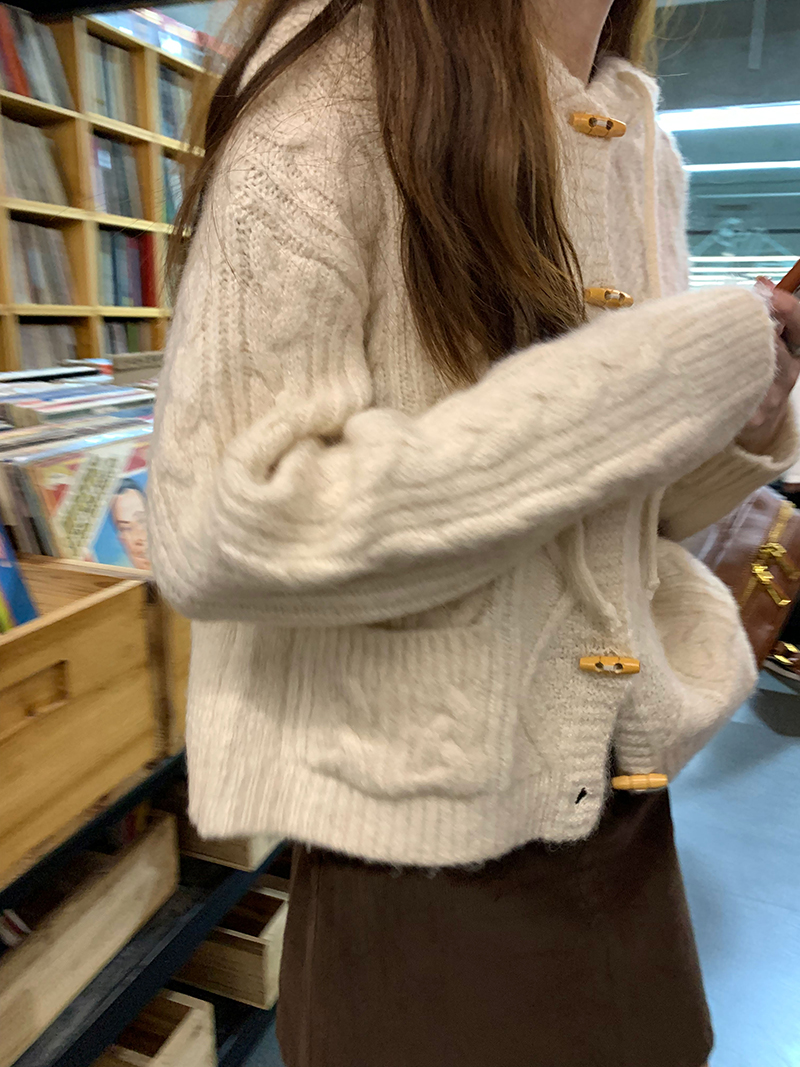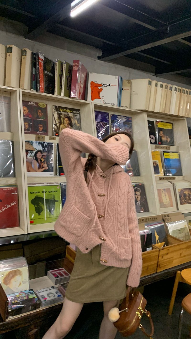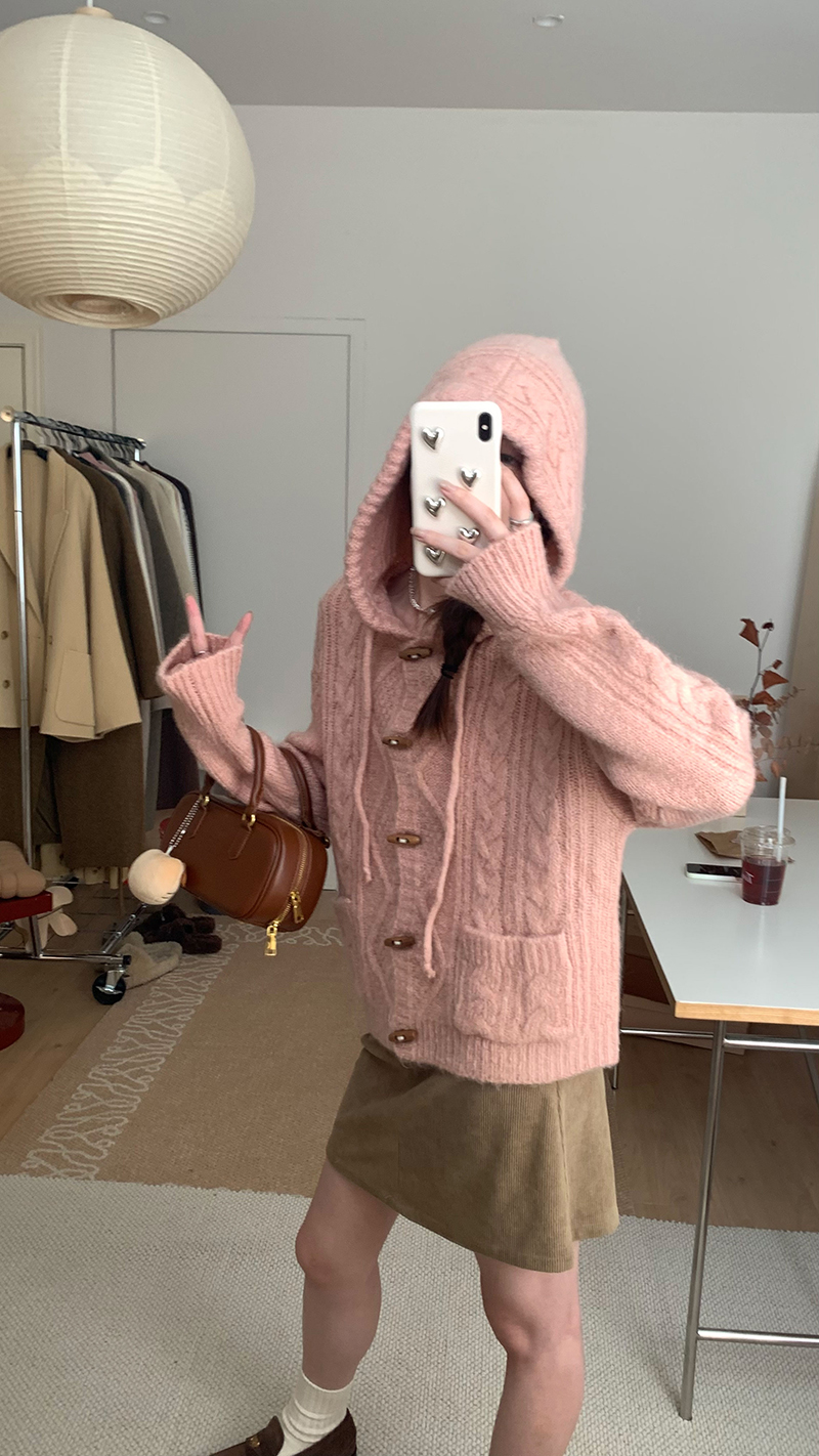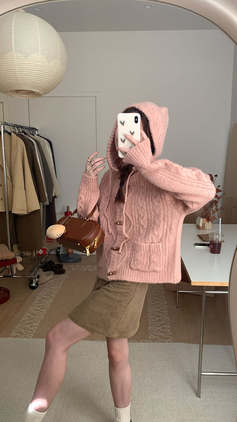 im向 焦糖雪芙 蓬鬆毛感牛角扣麻花毛衣女秋冬連帽抽繩針織外套