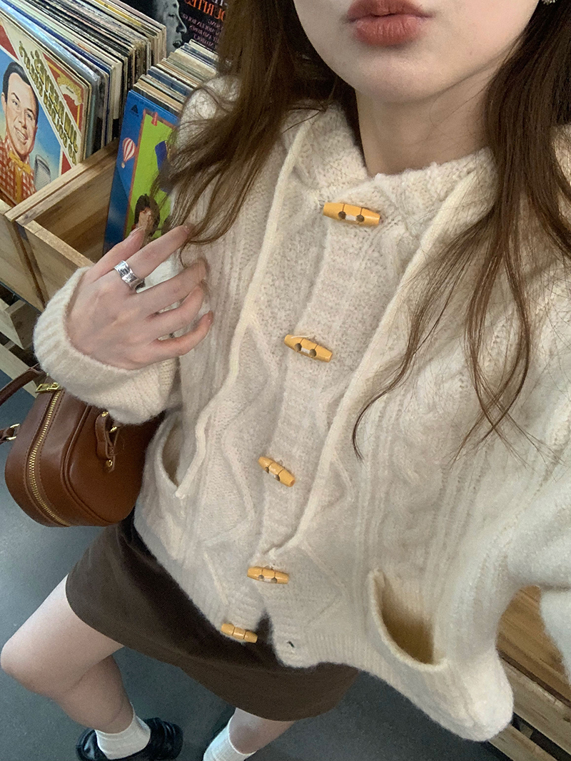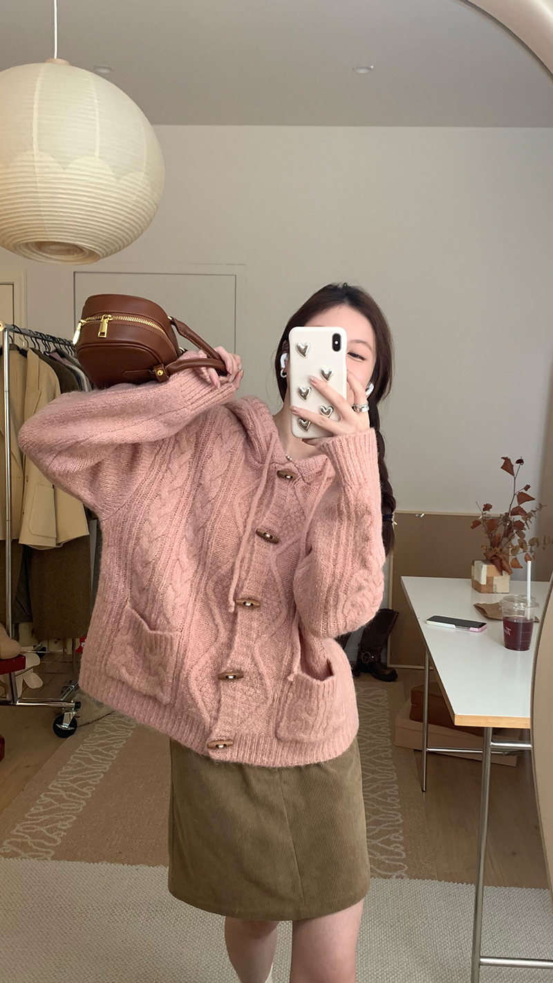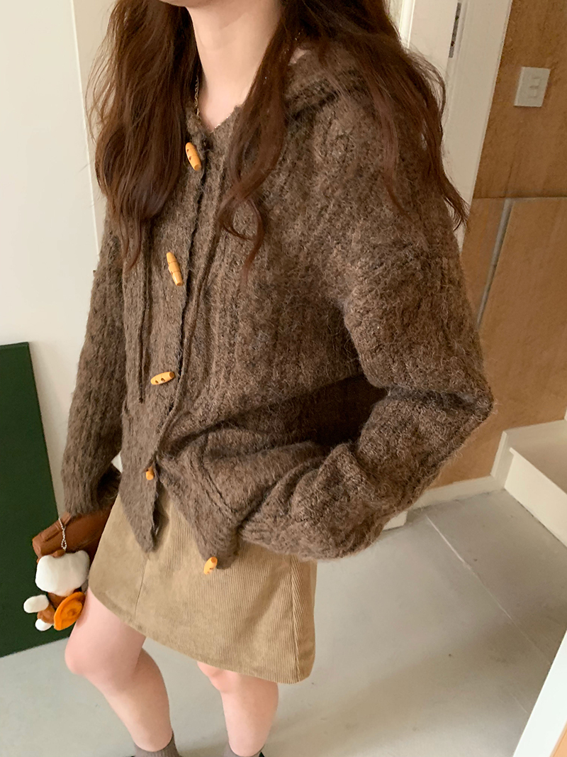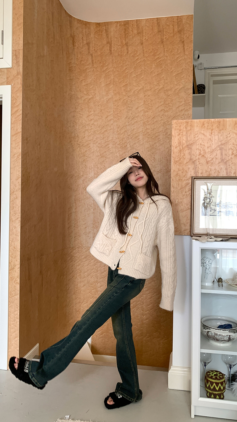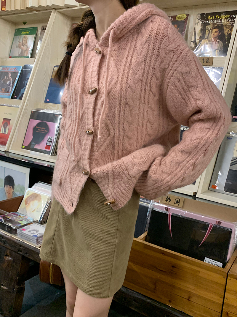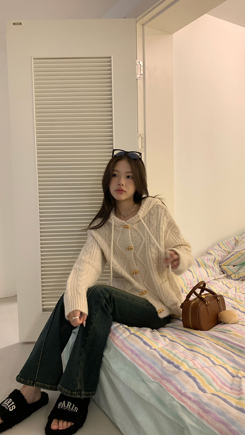 im向 焦糖雪芙 蓬鬆毛感牛角扣麻花毛衣女秋冬連帽抽繩針織外套