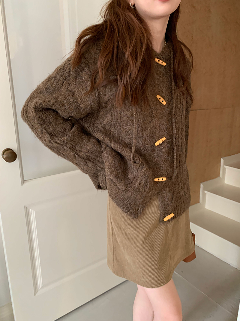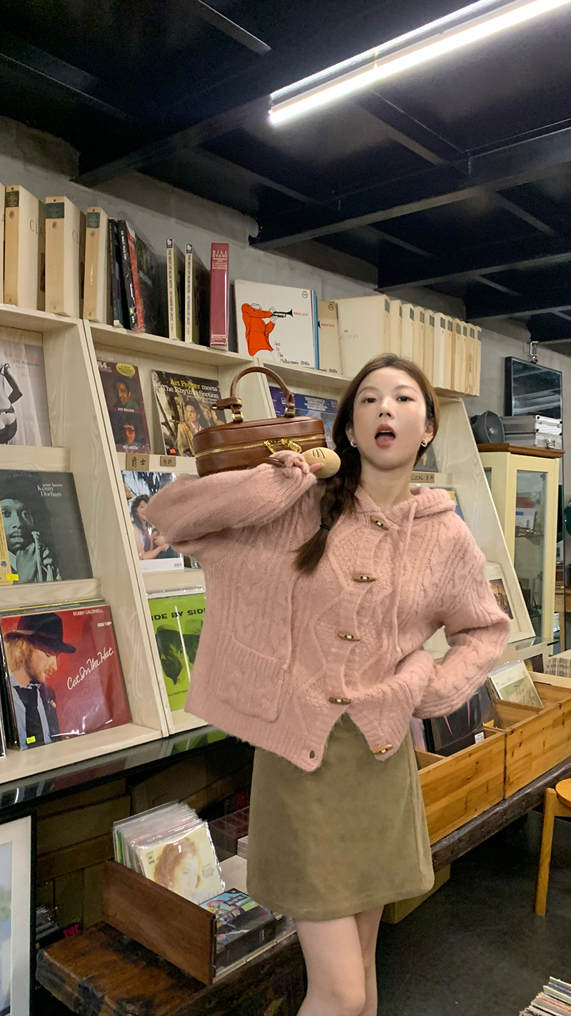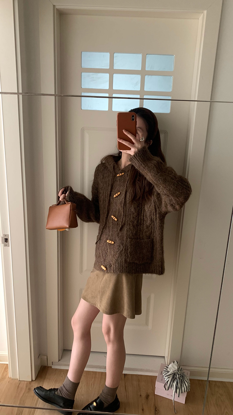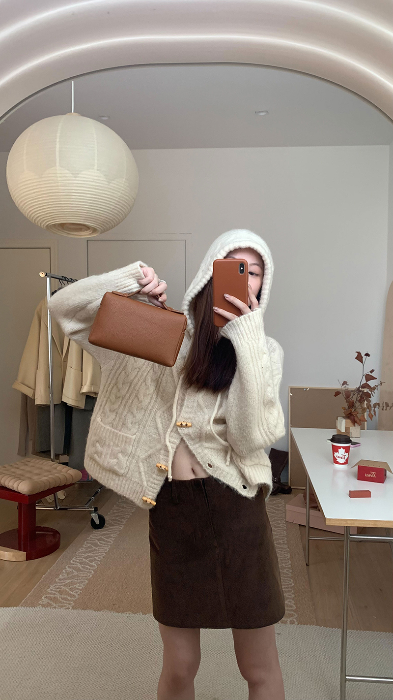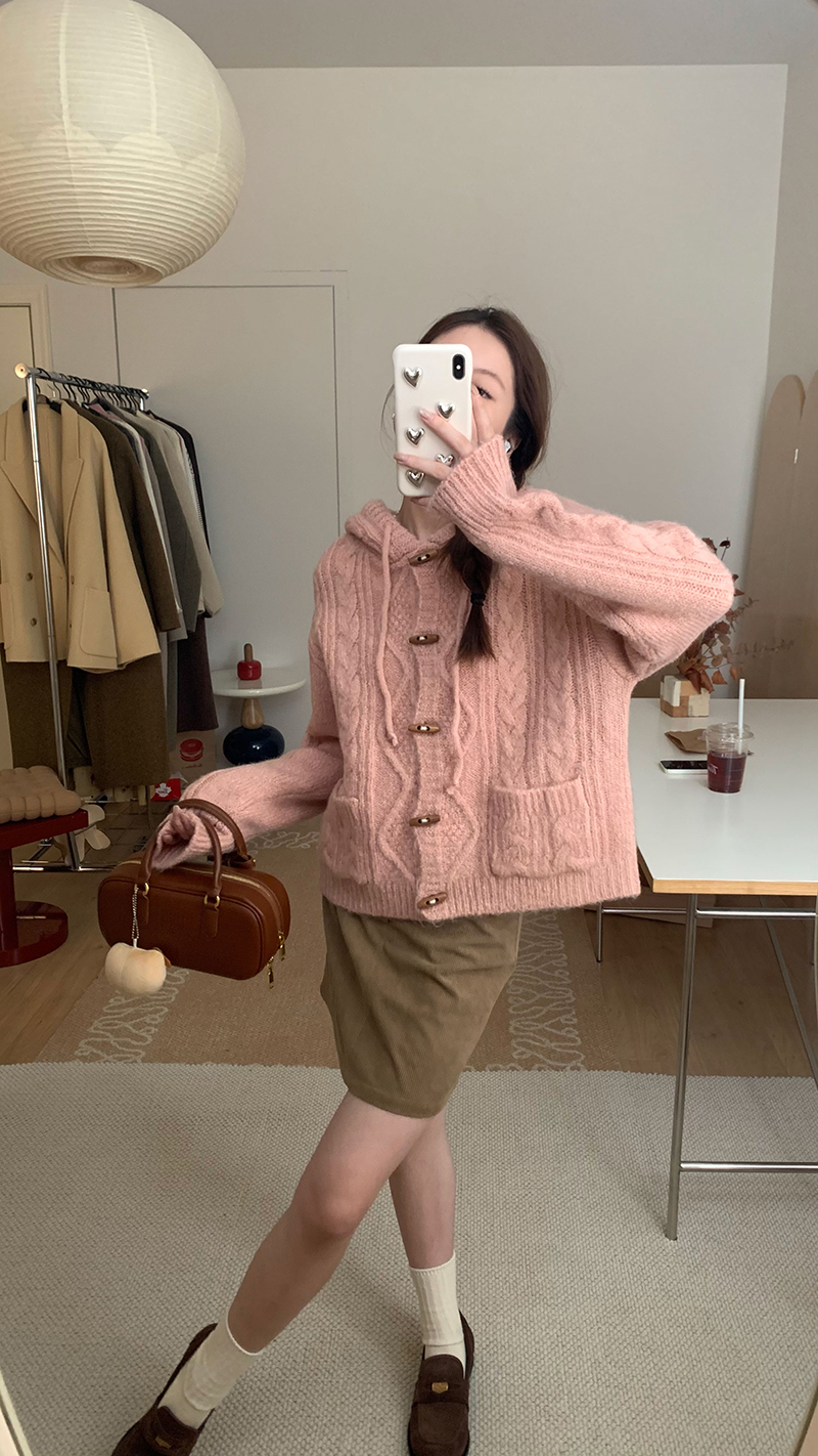 im向 焦糖雪芙 蓬鬆毛感牛角扣麻花毛衣女秋冬連帽抽繩針織外套