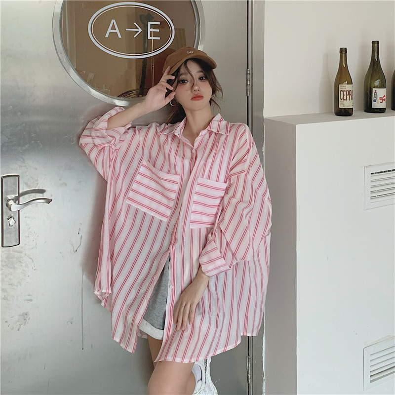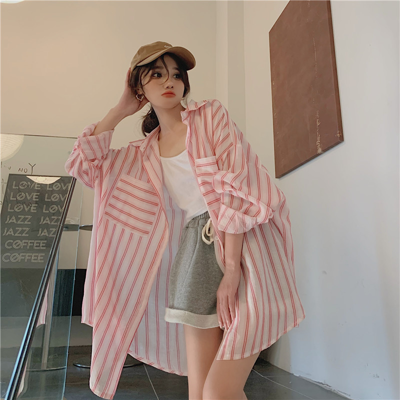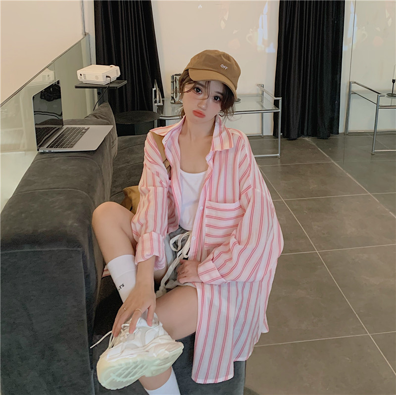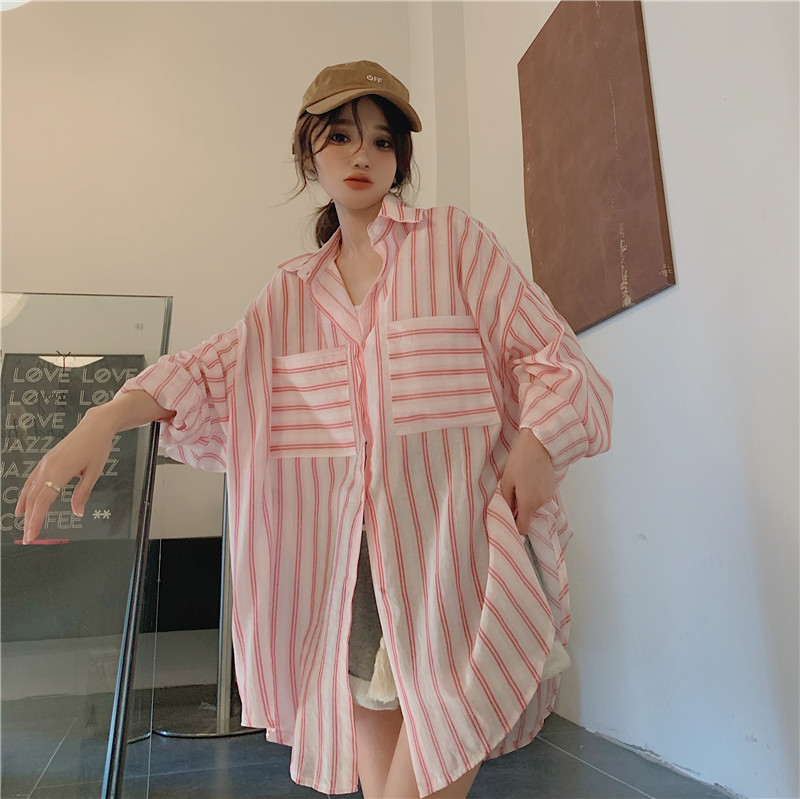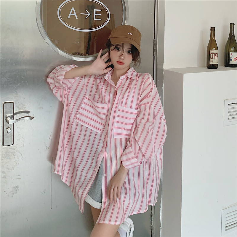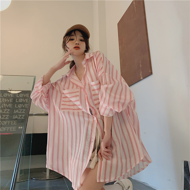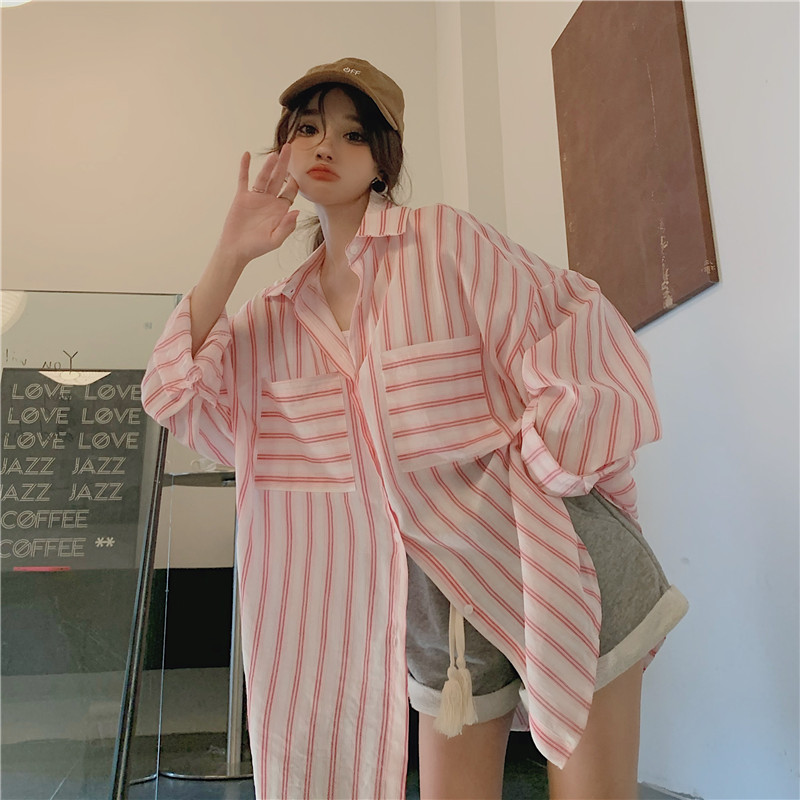 200斤胖妹妹夏季ins條紋中長版薄款襯衫加肥加大碼學生防曬襯衫女
