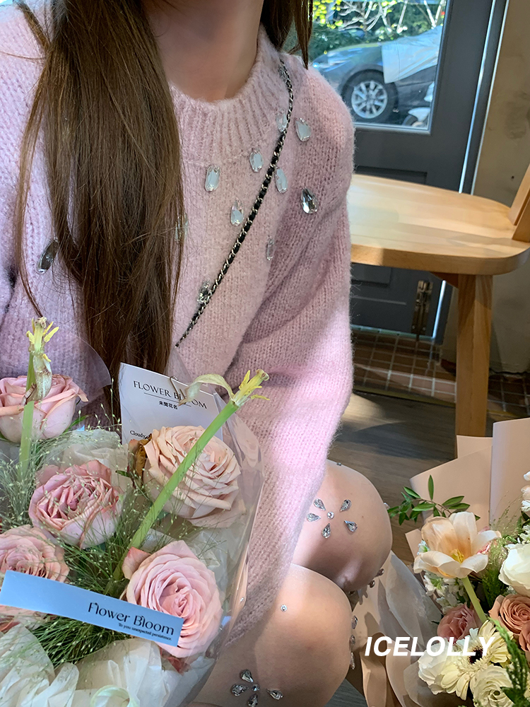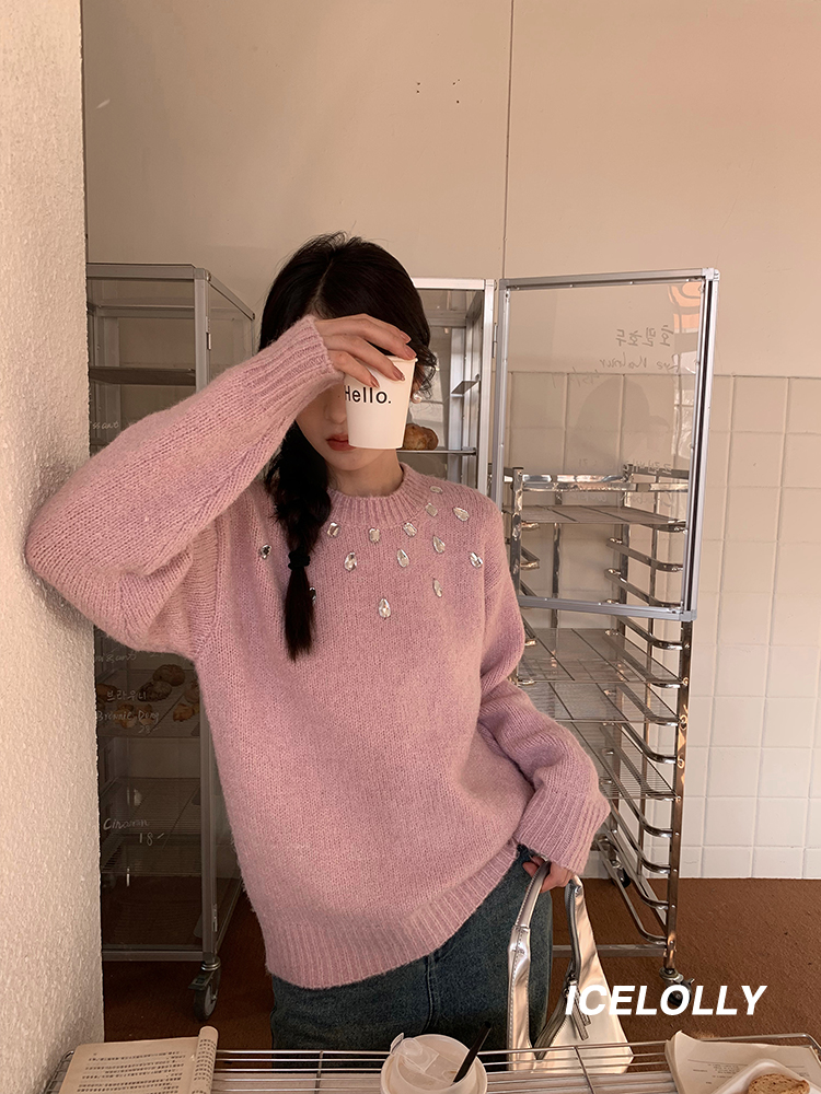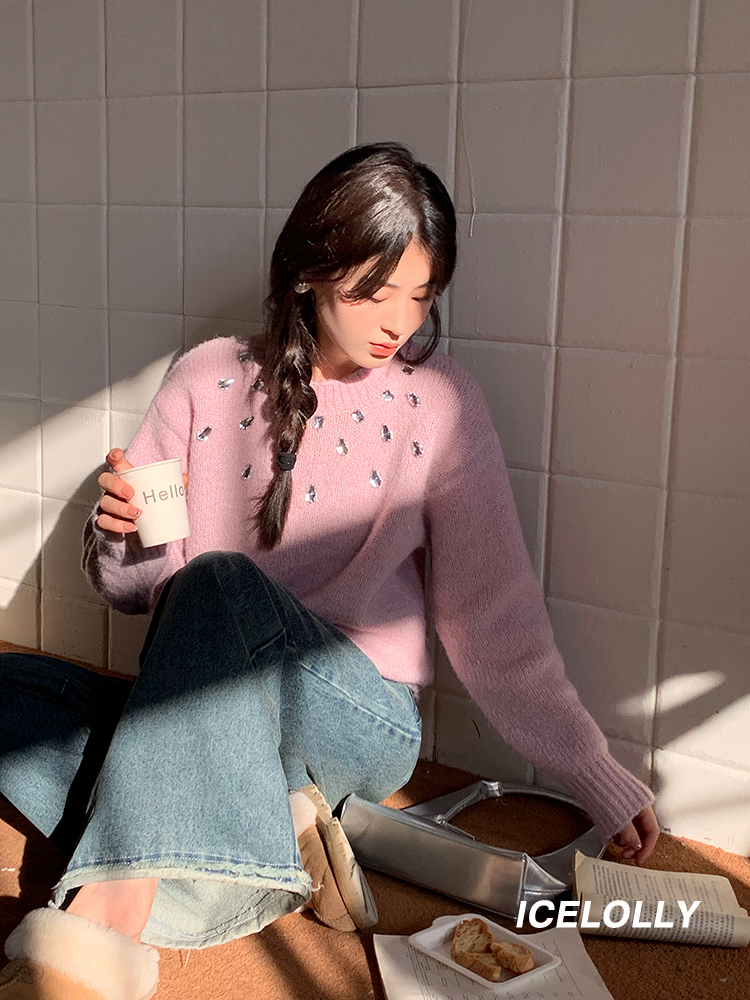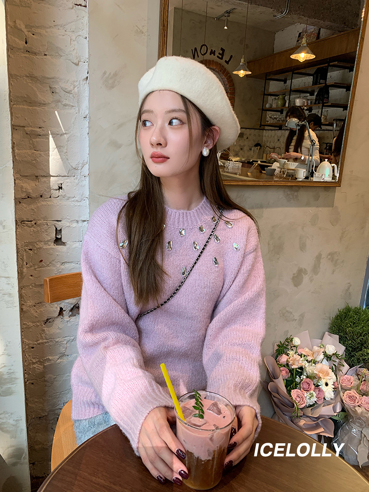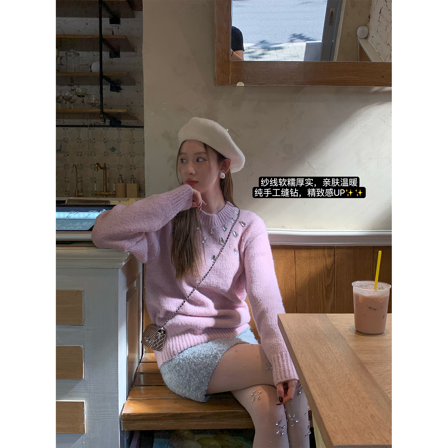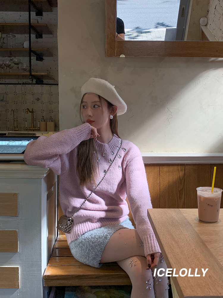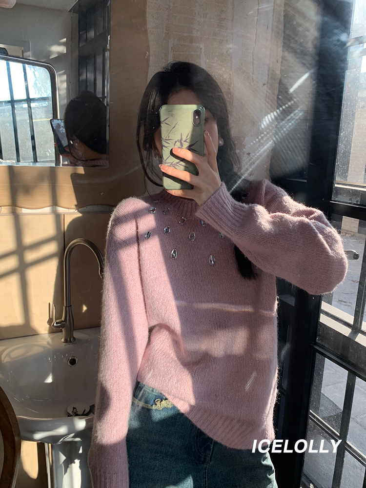 ICELOLLY慵懶風寬鬆短款粉色毛衣女秋冬款小個子洋派減齡氣質上衣