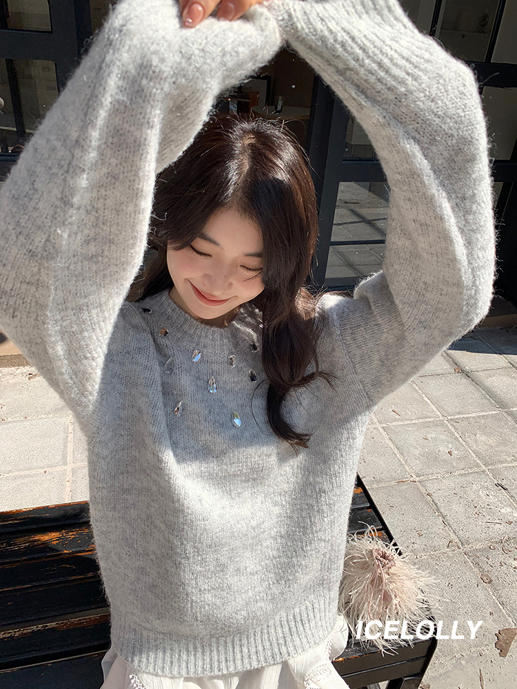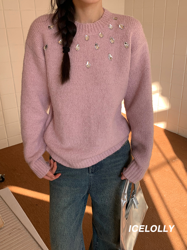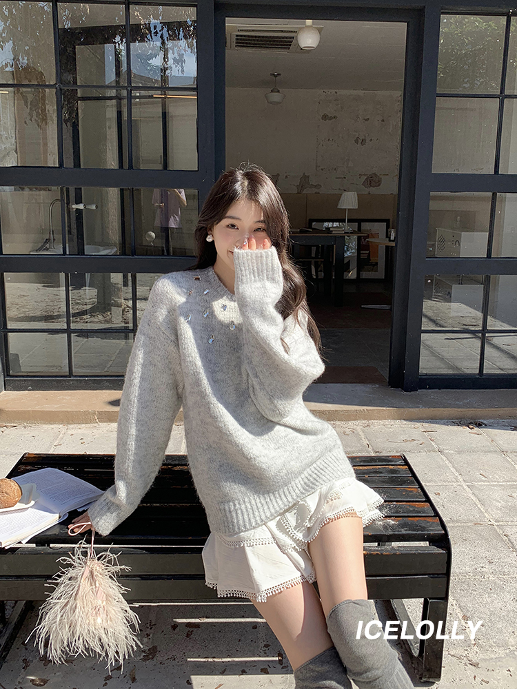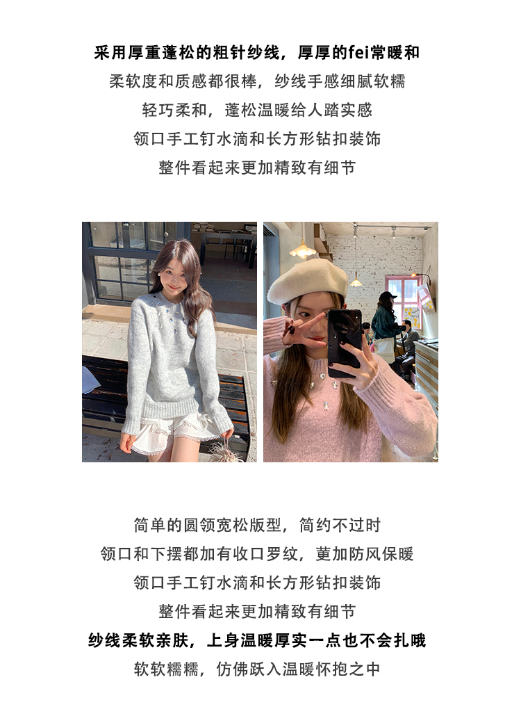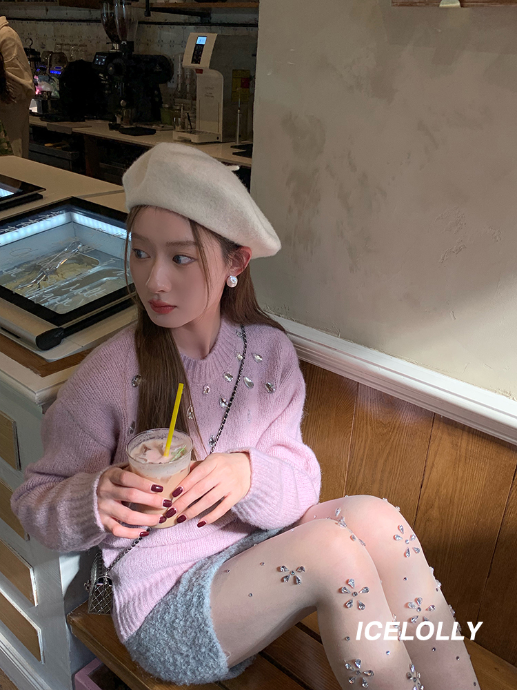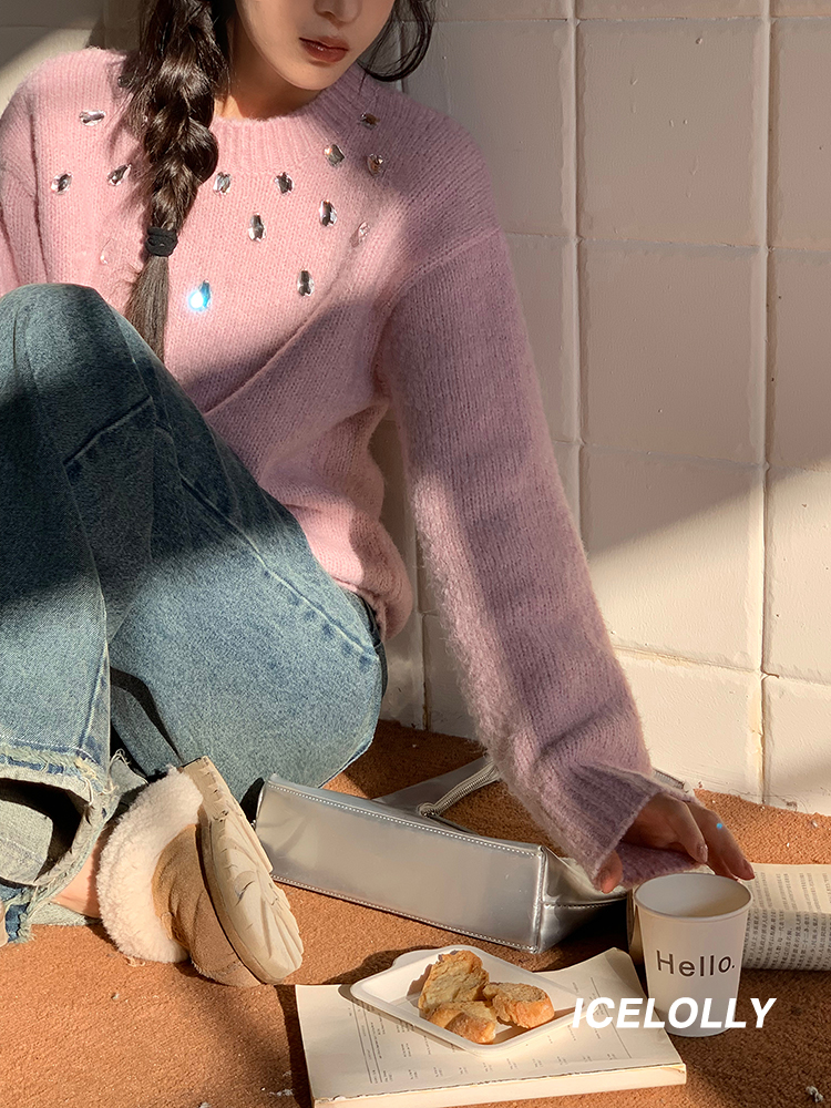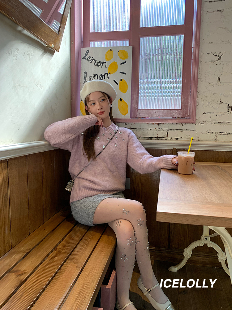 ICELOLLY慵懶風寬鬆短款粉色毛衣女秋冬款小個子洋派減齡氣質上衣