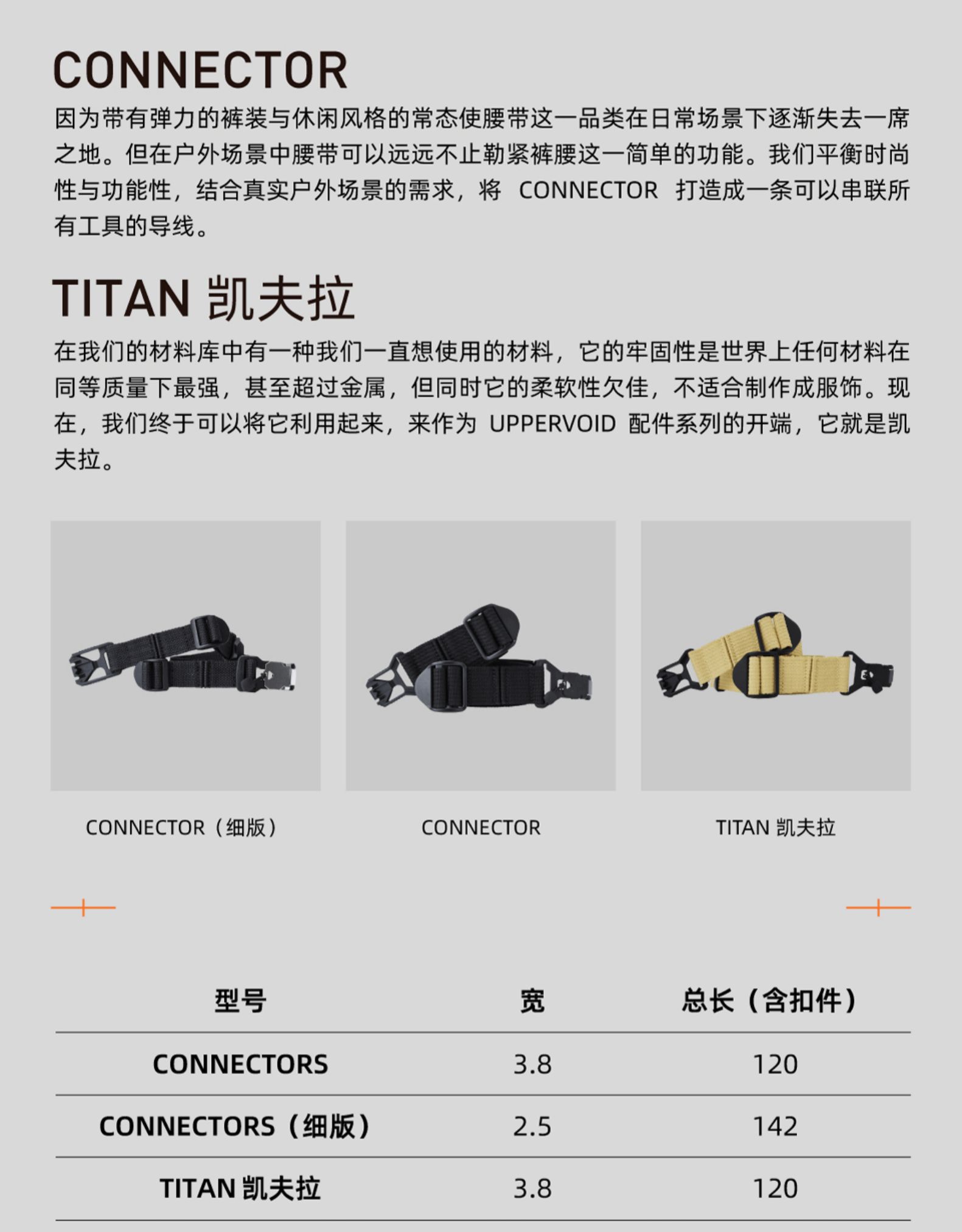 顏色 CONNECTOR 織帶窄腰帶(碳黑25mm) CONNECTOR 織帶寬腰帶(碳黑38mm) TITAN Kevlar腰帶(警黃38mm)