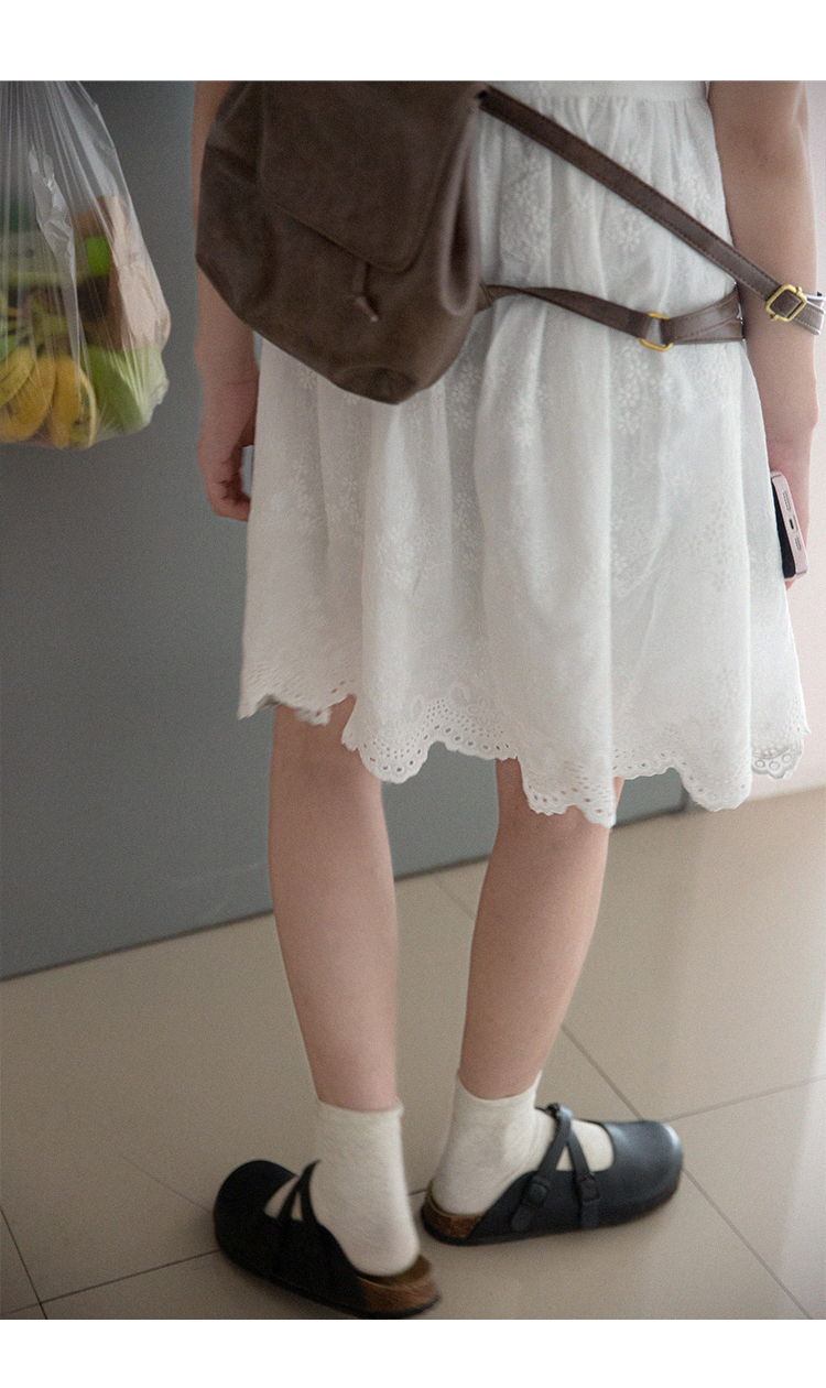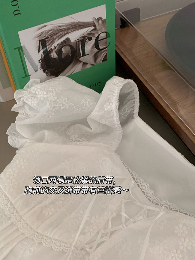 领口和胸线下包围着一圈棉质镂空蕾丝边,
