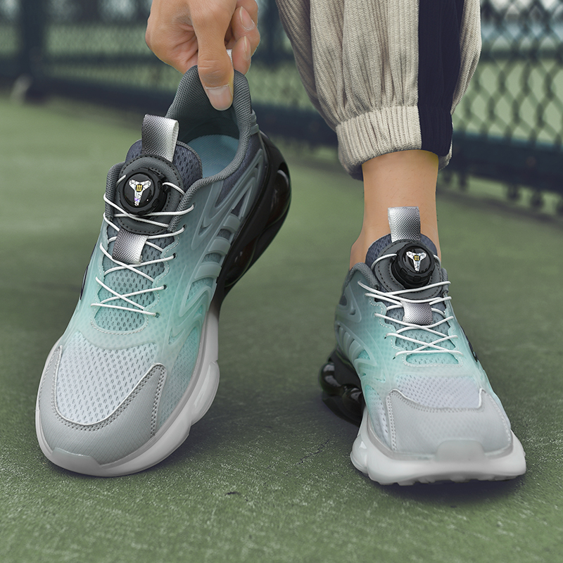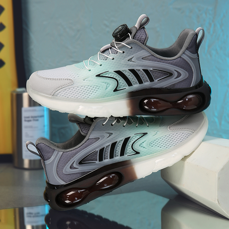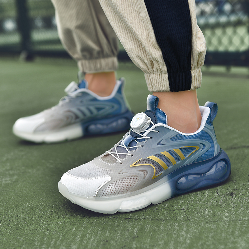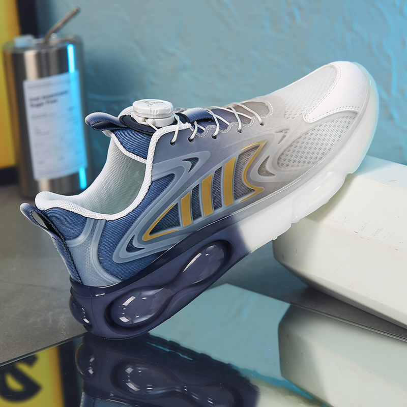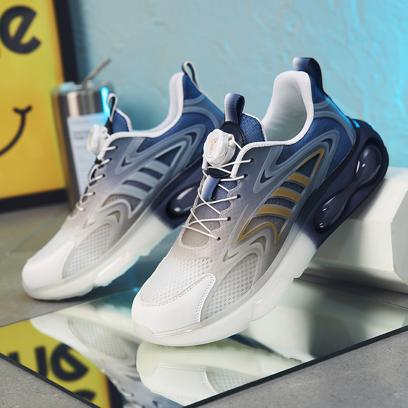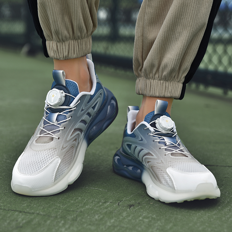 夏季樓空透氣冰絲網面運動鞋男旋轉鈕釦免系鞋帶軟底氣墊跑步鞋子