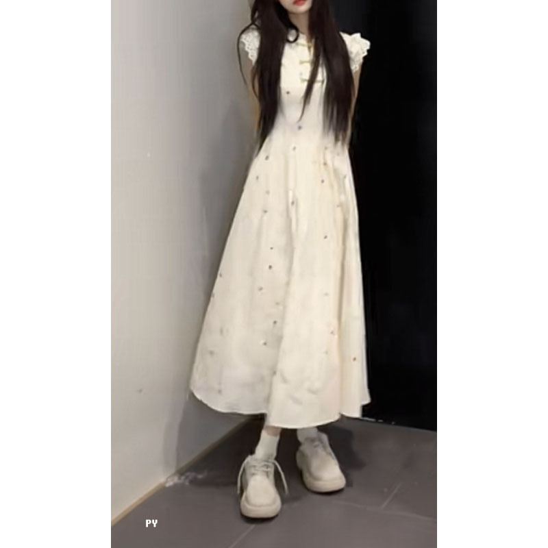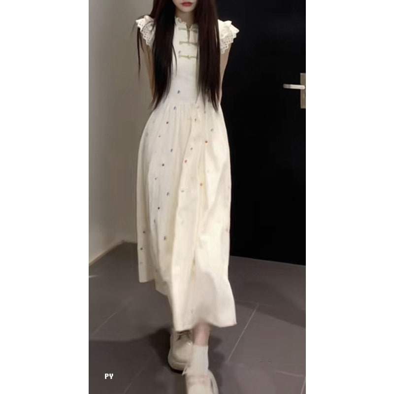 2023夏季新款甜美碎花复古刺绣蕾丝拼接新中式飞袖长裙连衣裙