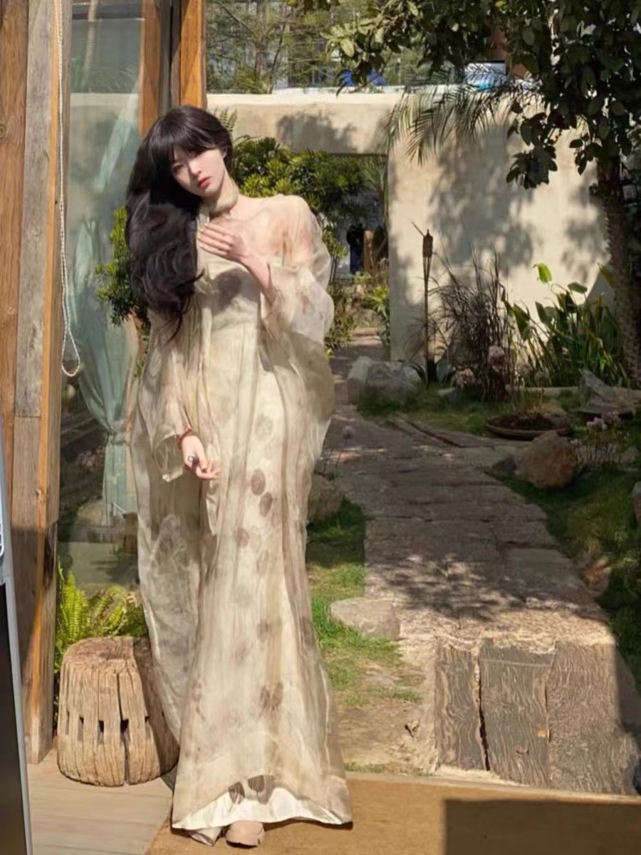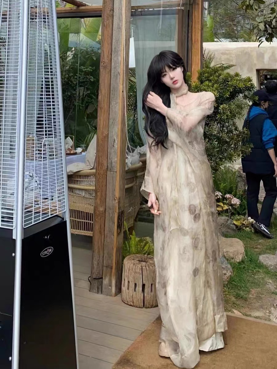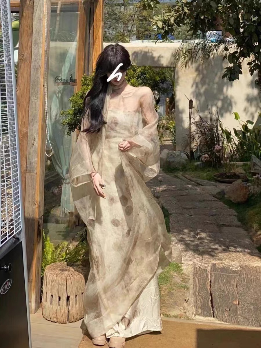 於雯同款網紗拼接溫柔風洋裝別致高級感仙女裙子森系氣質顯瘦收