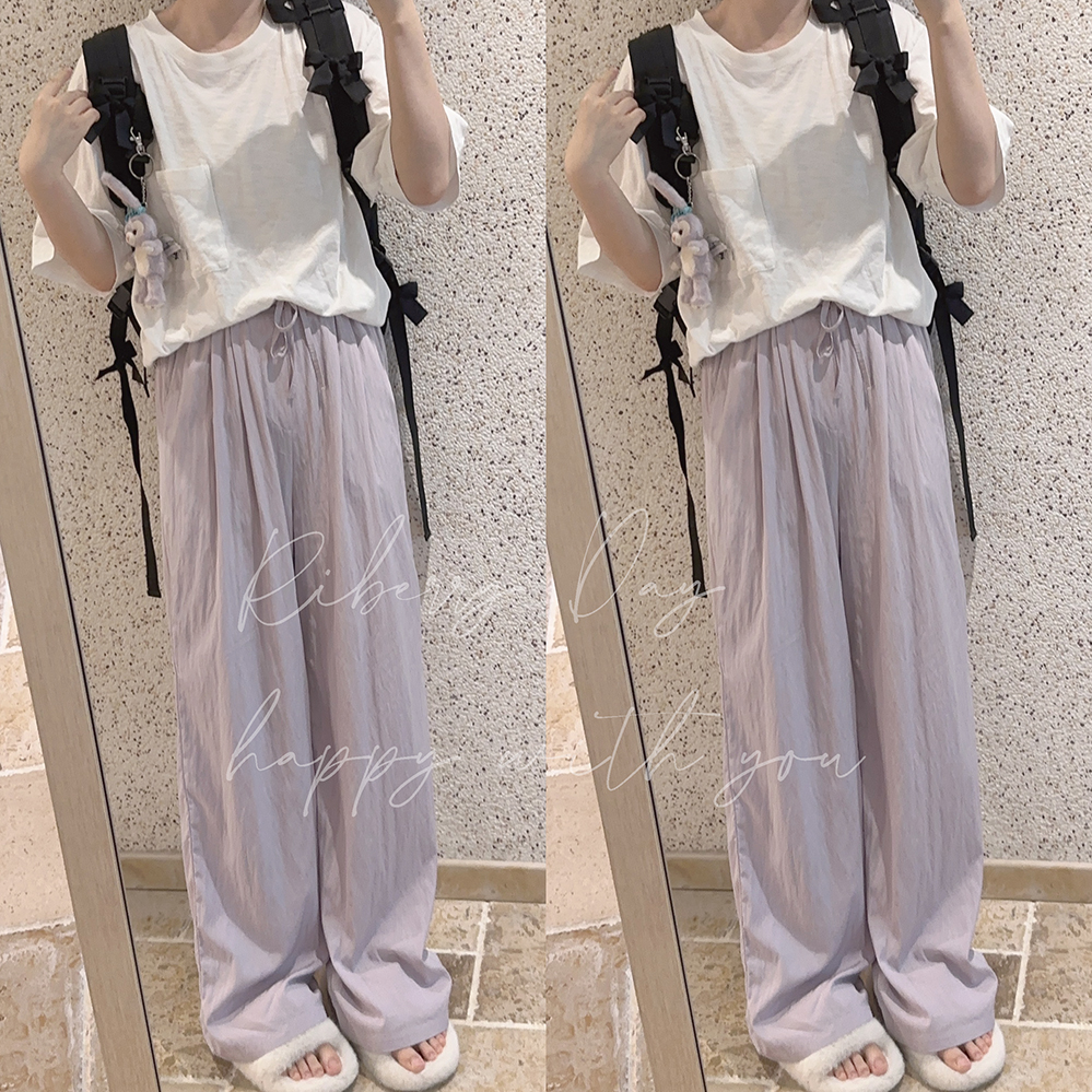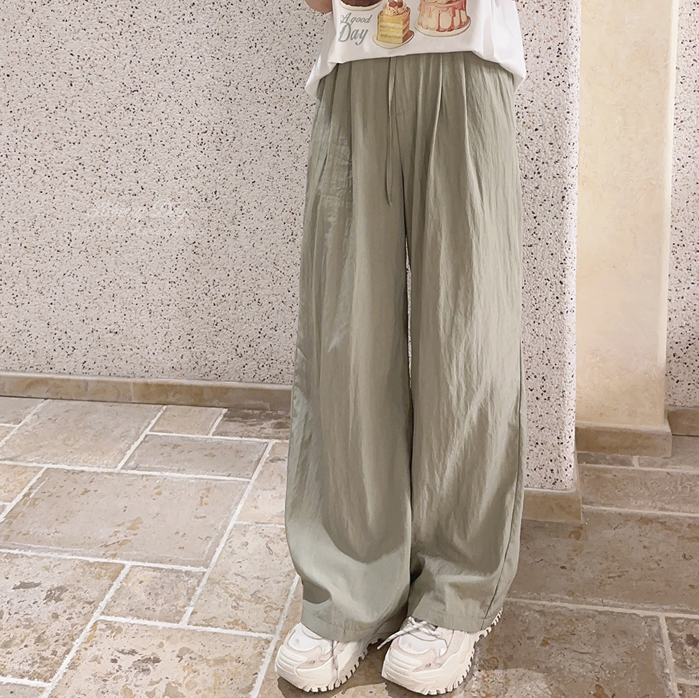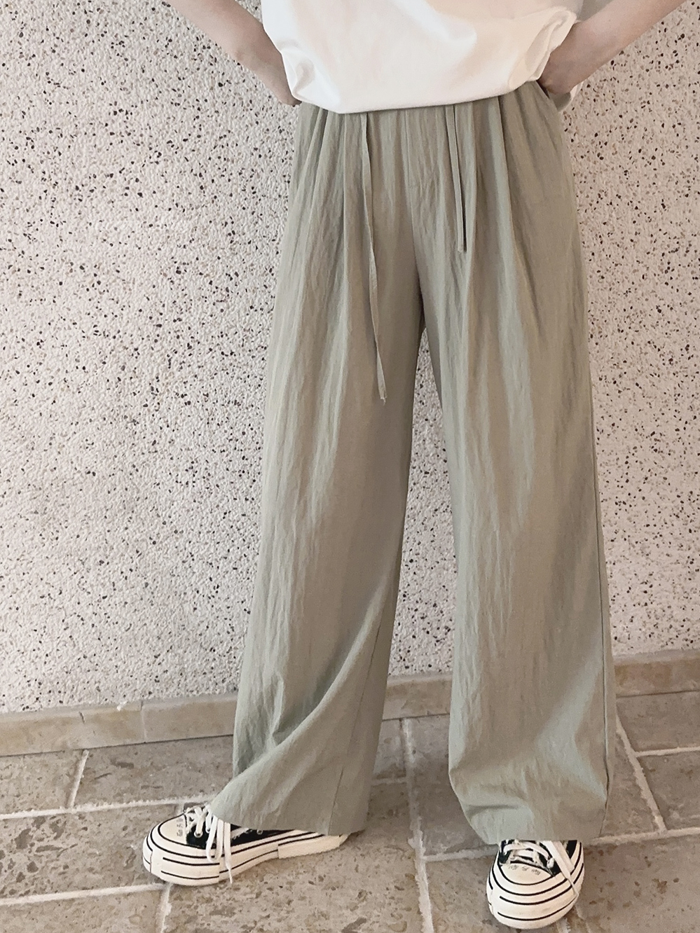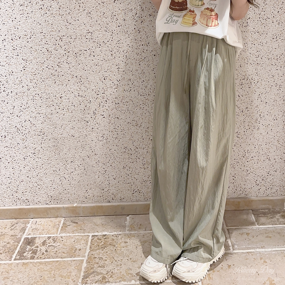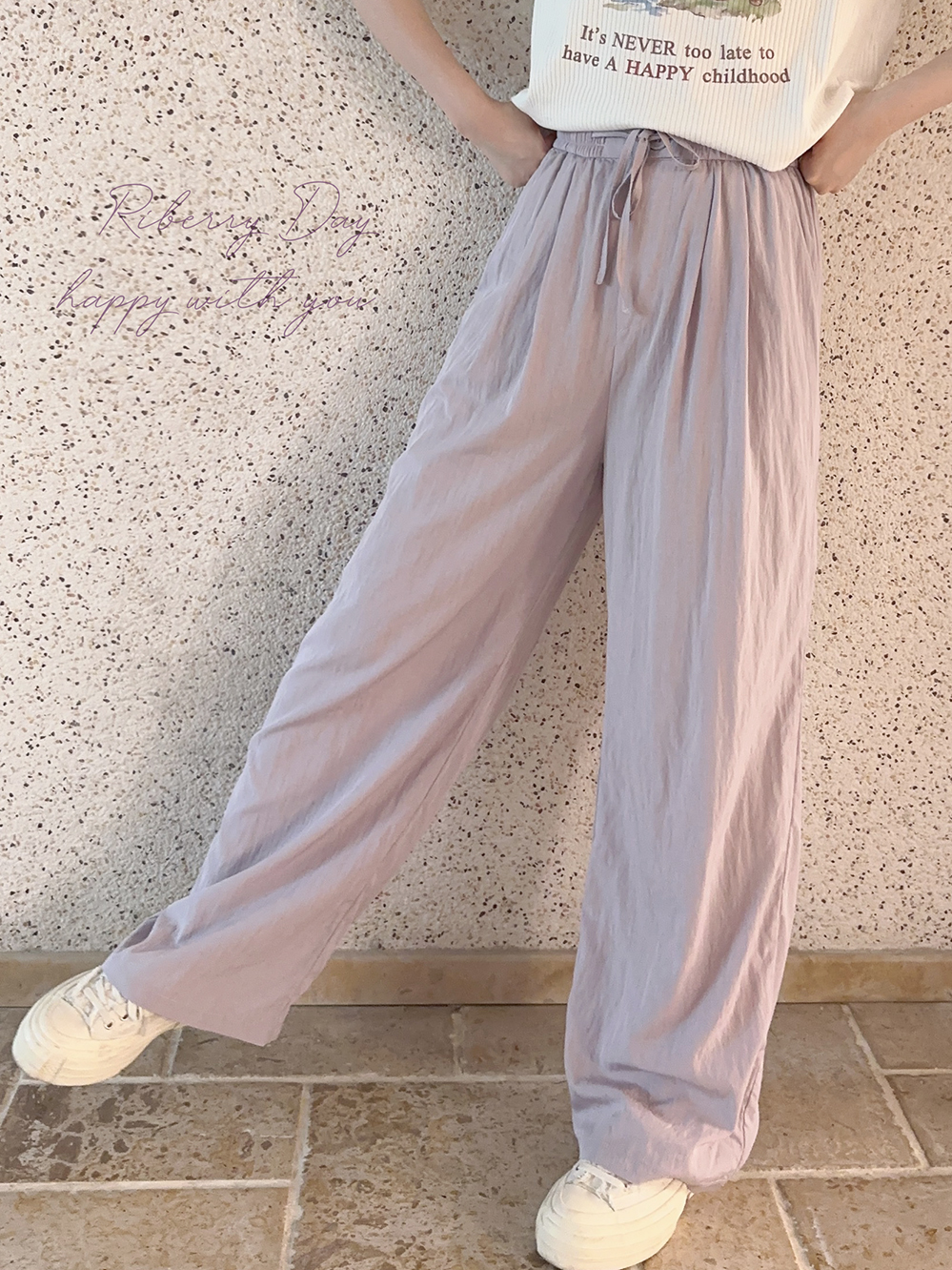 柔軟 輕薄涼快 抽繩鬆緊腰 寬鬆直筒 休閒長褲 夏季女 H